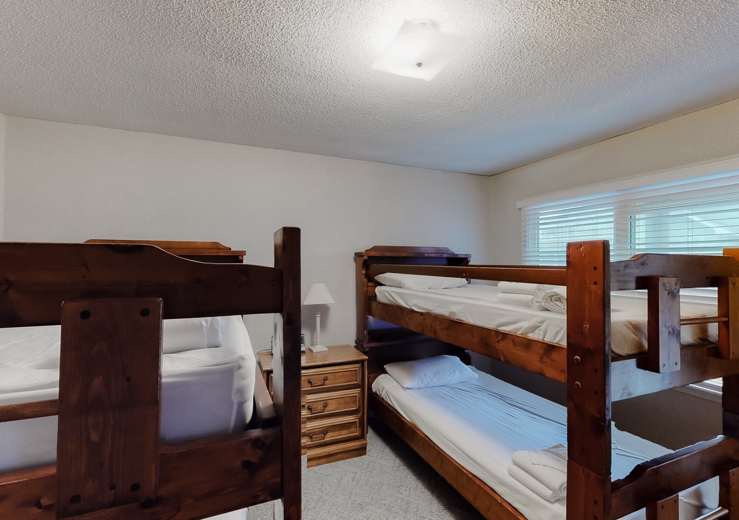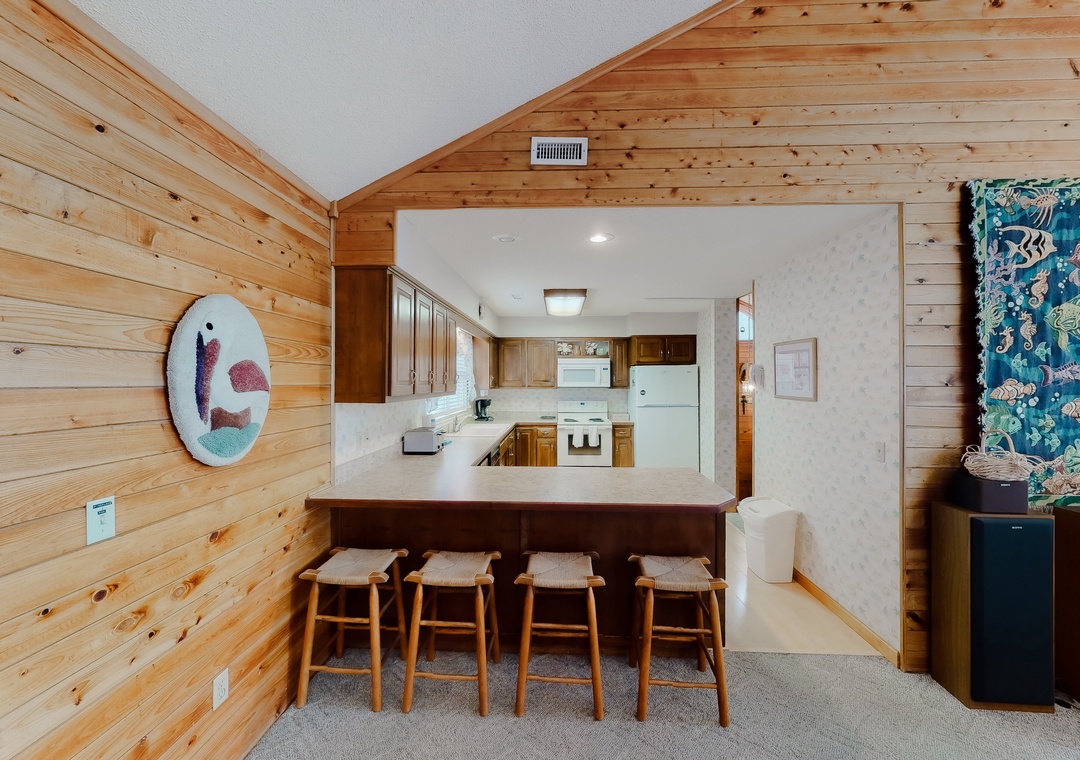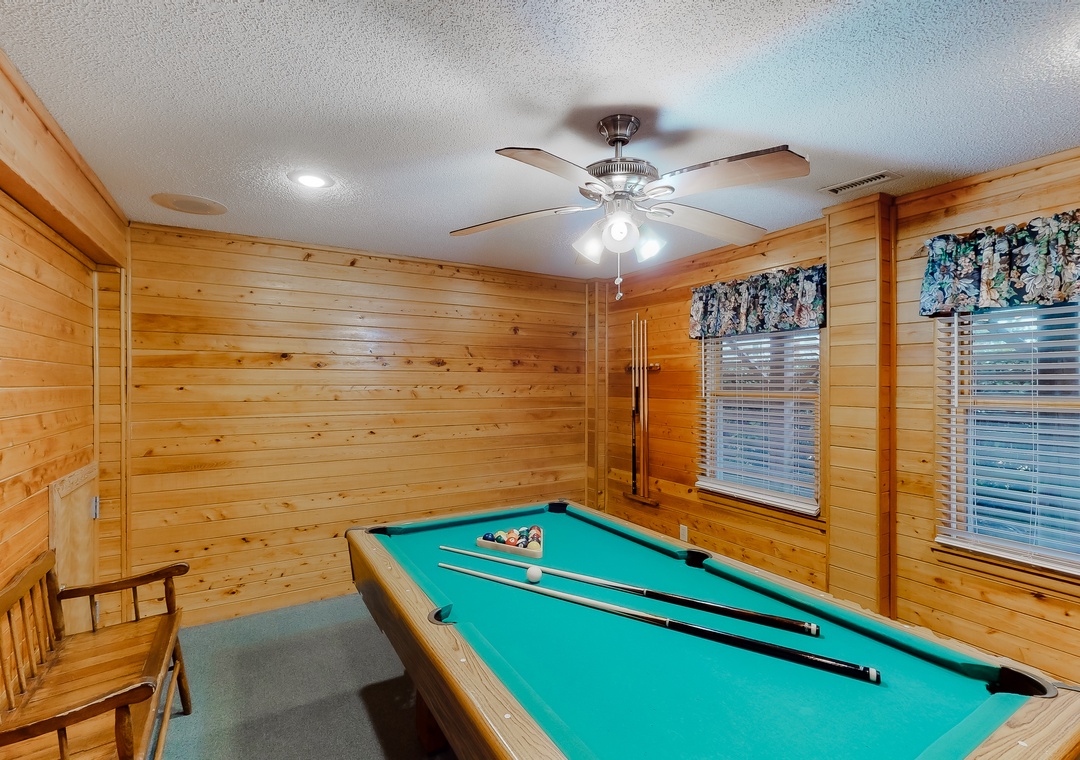 Ground Level: Carport and driveway with parking for 6 vehicles, outside shower, foot shower, Carport entrance to hallway with washer and dryer, Rec room with pool table and wet bar with stereo, 2 Queen primary suites with tub showers and TVs.