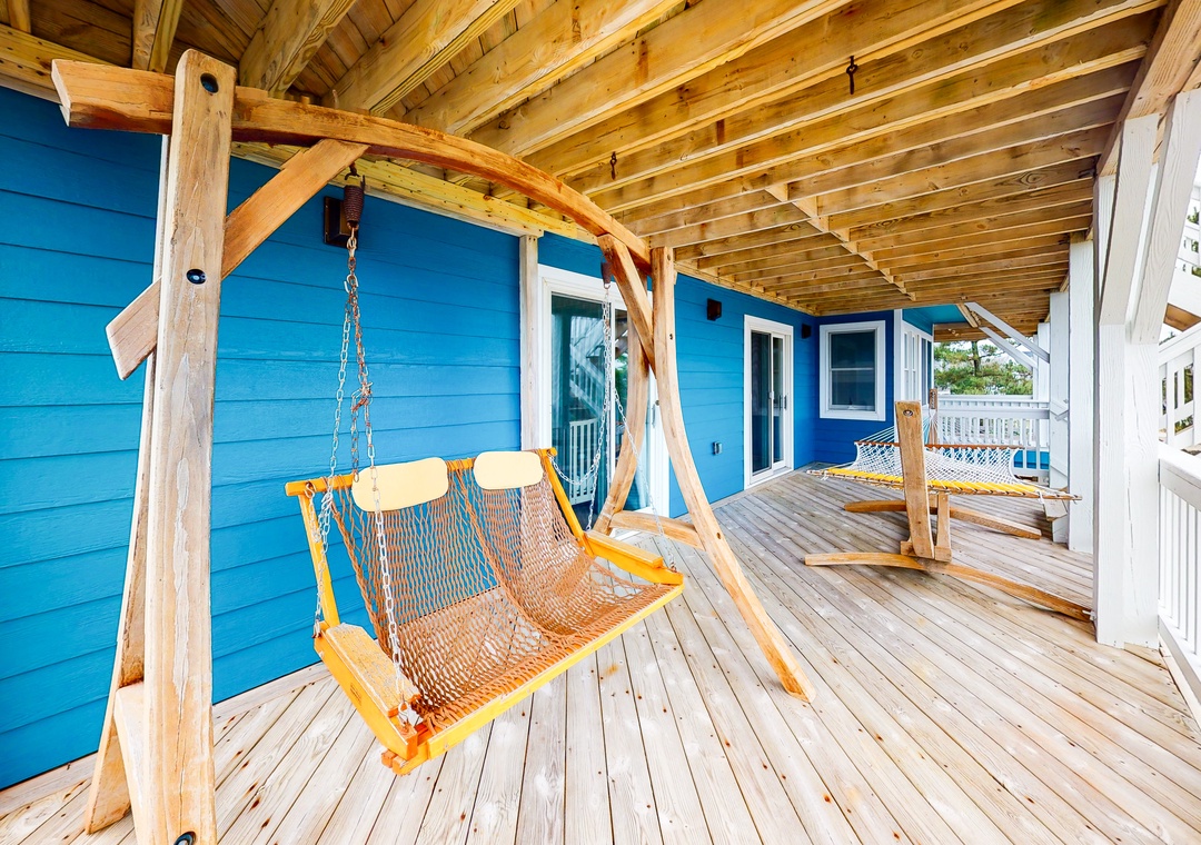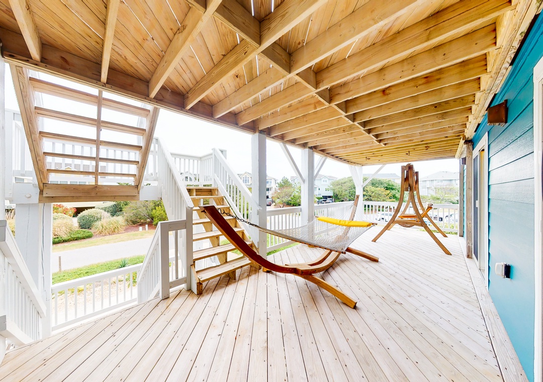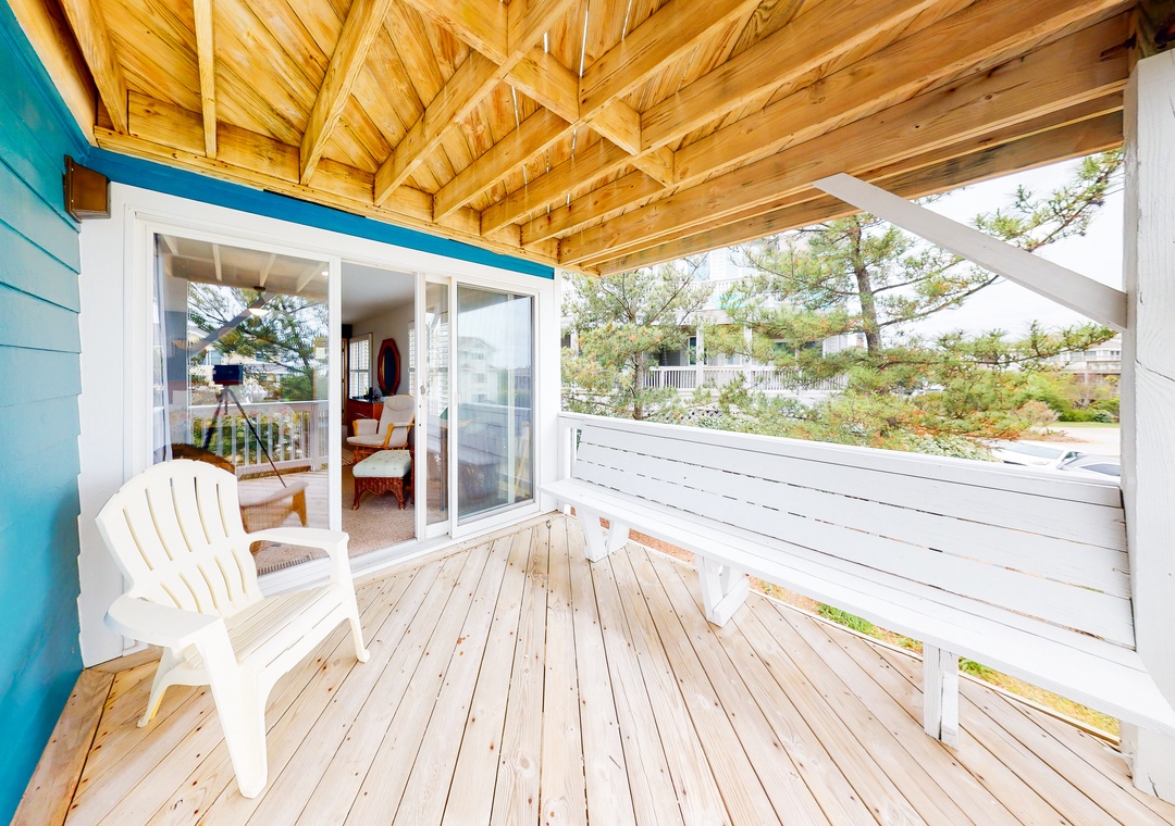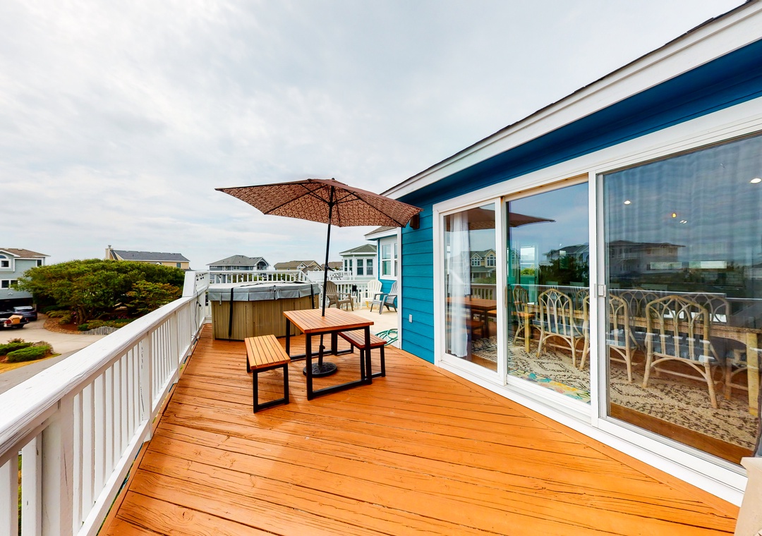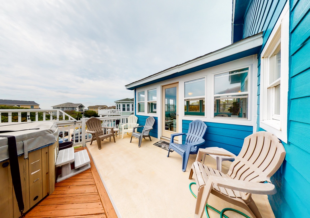 This comfortable and family-friendly home offers lovely ocean views - especially from the hot tub on the top deck (that faces the ocean). This house is located across the street from the beach access walkway and is the perfect place to vacation with your family dog! The private pool offers convenient family fun! The top level has a kitchen, a great room, an enclosed porch with a seven-foot pool table that converts to a Ping-Pong table, a half bath, and a ship's watch. Enjoy the hot tub located on this level's deck. The HOA offers trolley service from Memorial Day to Labor Day.