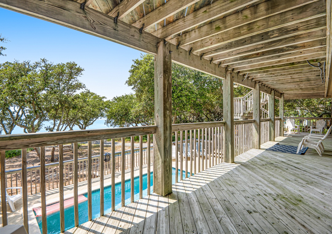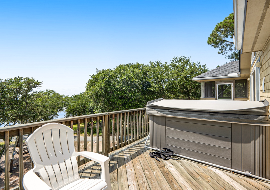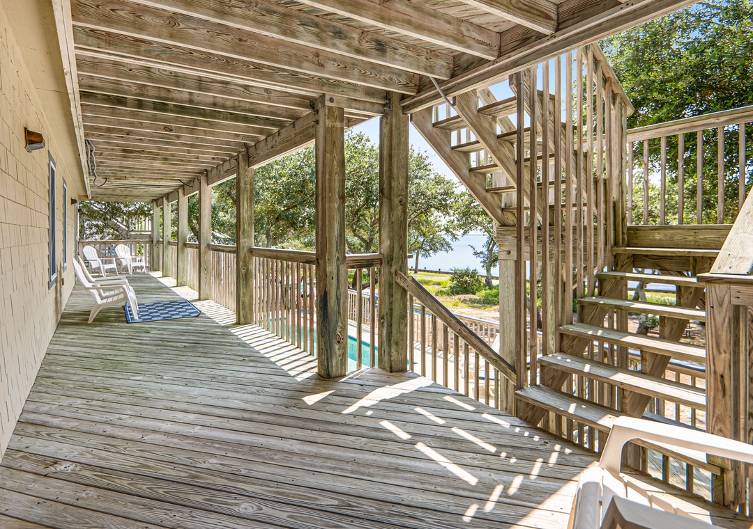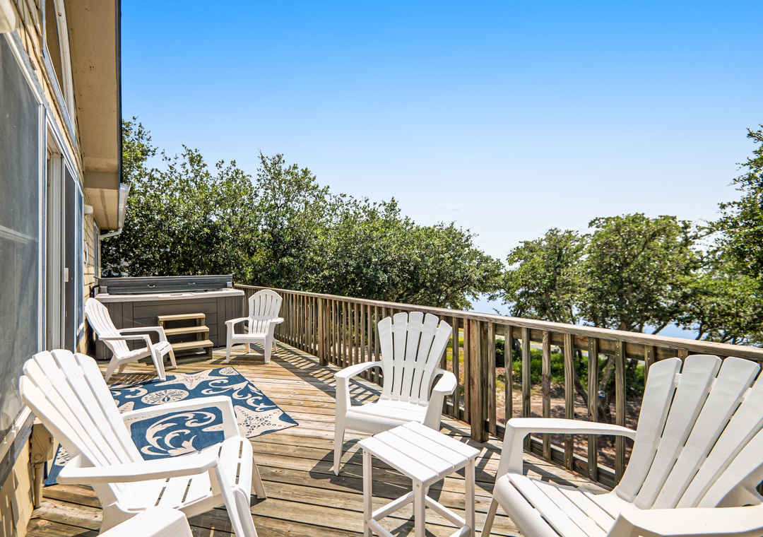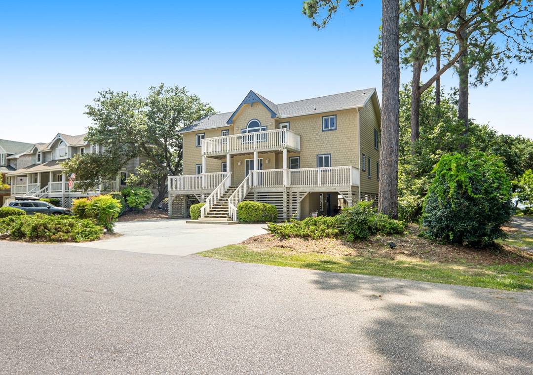 EAST MEETS WEST has everything you need to make your beach day and night perfect in a Sound-front home. Rise and shine with a quiet breakfast on the screened porch followed by a walk along the Currituck Sound. Maybe ride bikes to the Corolla Light shops and pick up some delicious coffee and donuts/breakfast pastries. Or head over to the nearby Sports Center for your morning gym workout. Then hop the trolley, just steps from the house, for a day of sand, sun and seashells. And if beach isn't your thing, take a dip in the private, gated pool and relax on a chaise lounge. After a full day at the beach, retreat home to enjoy fabulous OBX sunsets! How about an evening under the stars soaking in the 30-jet HOT TUB (big enough for 7 adults) on the deck? We also have two levels of west-facing decks that have plenty of deck furniture for reading or snoozing any time of day. Inside on the top level are two dining tables plus kitchen-island seating to easily host large family meals. This home has a cook's kitchen, with stainless steel appliances including two refrigerators (no daily trips to the market needed), all manner of kitchen gadgets. All 5 bedrooms offer a view of the Currituck Sound and each is decorated with a beach theme.