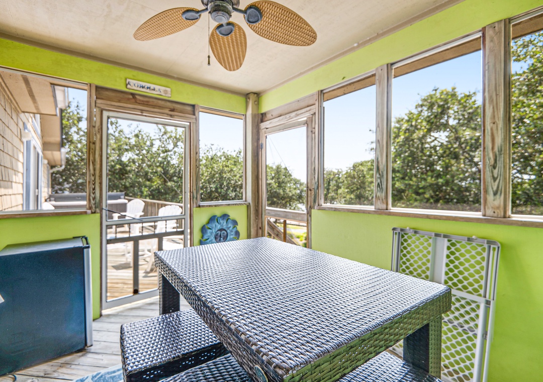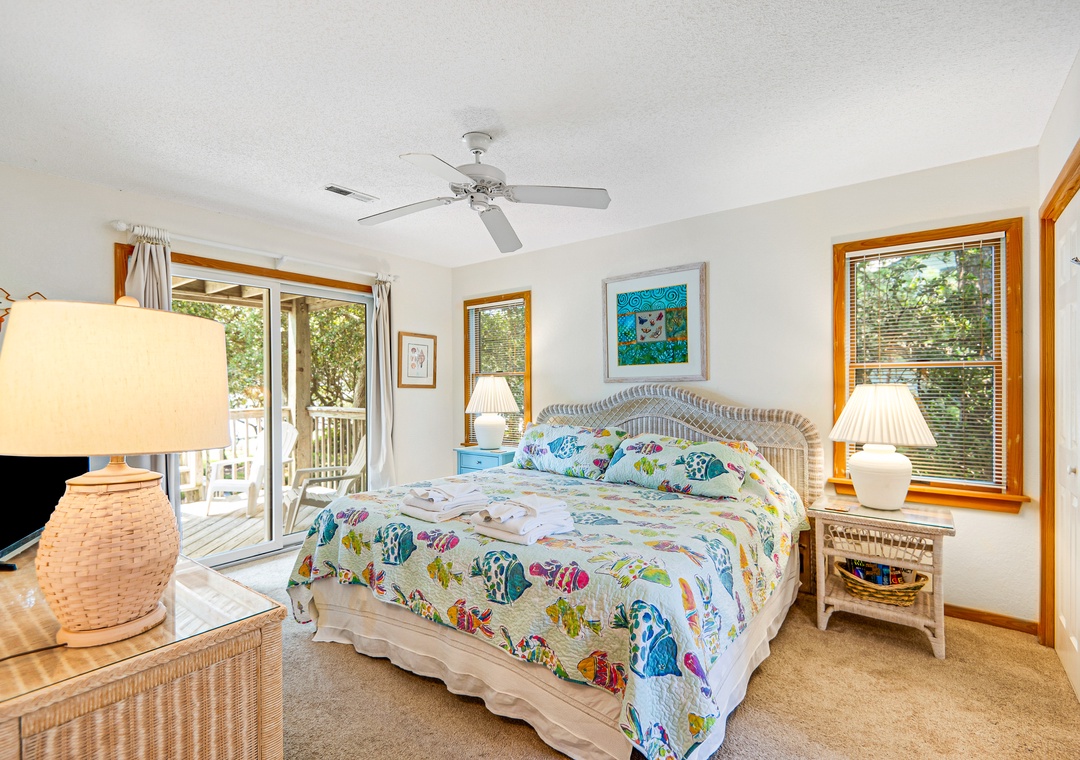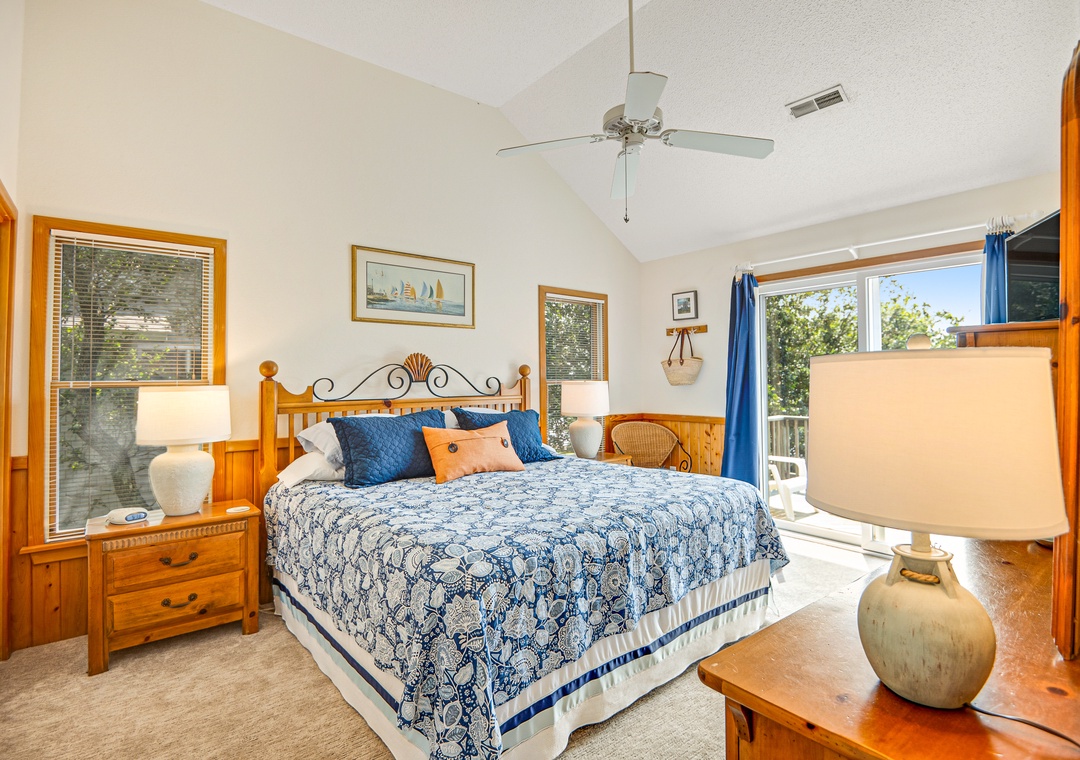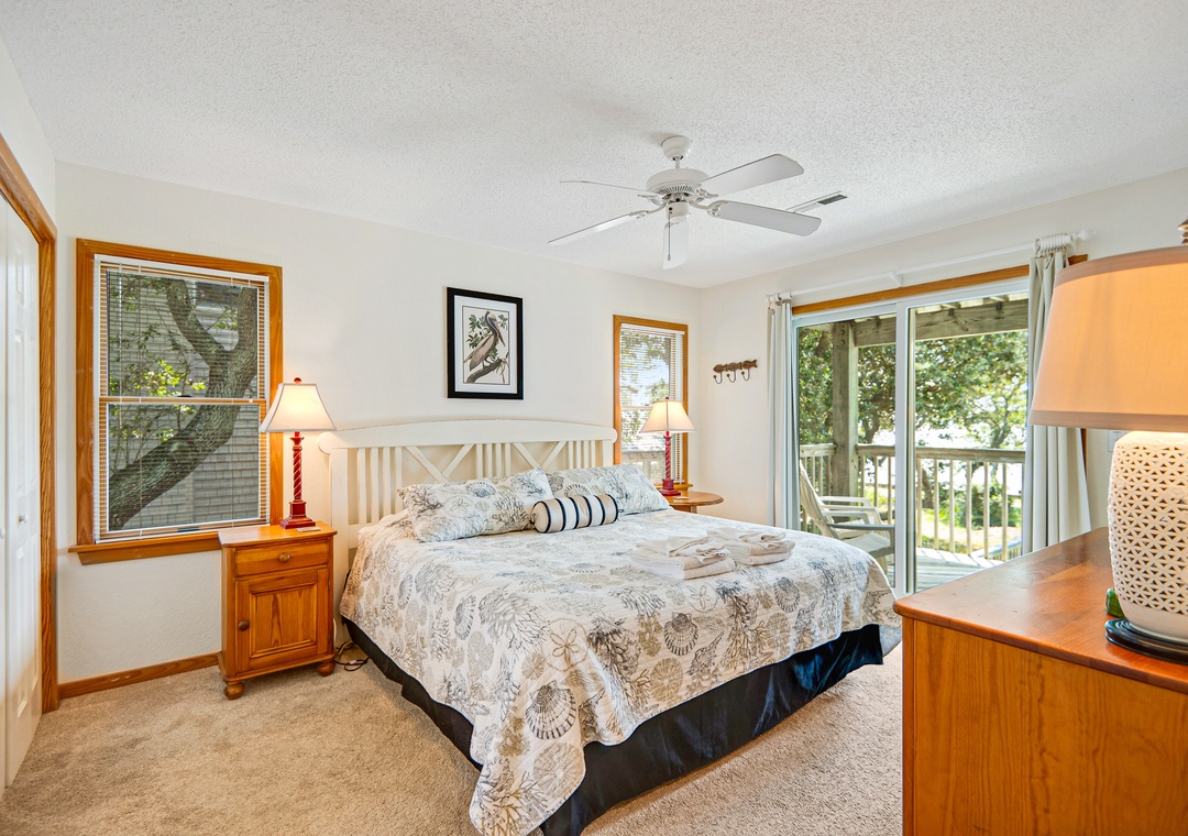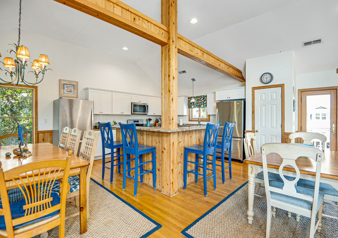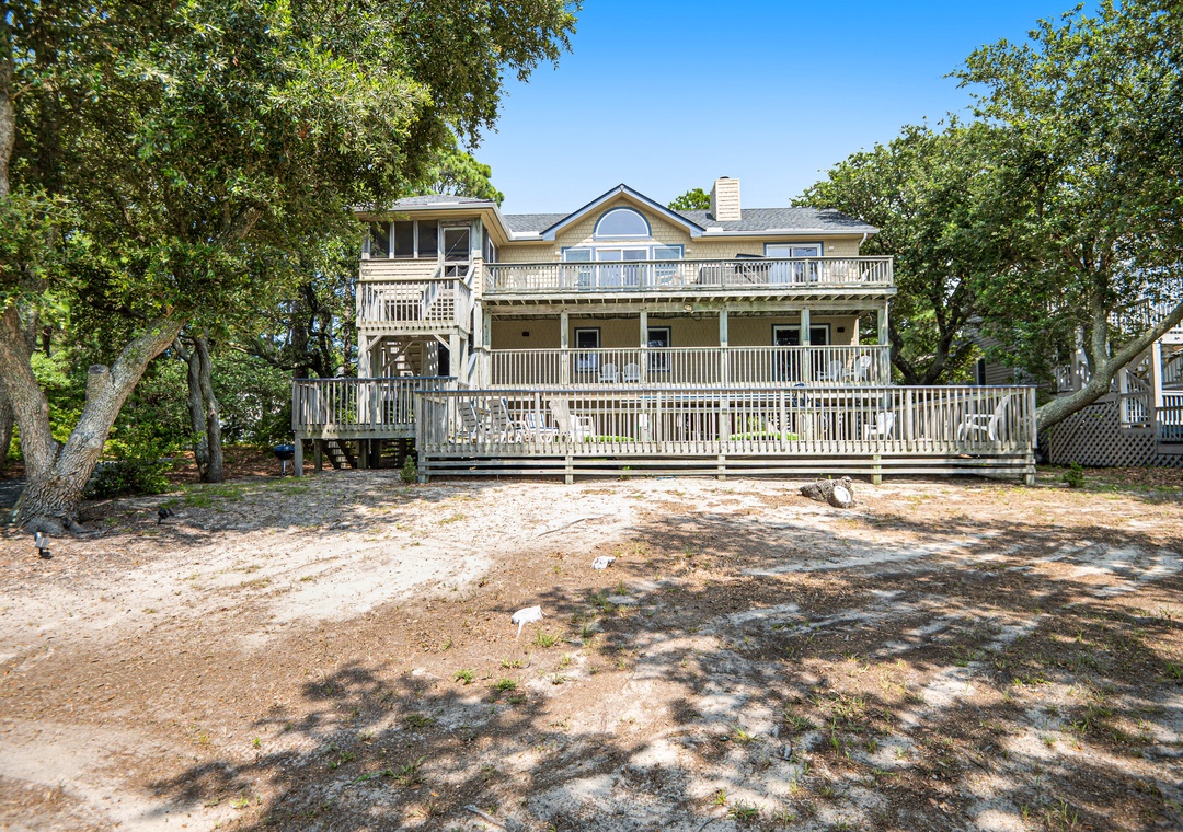EAST MEETS WEST has everything you need to make your beach day and night perfect in a Sound-front home. Rise and shine with a quiet breakfast on the screened porch followed by a walk along the Currituck Sound. Maybe ride bikes to the Corolla Light shops and pick up some delicious coffee and donuts/breakfast pastries. Or head over to the nearby Sports Center for your morning gym workout. Then hop the trolley, just steps from the house, for a day of sand, sun and seashells. And if beach isn't your thing, take a dip in the private, gated pool and relax on a chaise lounge. After a full day at the beach, retreat home to enjoy fabulous OBX sunsets! How about an evening under the stars soaking in the 30-jet HOT TUB (big enough for 7 adults) on the deck? We also have two levels of west-facing decks that have plenty of deck furniture for reading or snoozing any time of day. Inside on the top level are two dining tables plus kitchen-island seating to easily host large family meals. This home has a cook's kitchen, with stainless steel appliances including two refrigerators (no daily trips to the market needed), all manner of kitchen gadgets. All 5 bedrooms offer a view of the Currituck Sound and each is decorated with a beach theme.