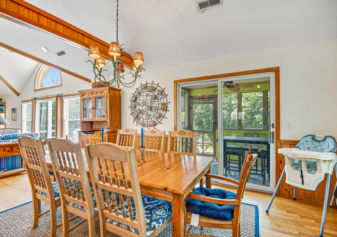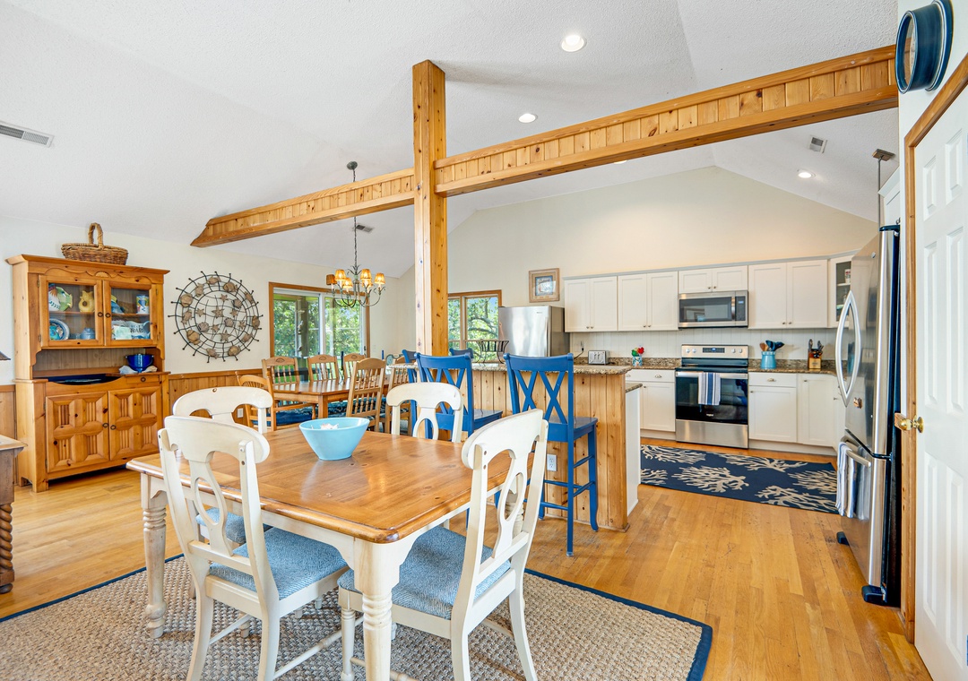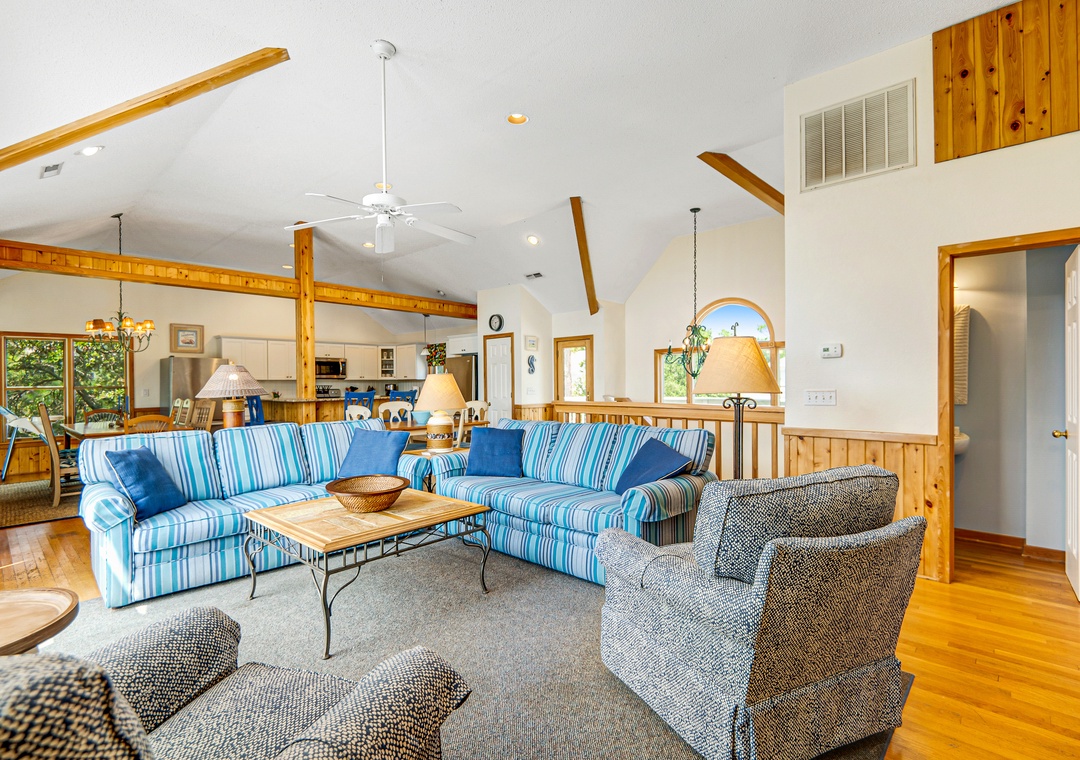 Top Level: Features cathedral ceilings, a wood-burning fireplace, beautiful new wood floors, large Samsung Smart TV with DVD collection, recently reupholstered furnishings, a large kitchen with pantry and eating island, dining and living rooms and a half bath. The King main bedroom suite with TV and private bath is just off the great room. And outside is the hot tub, four Plywood Adirondack chairs and table (perfect for afternoon appetizers) and a screened porch with counter height table and stools.