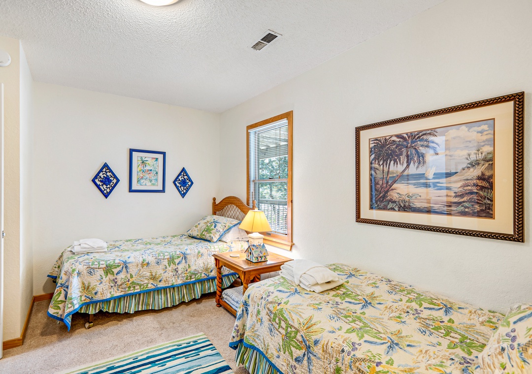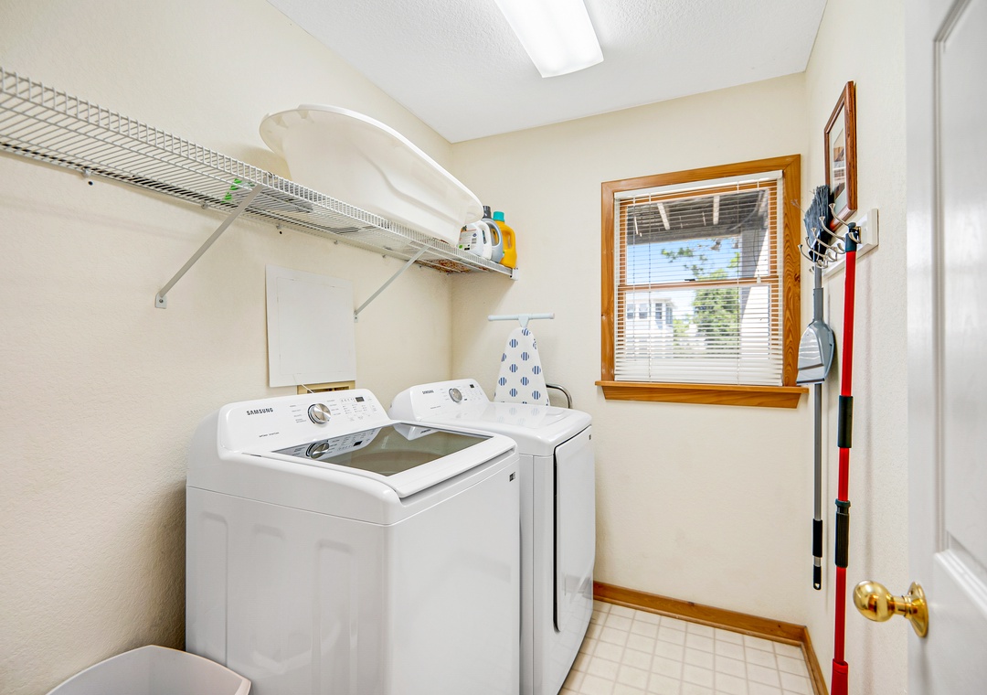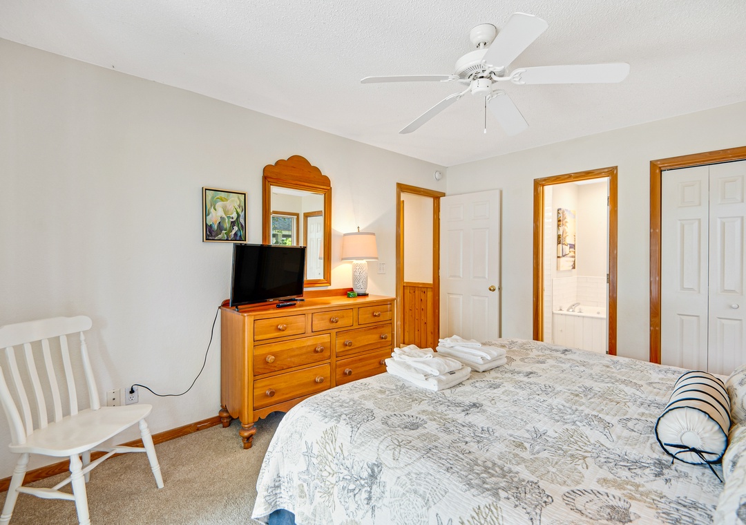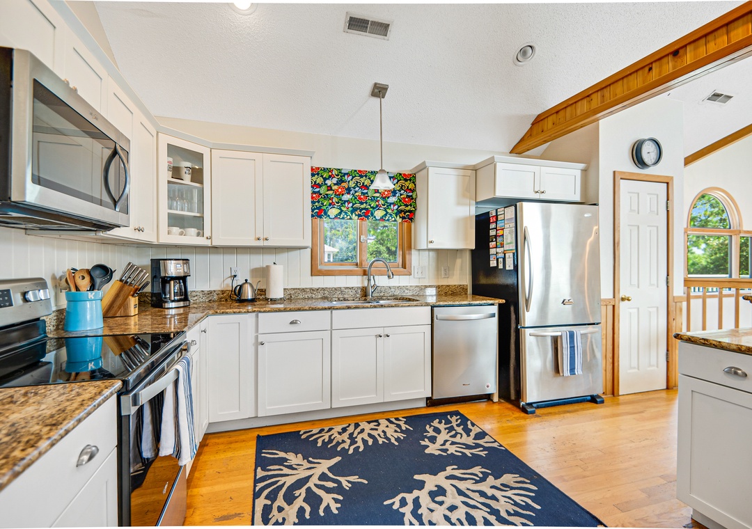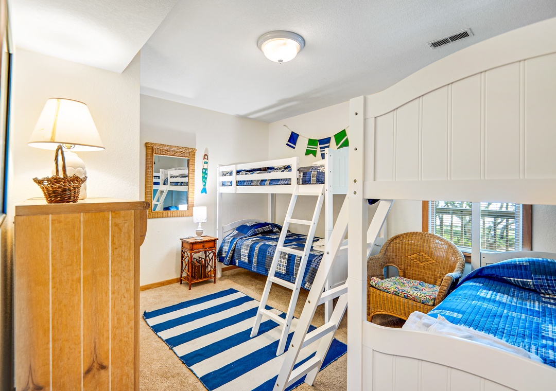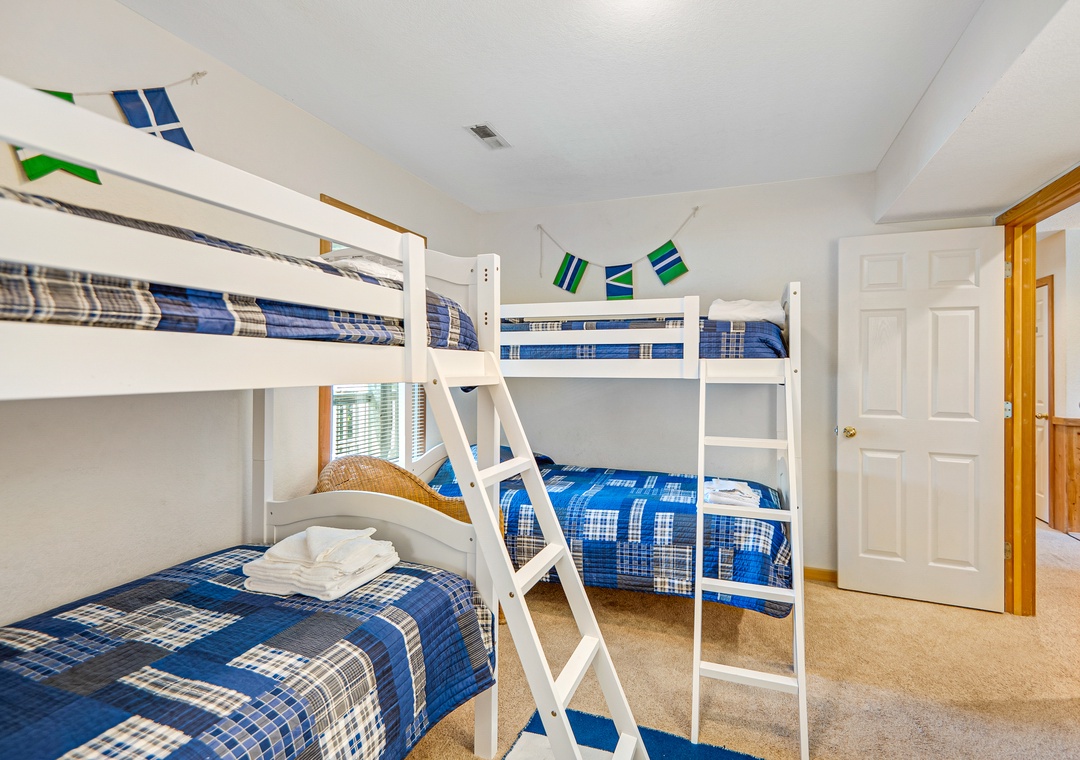 Mid Level: Has 2 King bedrooms with TVs and renovated private baths (one bath with whirlpool tub and one with a giant shower), a bedroom with 2 Bunk Sets, a bedroom with 2 Singles, a renovated full bath with tub for cleaning those little ones, and a roomy laundry room with large-capacity washer/dryer. The west deck is accessible from the primary bedrooms and has plenty of deck seating for sipping your favorite beverage.