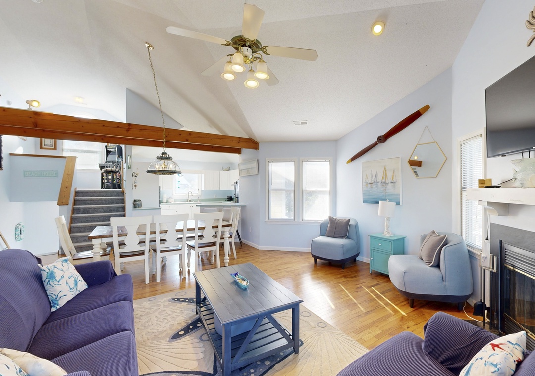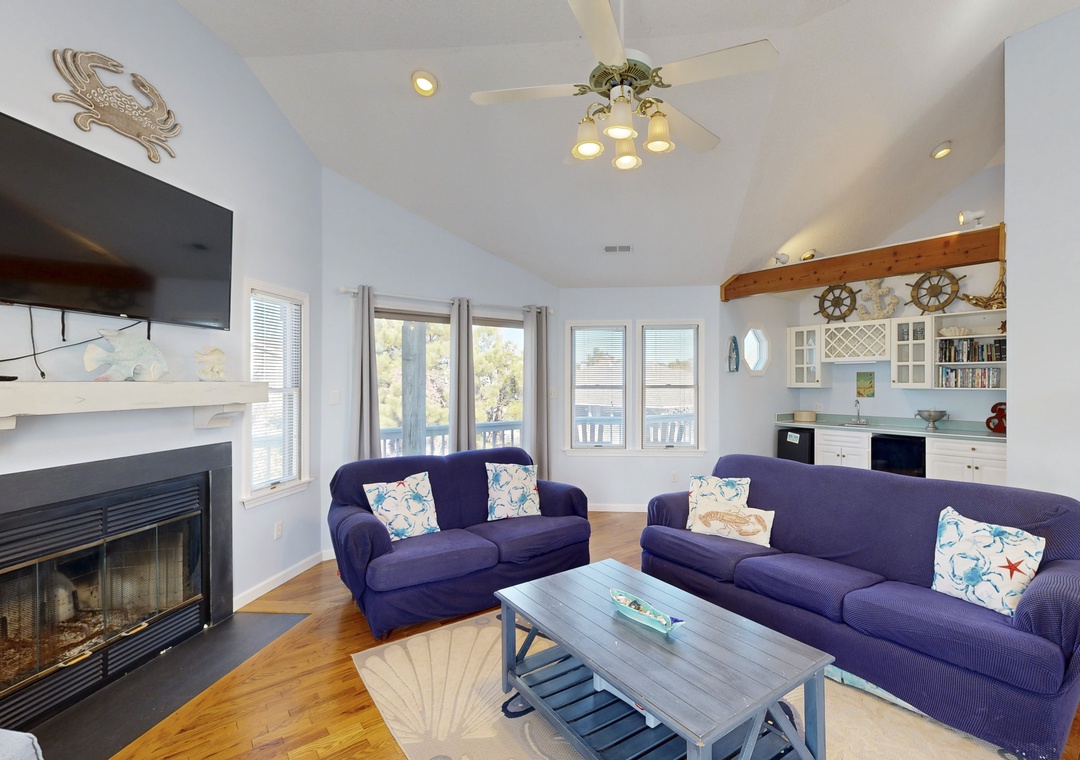 The open-concept living area is designed for togetherness, featuring a well-stocked kitchen, dining space, and a wet bar—perfect for mixing up cocktails or morning coffee (yes, there’s a Keurig!). Cozy up by the wood-burning fireplace (winter only) or host a family movie night with the smart TV, cable, and a selection of DVDs.