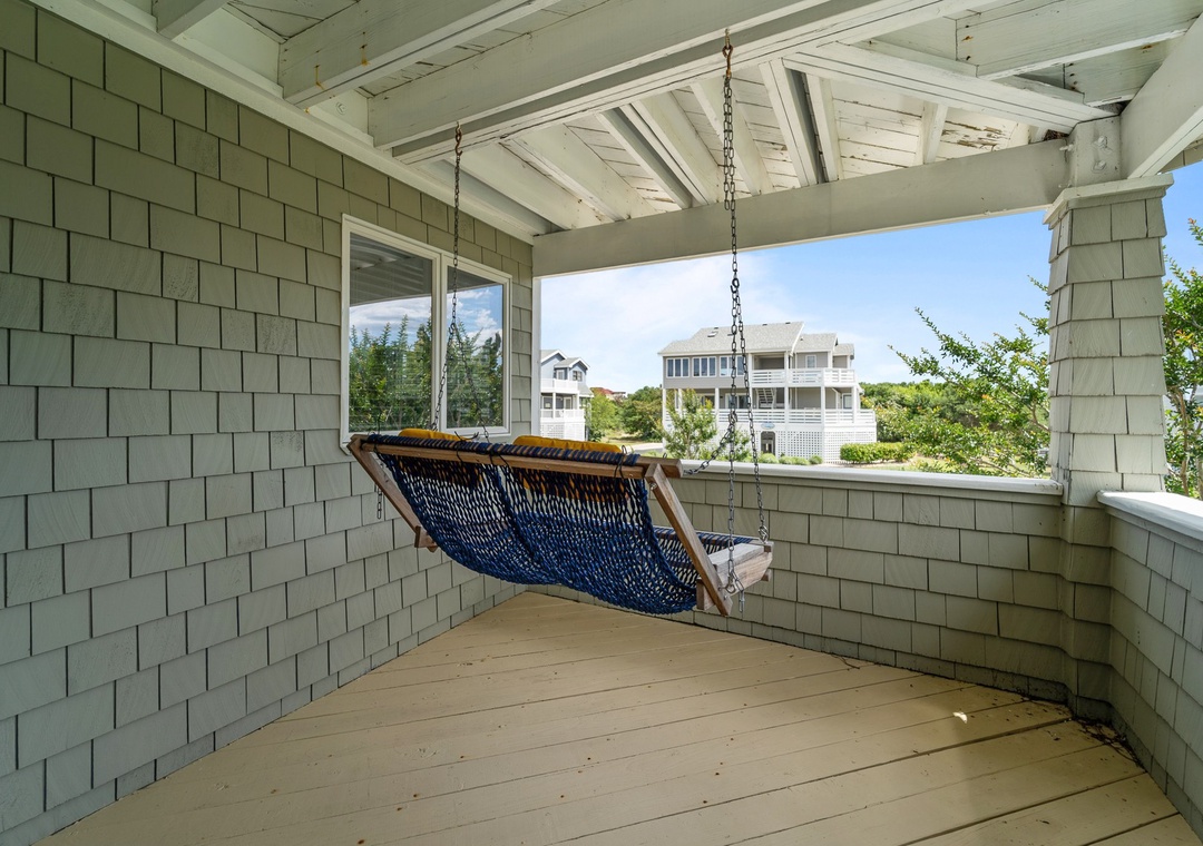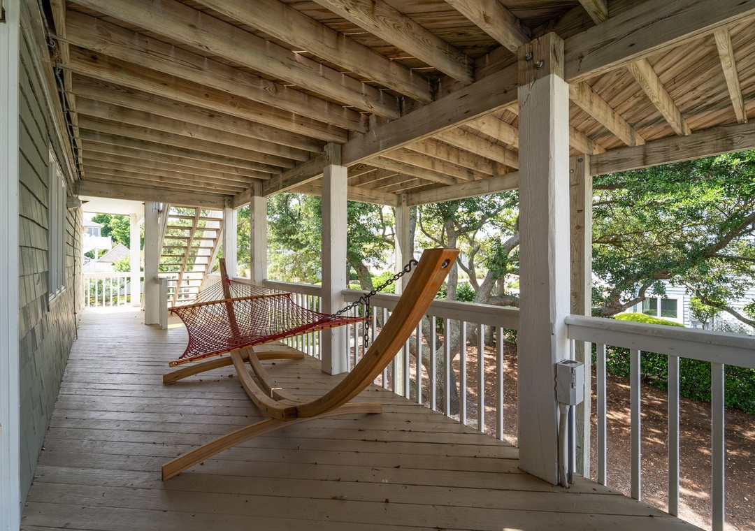 * Mid-level deck featuring a hot tub and hammock swing.