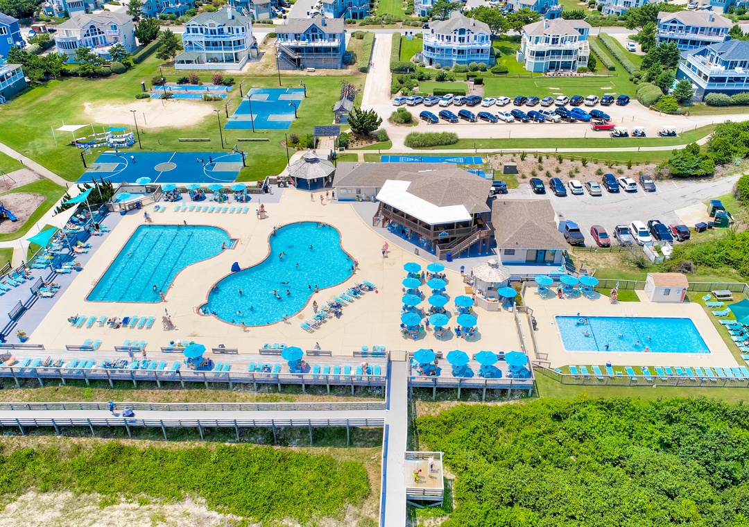 Guests have access to the Corolla Light Recreational Amenities. Guests are instructed to pick up their resort information and amenity bracelets on the first day of their reservation at the Corolla Light Sports Center located at 1026 Ocean Trail Corolla, NC 27927. Your check in time is not until 4:00 PM but you can take advantage of the resort amenities as soon as you retrieve your information from the Sports center, as early as 9 am on your scheduled check-in day.