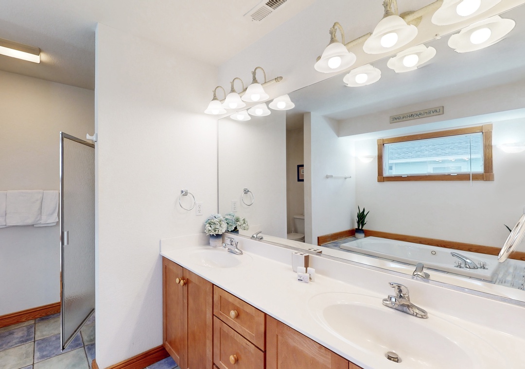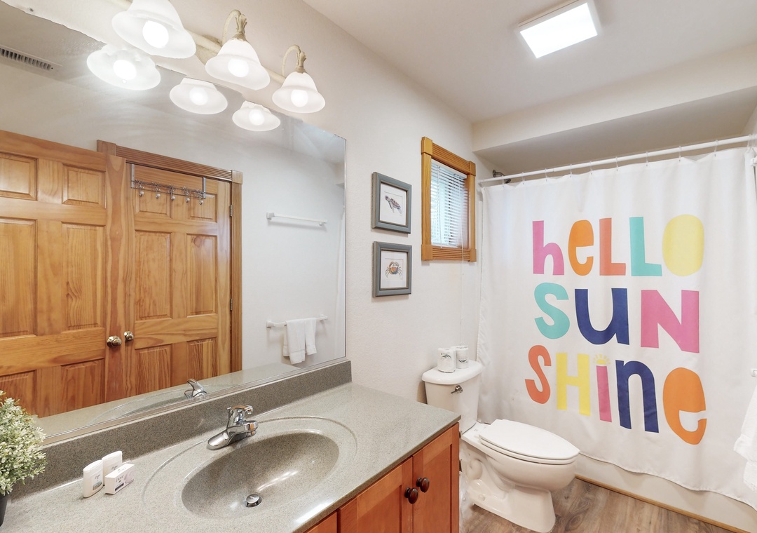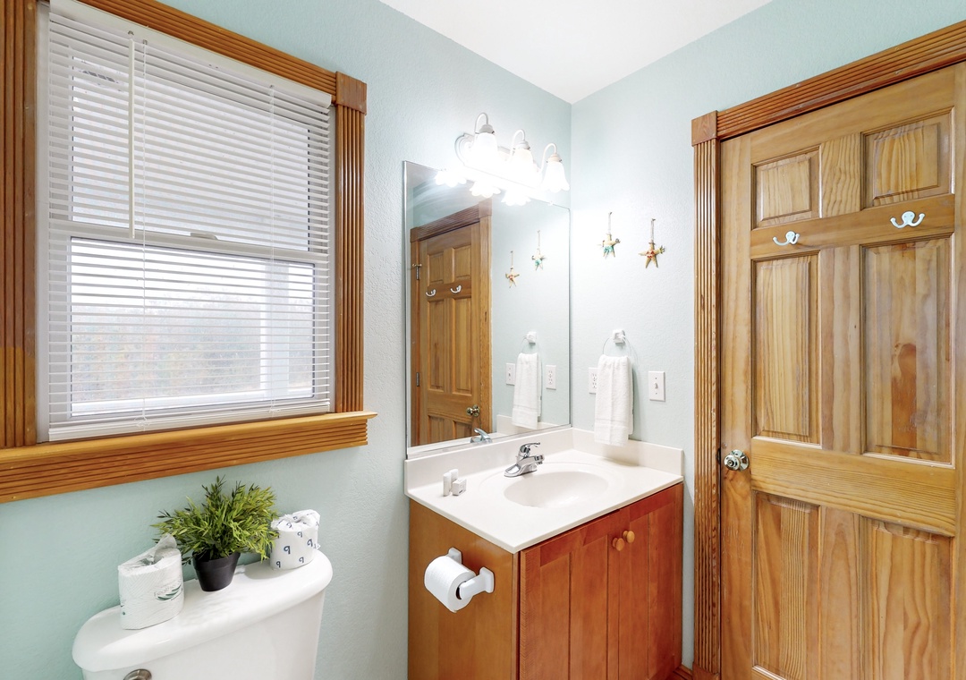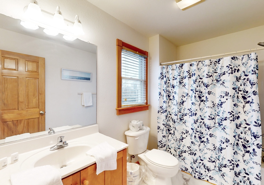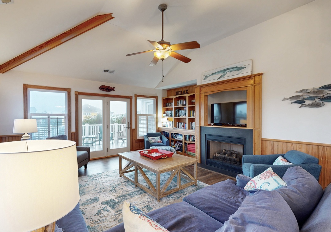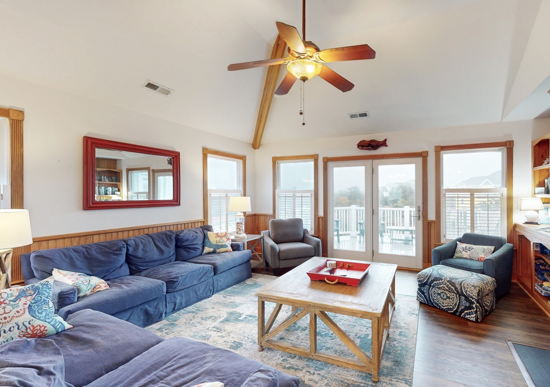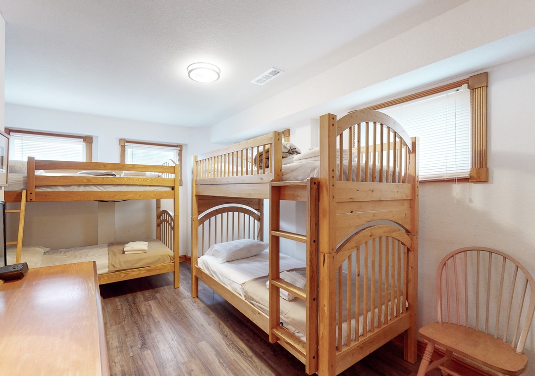 The ground floor features a day bed with trundle, a small fridge, a flatscreen TV, and a bath with a shower/tub combo shared with a room with two bunks. The second floor offers one king and one queen, both with deck access, which are connected by a shared full bathroom with shower/tub combo, and each has a TV. The additional queen bedroom is complete with deck access, 32-inch smart TV, and an ensuite full bath. Head up to the third floor, where you will find the kitchen, dining area, living room, deck access, and the main suite boasting a king bed and an ensuite bathroom with a soaker tub and shower stall.