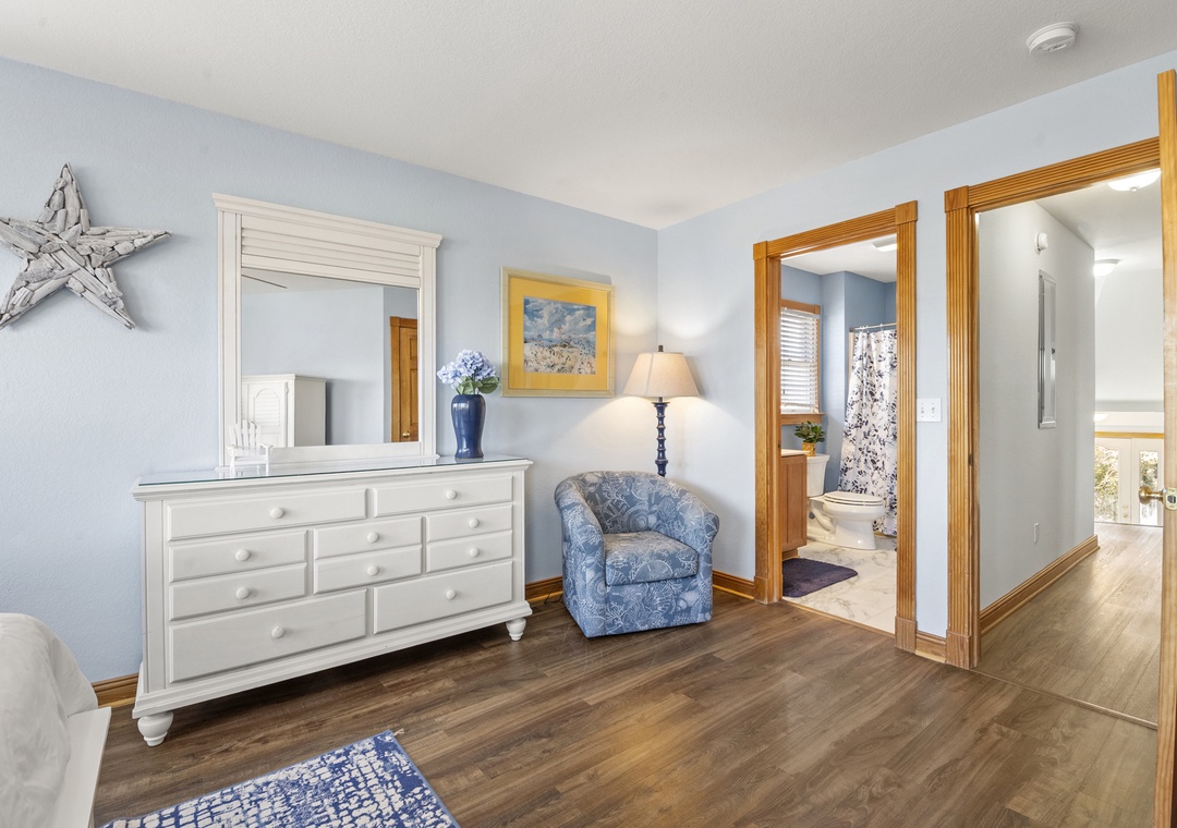 The second floor offers a king bedroom and a queen bedroom, both with deck access and TVs, connected by a shared full bath with a shower/tub combo. An additional queen bedroom on this level features its own ensuite full bath, 32-inch smart TV, and private deck access, giving couples or grandparents a comfortable retreat of their own.