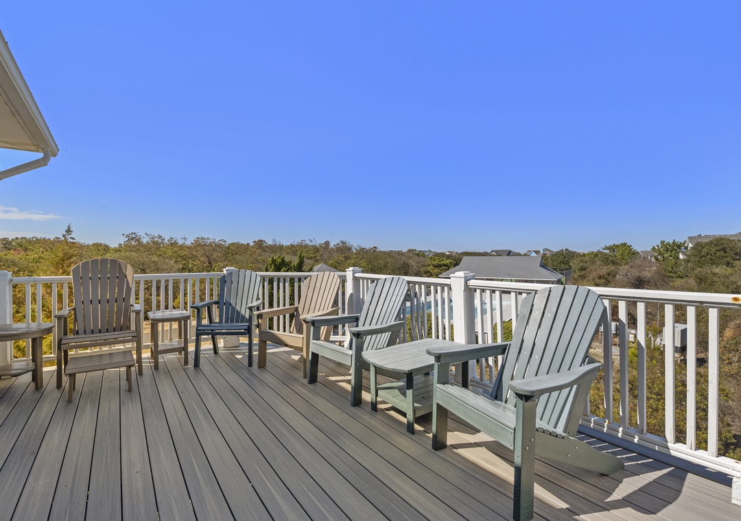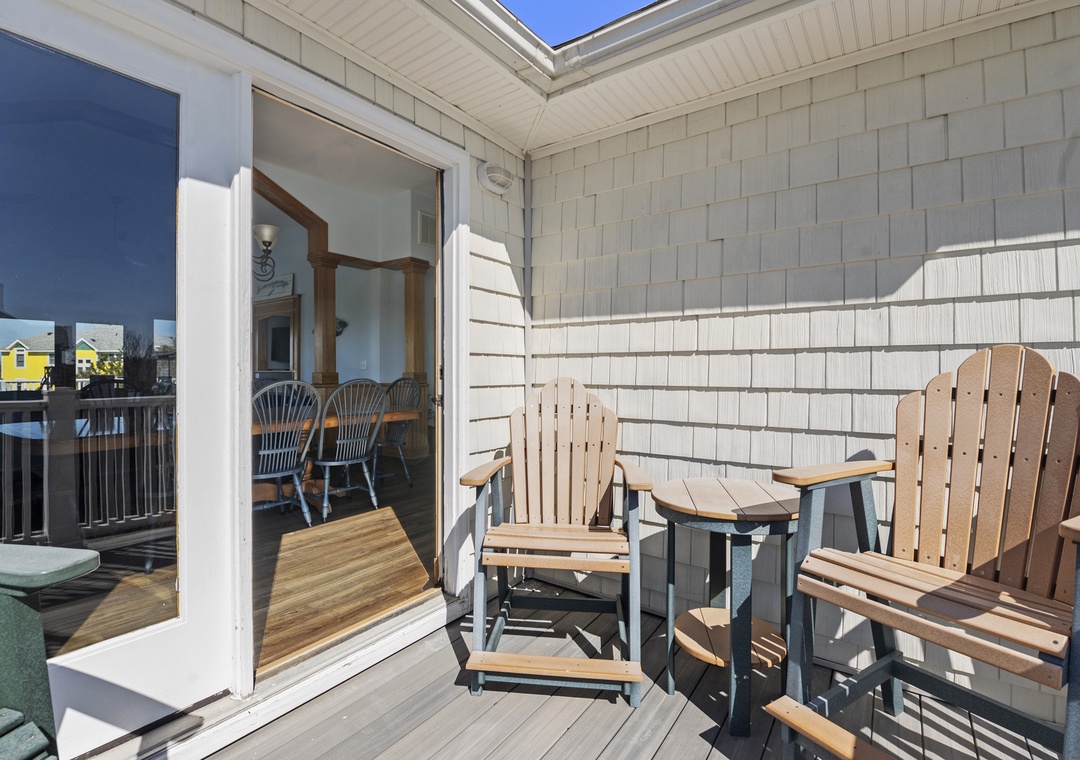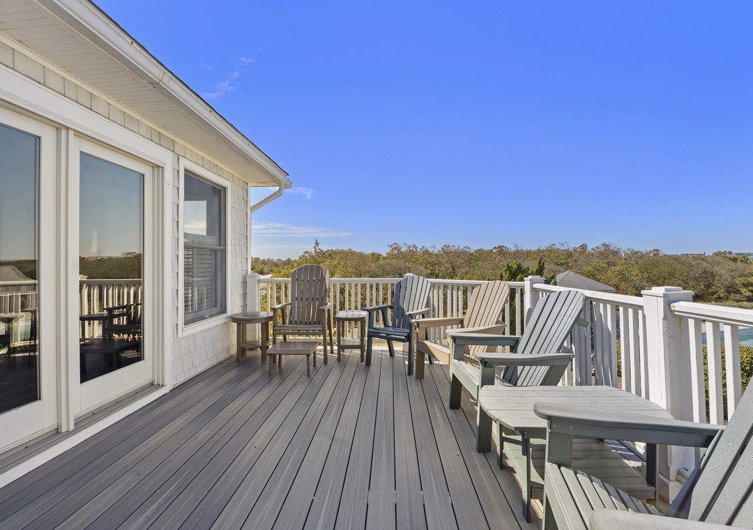 Gather on the top level in a bright great room with vaulted ceilings, comfortable seating, and plenty of windows that bring in natural light and views. Sliding doors lead to the spacious sun deck, ideal for morning coffee, afternoon reading, or evening cocktails under the Carolina sky.