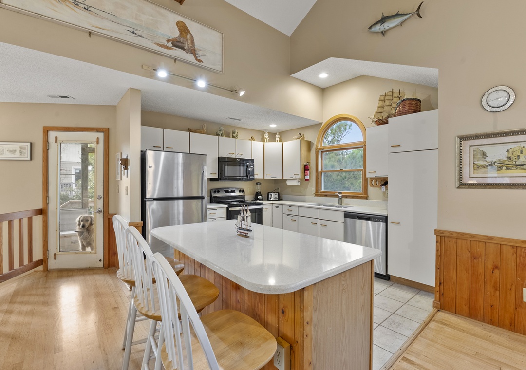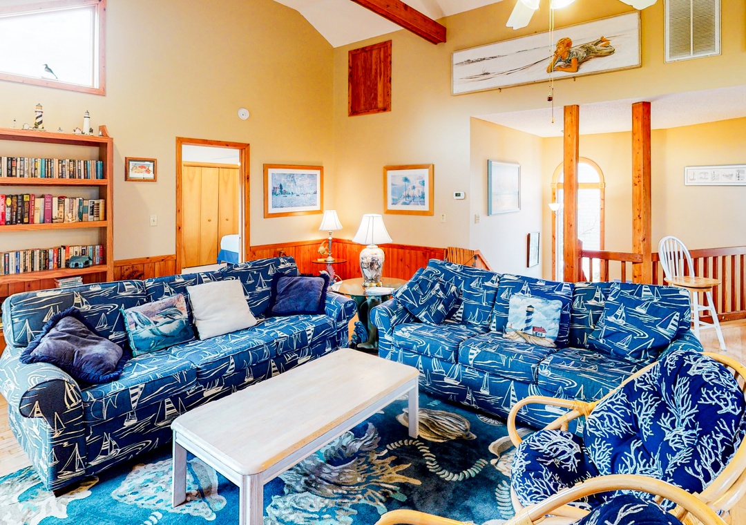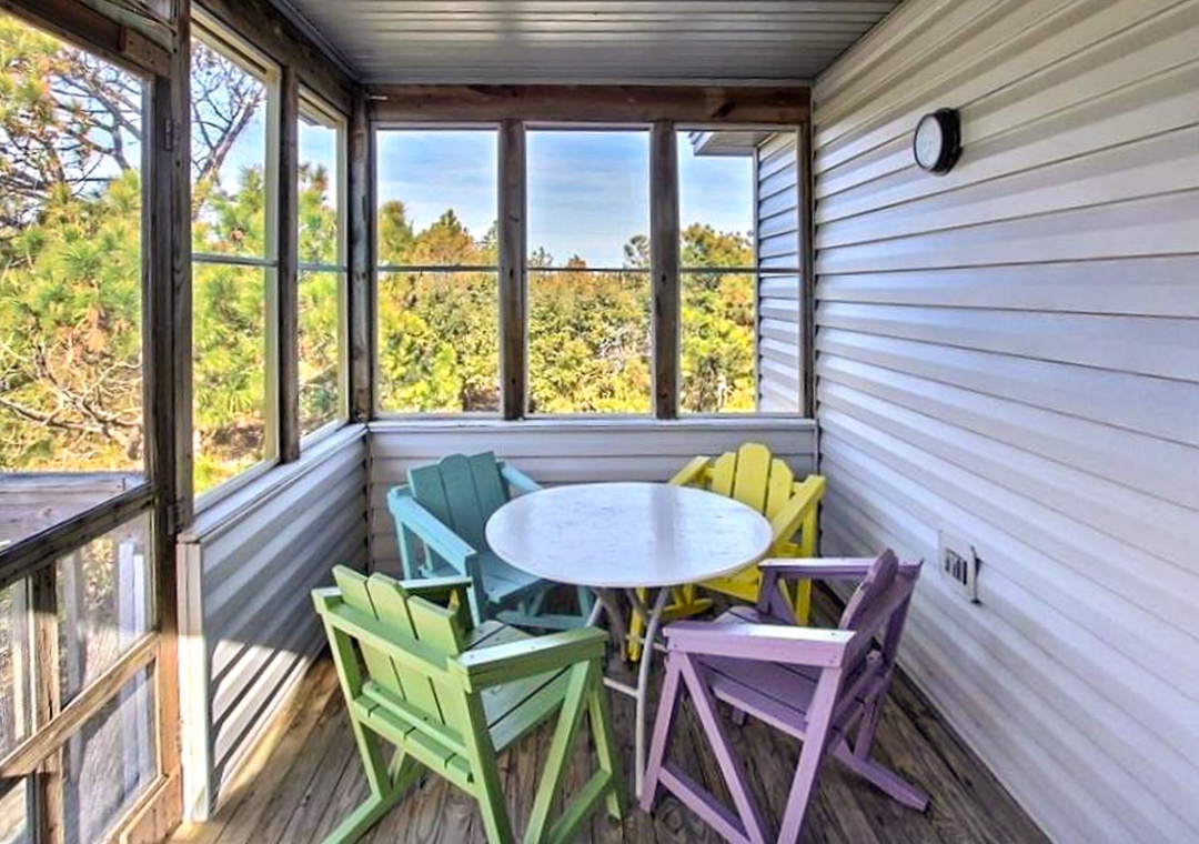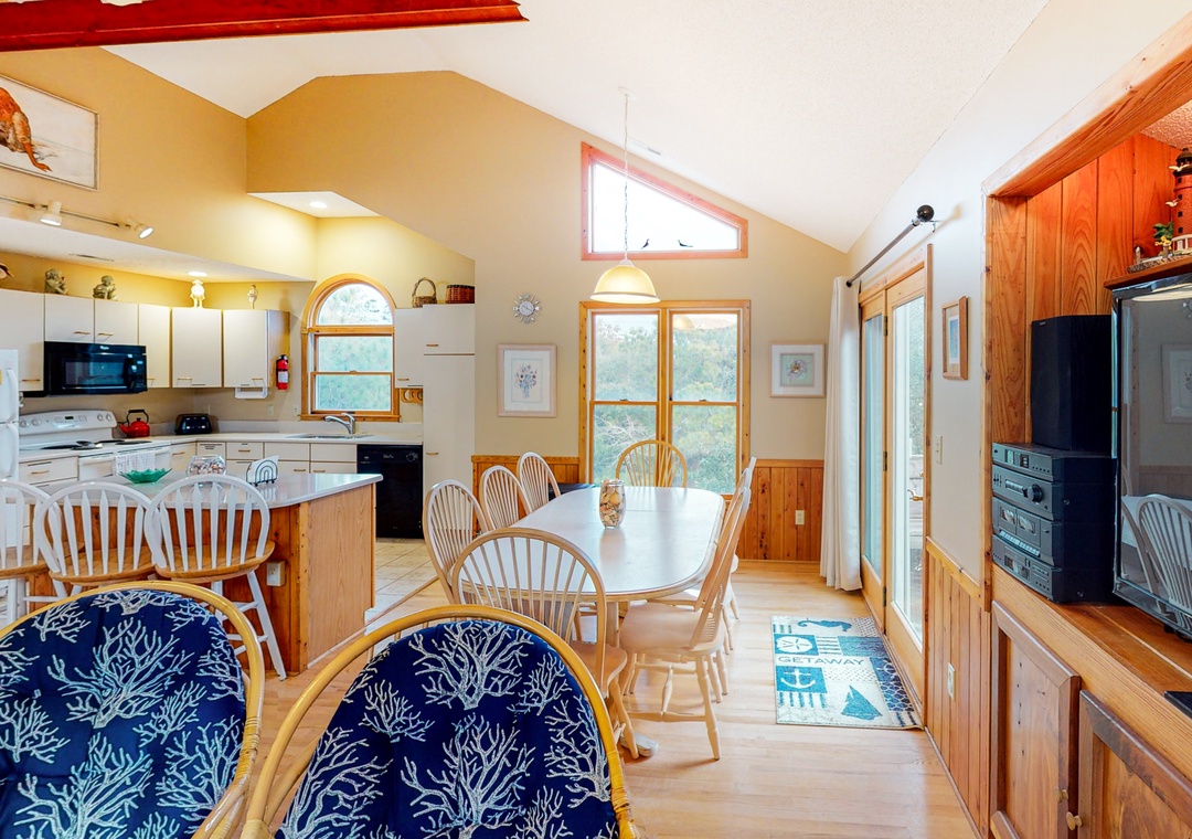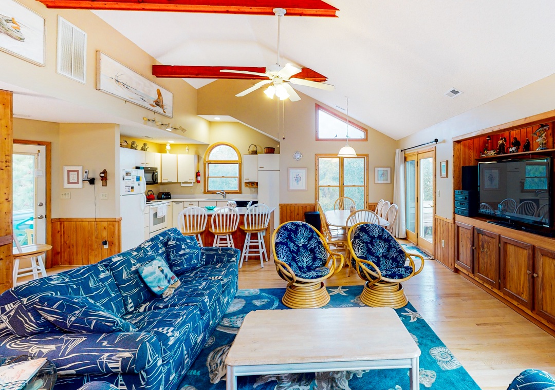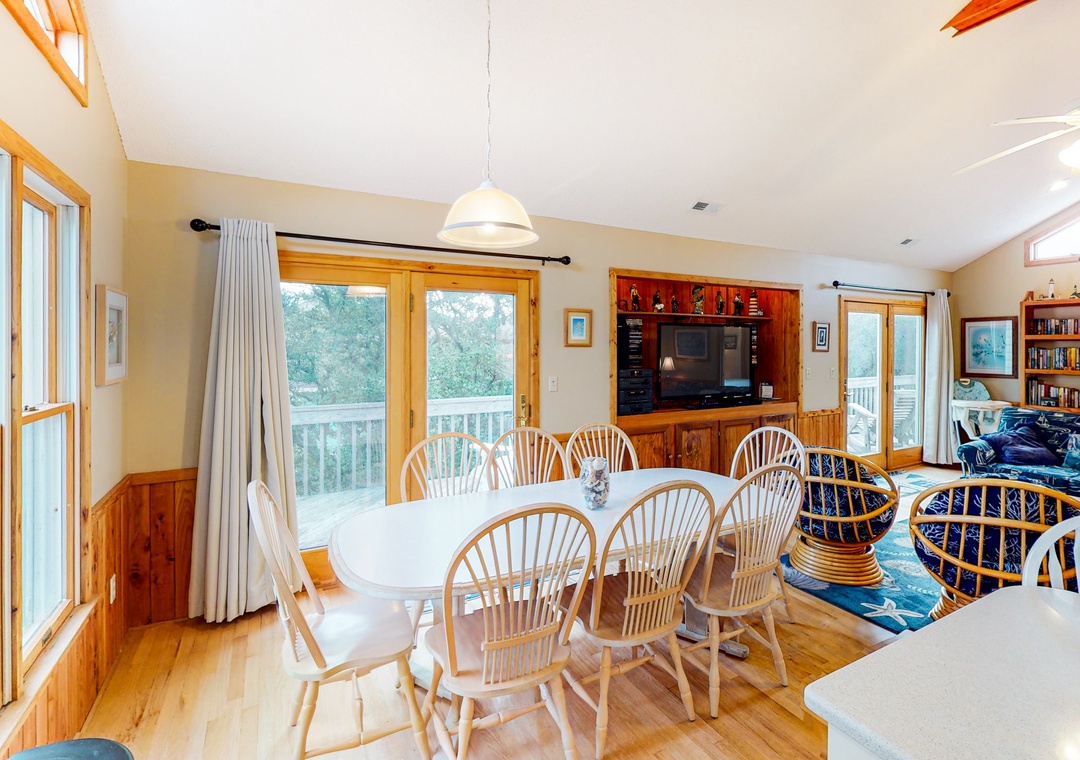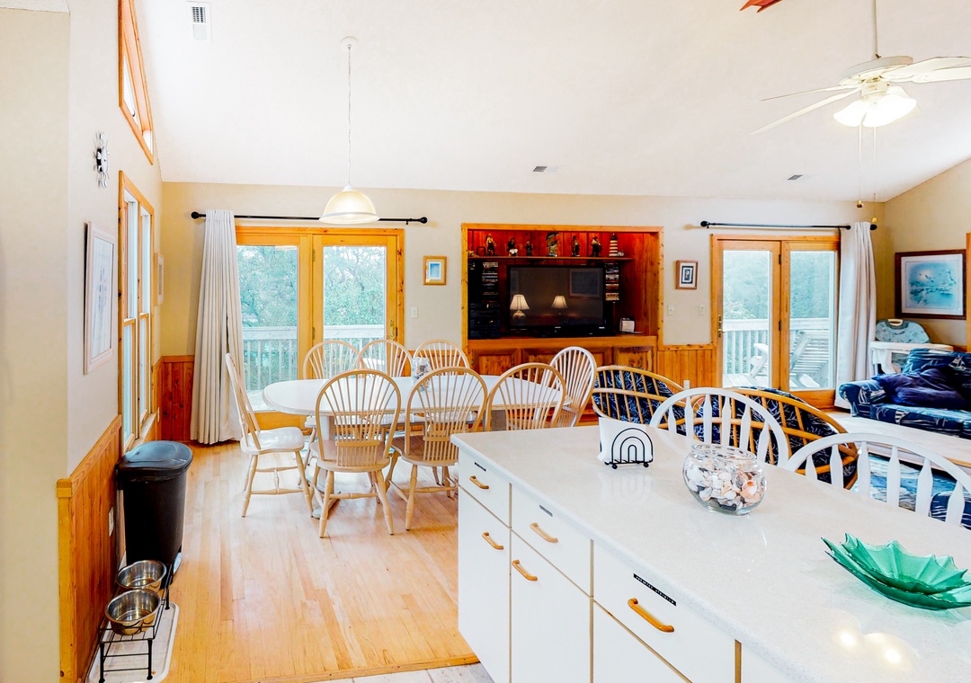 You'll find a TV with a DVD player, stereo, and a double sofa bed in the open great room. Choose something from the video library and host a movie night. Step out to the top-level decks through a sliding glass door to enjoy some Corolla sea breezes. You also have access to a screened porch off the kitchen, which is complete with Corian countertops, a kitchen bar, and a dining table.