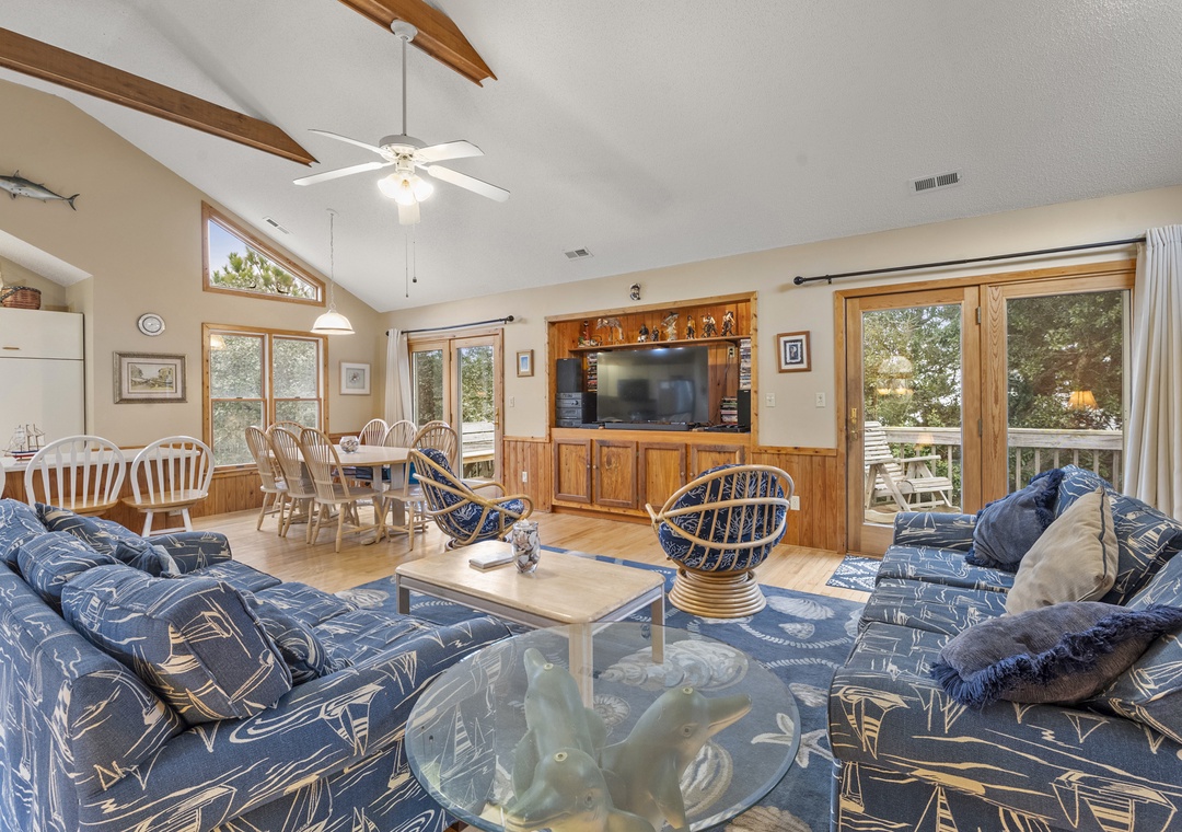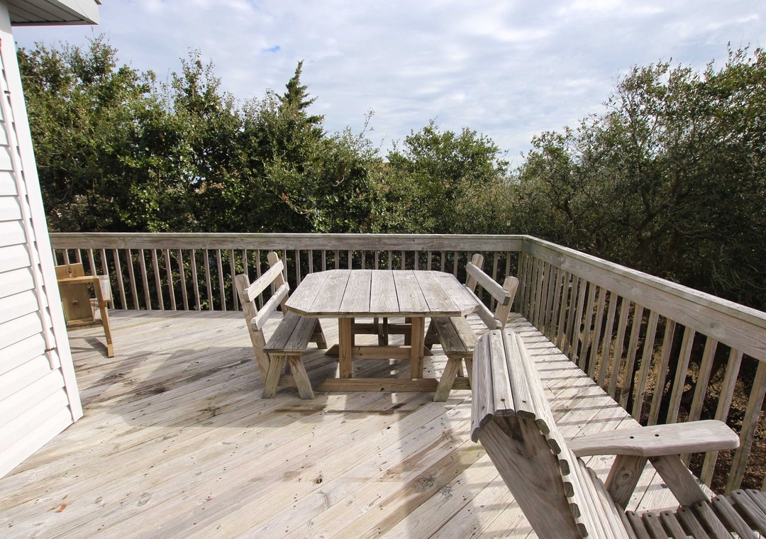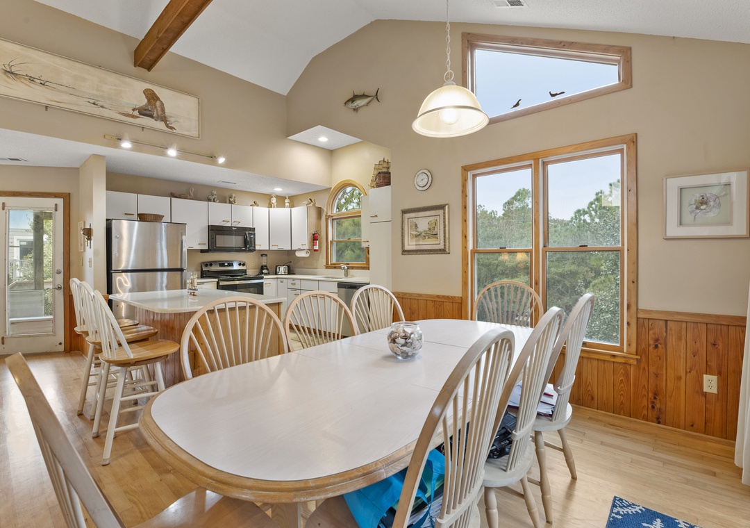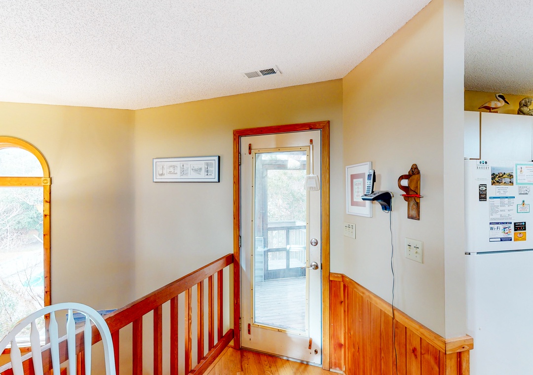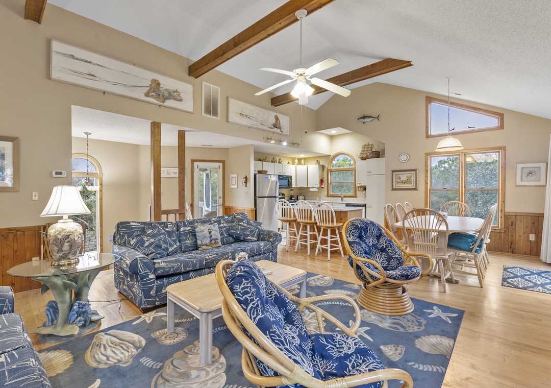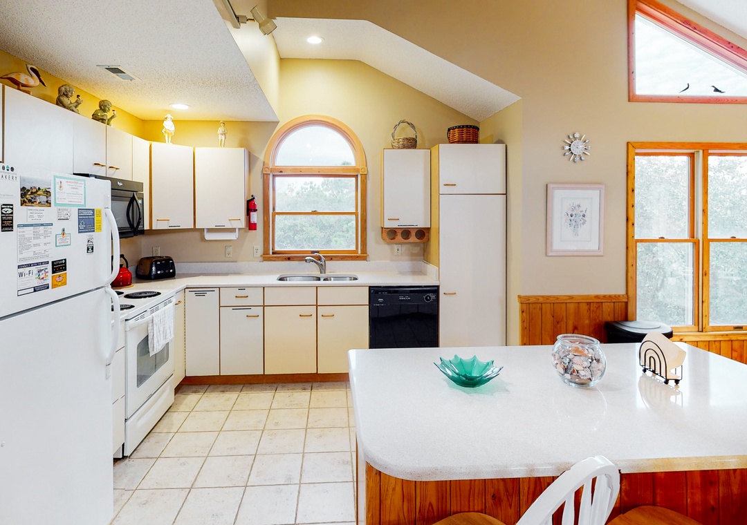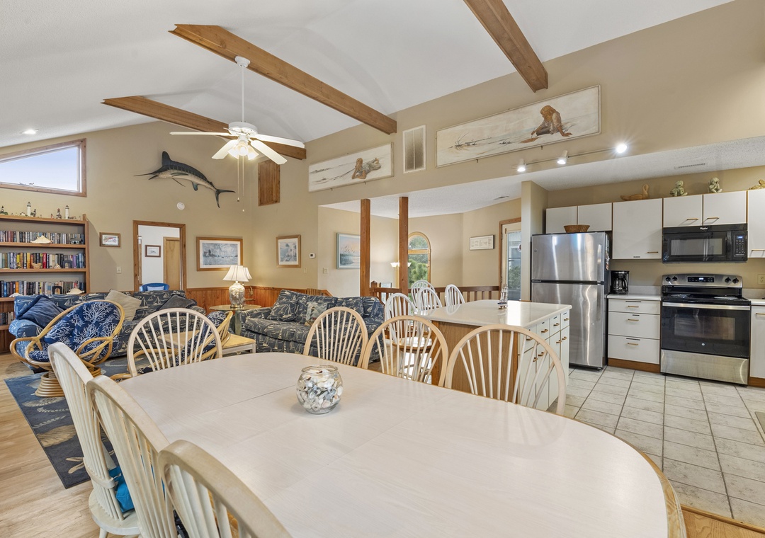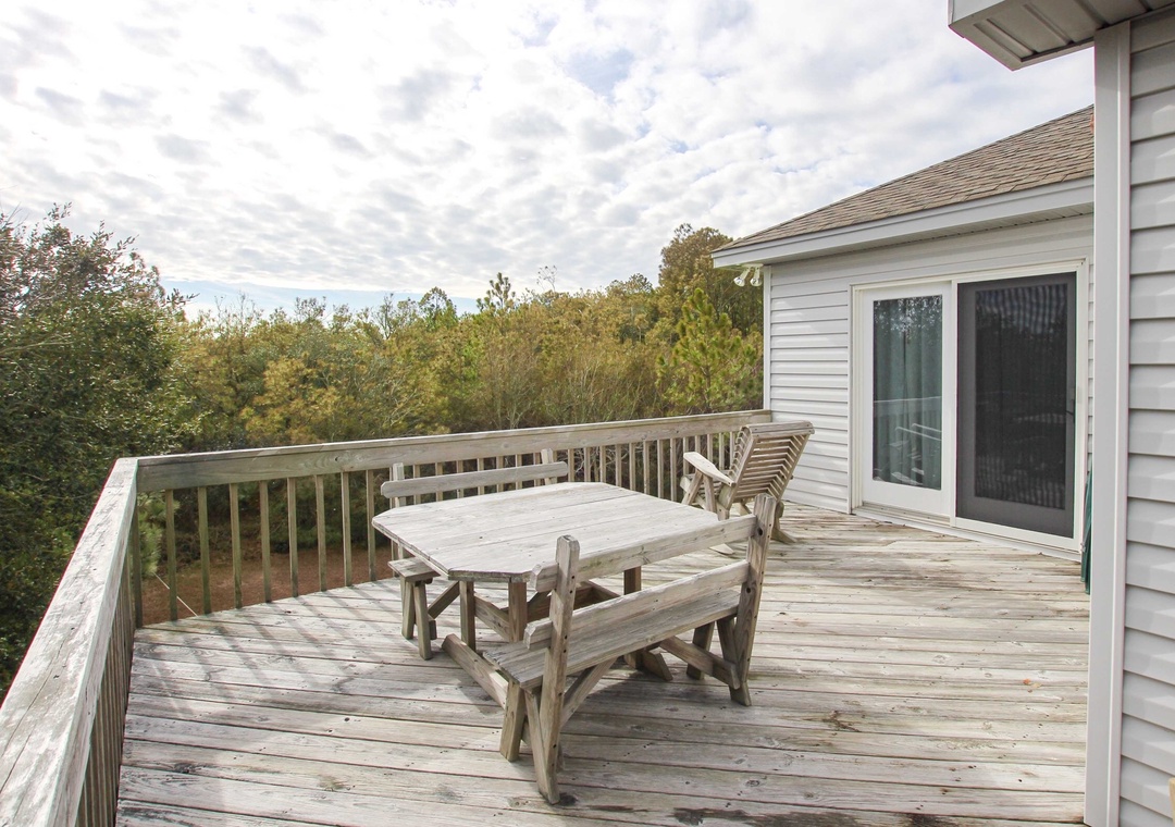 You'll find a TV with a DVD player, stereo, and a double sofa bed in the open great room. Choose something from the video library and host a movie night. Step out to the top-level decks through a sliding glass door to enjoy some Corolla sea breezes. You also have access to a screened porch off the kitchen, which is complete with Corian countertops, a kitchen bar, and a dining table.
