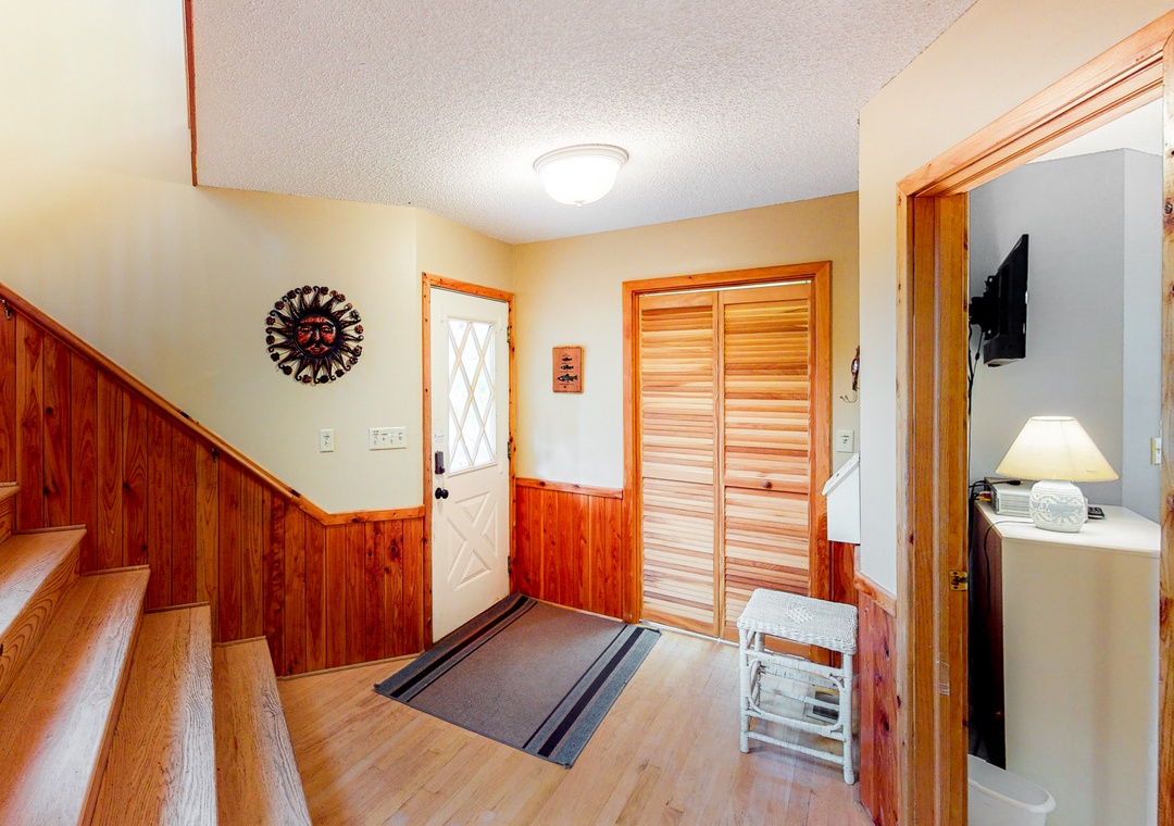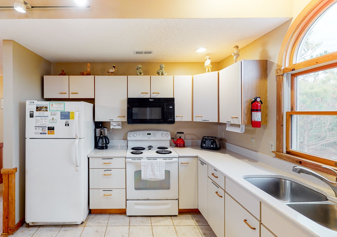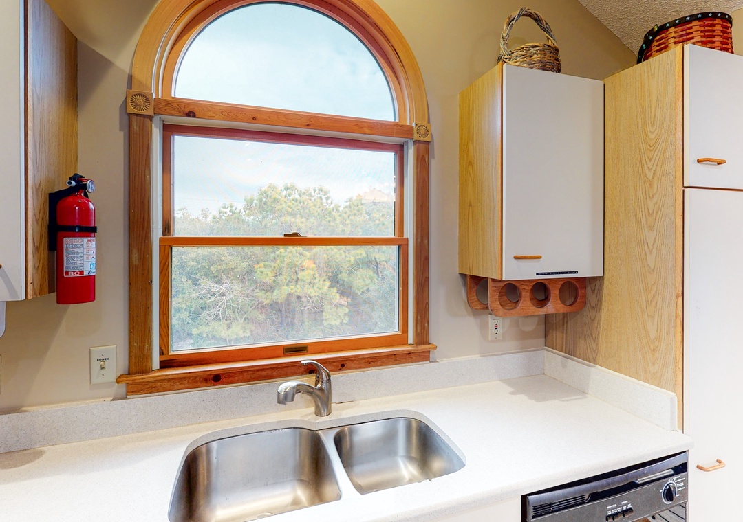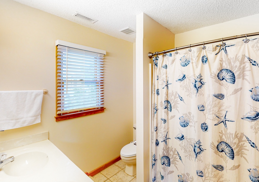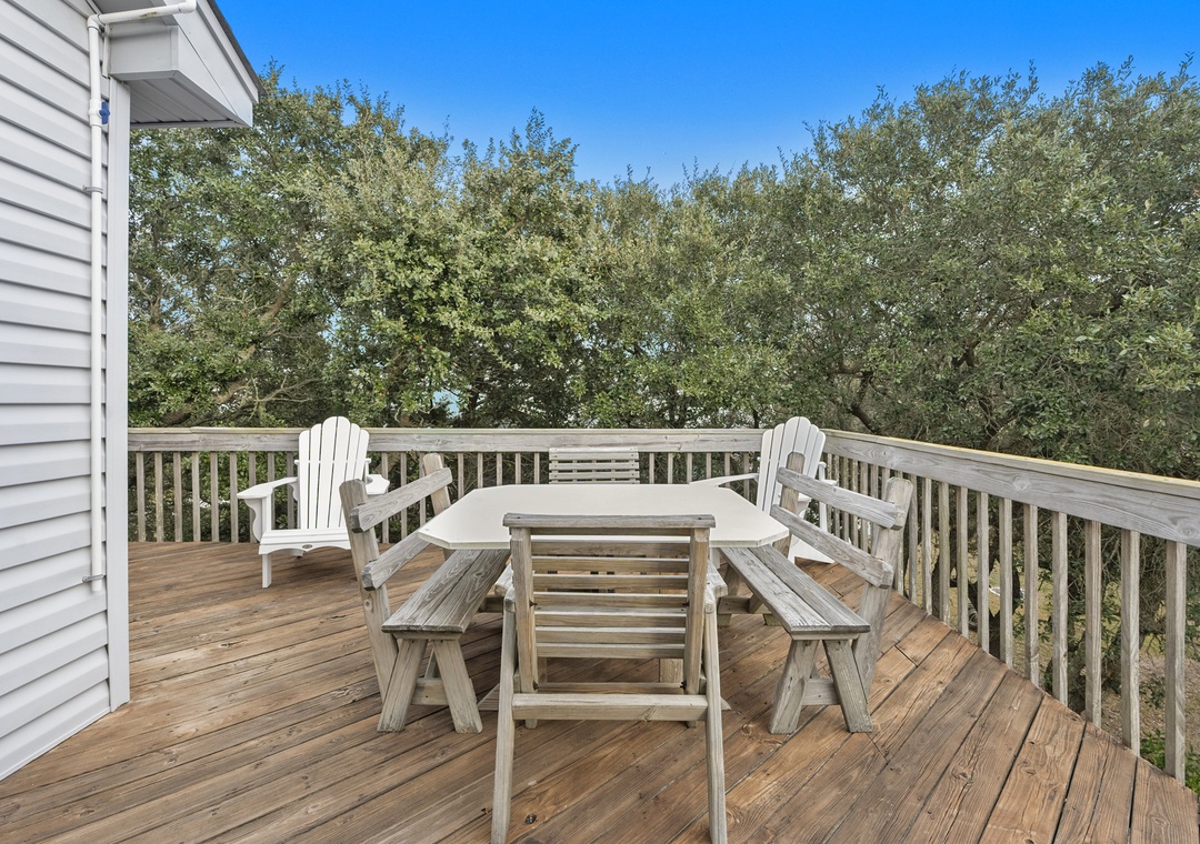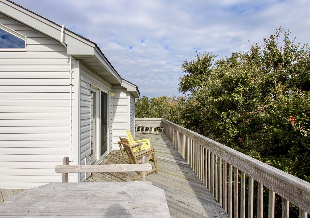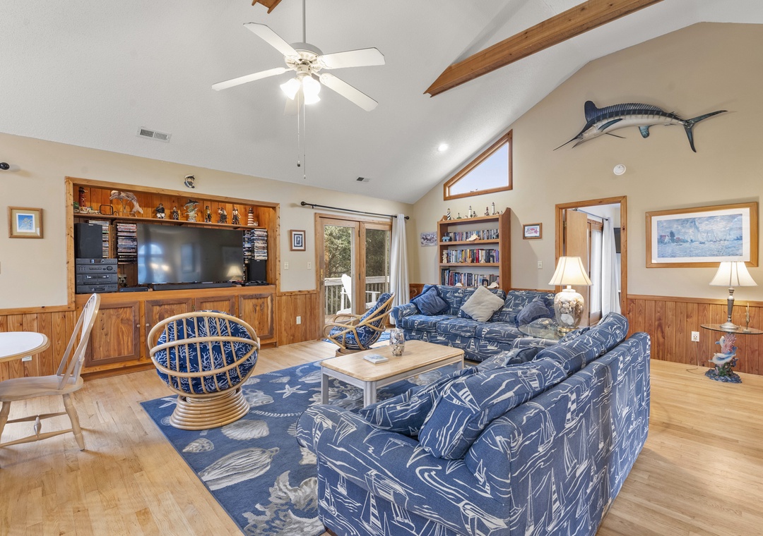 You'll find a TV with a DVD player, stereo, and a double sofa bed in the open great room. Choose something from the video library and host a movie night. Step out to the top-level decks through a sliding glass door to enjoy some Corolla sea breezes. You also have access to a screened porch off the kitchen, which is complete with Corian countertops, a kitchen bar, and a dining table.