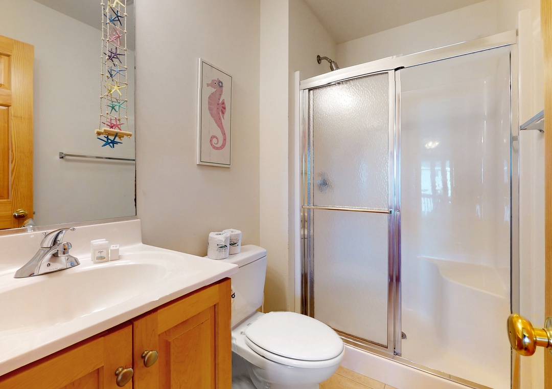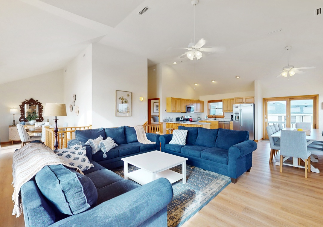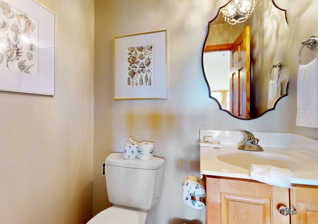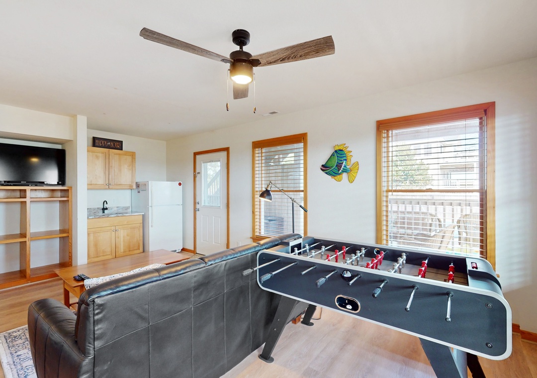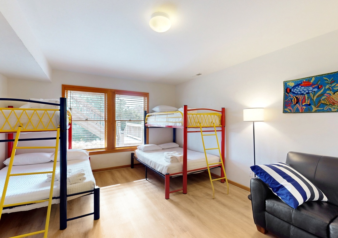 Vaulted ceilings and an array of windows create a bright, airy main-floor living space. Great for group gatherings, kick your feet up in one of the plush sofas and settle in for a family movie night on the TV. Break out the puzzles and board games at the sunny, table nook. The full kitchen comes equipped with all major appliances and a built-in breakfast bar while the adjacent dining space is perfect for greater meals and conversation. Downstairs, a living area/playroom await for greater entertainment and downtime. This all-suite home features private deck access from five of the guest rooms, while younger guests can enjoy two bunk rooms featuring playful themes. Modern essentials include central air-conditioning, free WiFi, and a private washer/dryer.