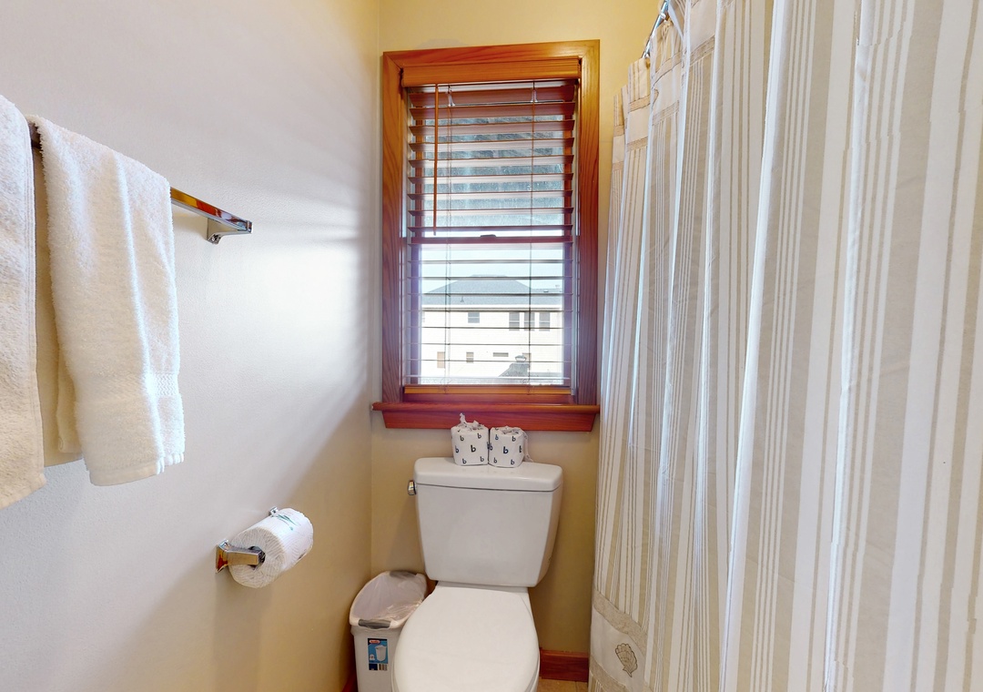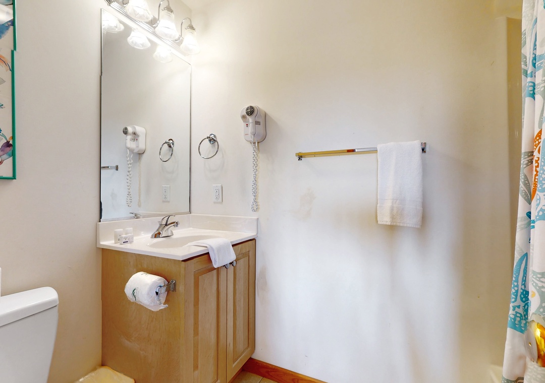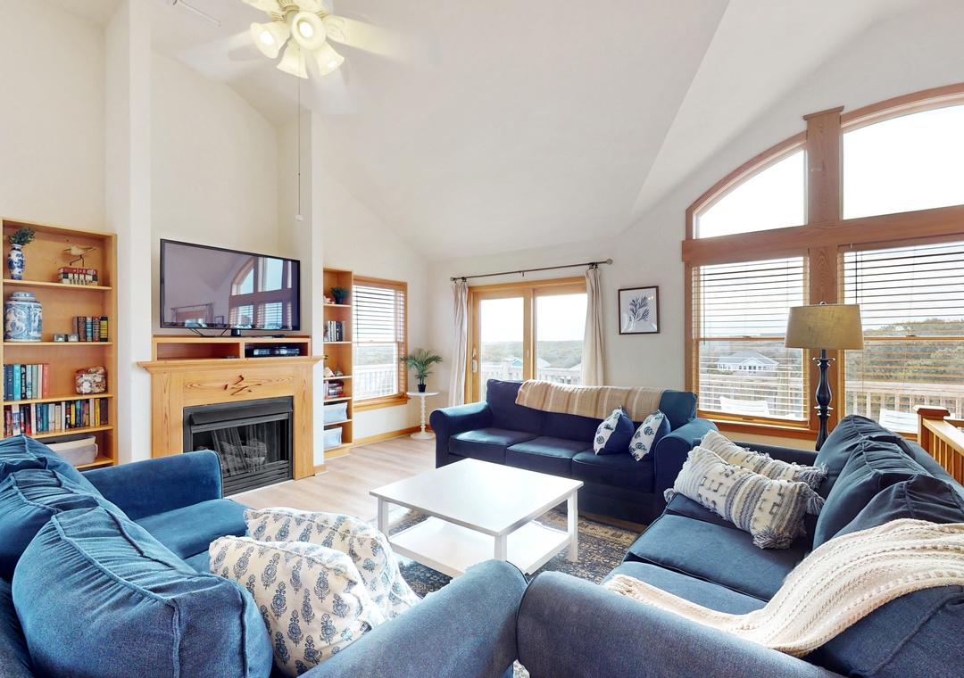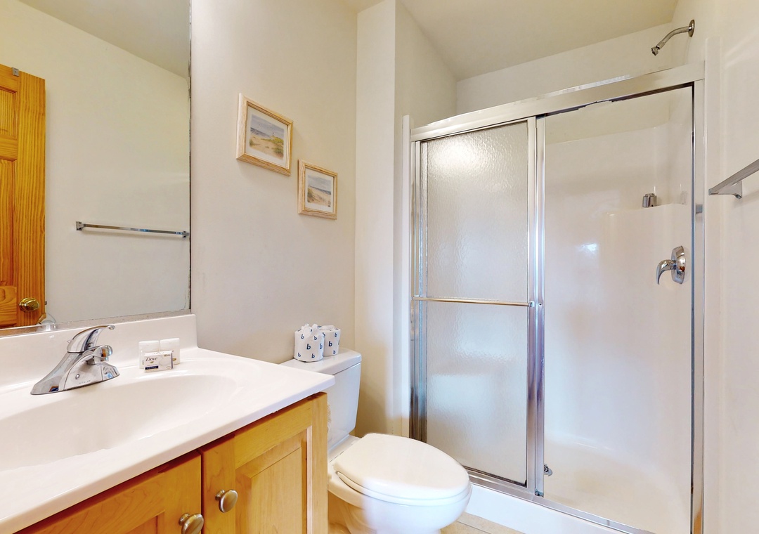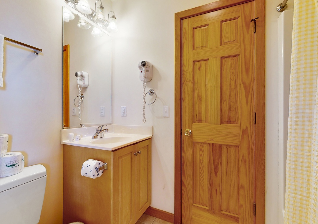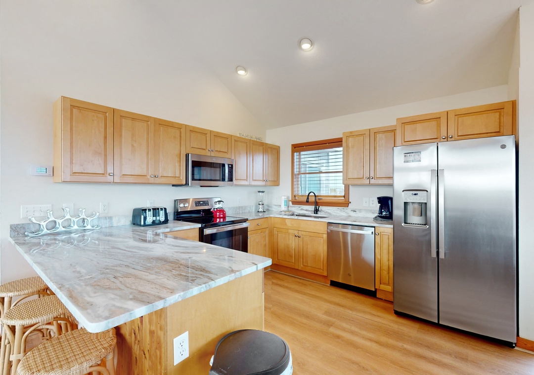Vaulted ceilings and an array of windows create a bright, airy main-floor living space. Great for group gatherings, kick your feet up in one of the plush sofas and settle in for a family movie night on the TV. Break out the puzzles and board games at the sunny, table nook. The full kitchen comes equipped with all major appliances and a built-in breakfast bar while the adjacent dining space is perfect for greater meals and conversation. Downstairs, a living area/playroom await for greater entertainment and downtime. This all-suite home features private deck access from five of the guest rooms, while younger guests can enjoy two bunk rooms featuring playful themes. Modern essentials include central air-conditioning, free WiFi, and a private washer/dryer.