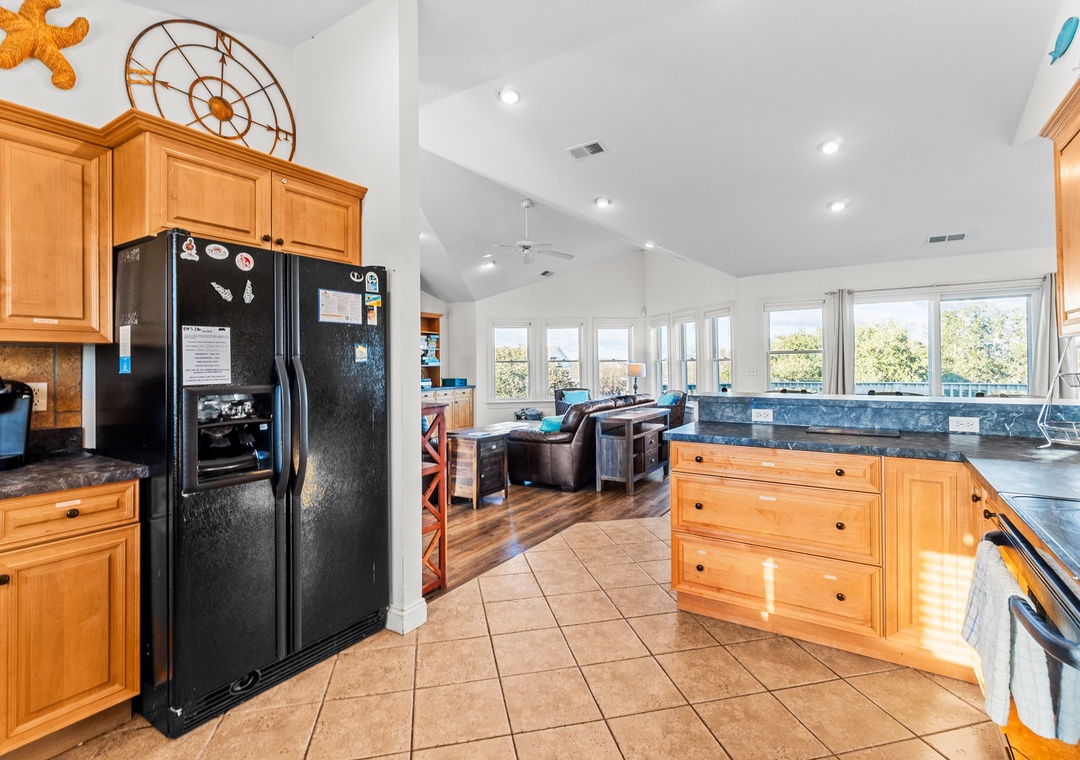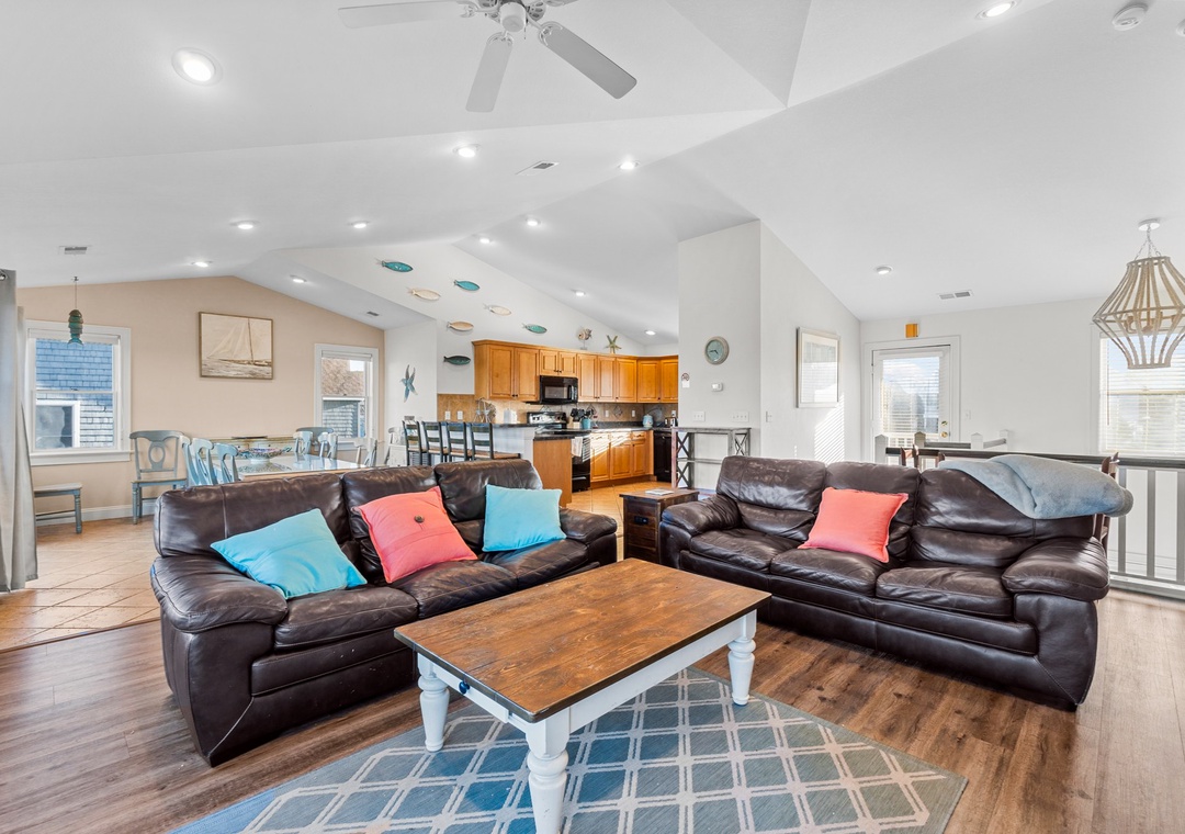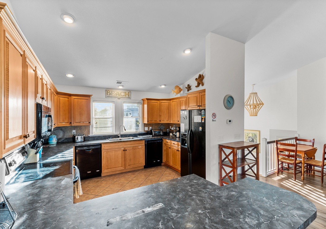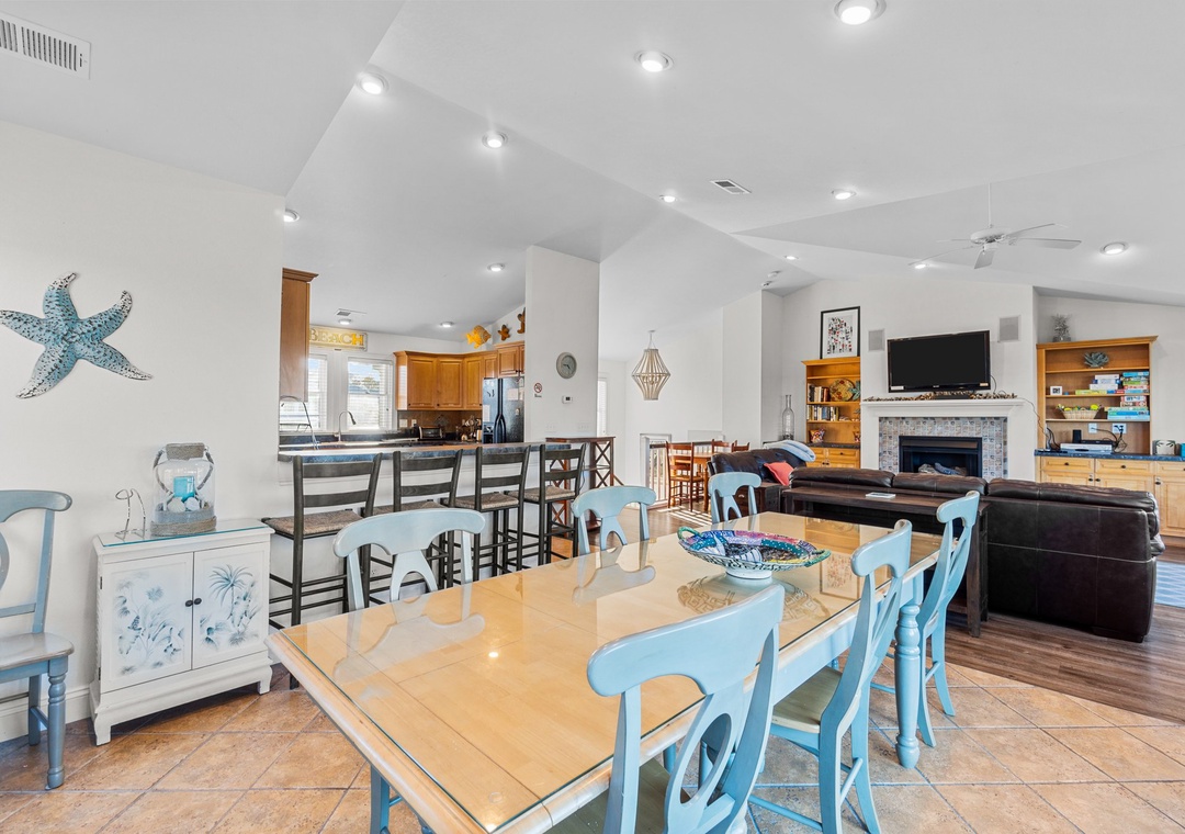 The well-equipped chef’s kitchen features updated appliances, ample counter space, and a full suite of cookware and small appliances so you can comfortably cook for a crowd. Adjacent dining and bar seating make it easy to serve big family meals or quick snacks before heading to the beach or exploring town.