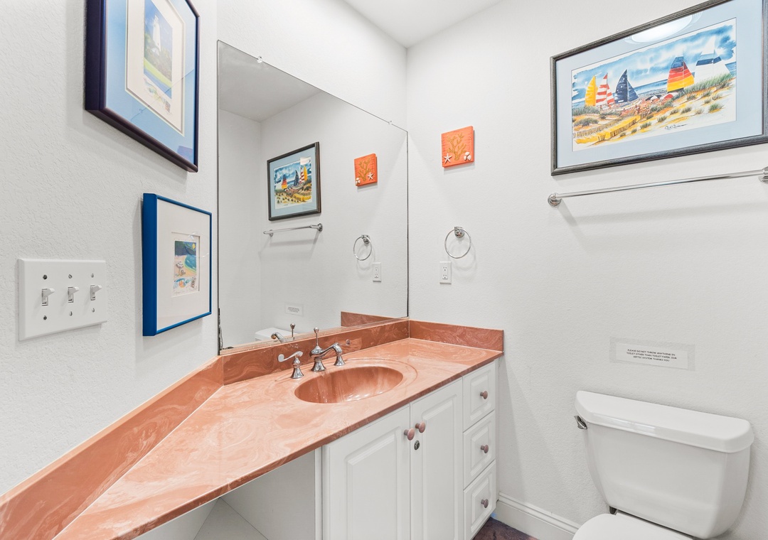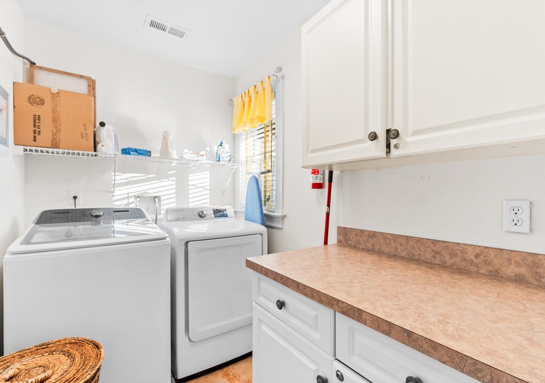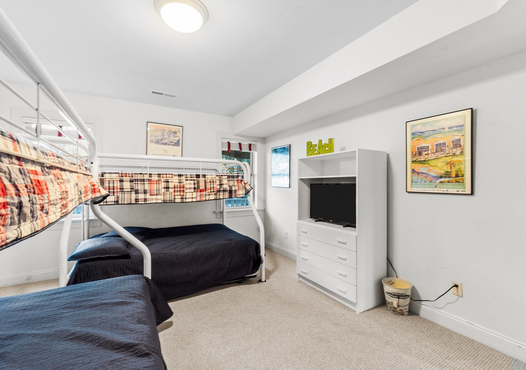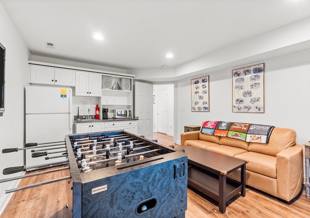 On the ground level, a second living area with foosball table, kitchenette, and casual seating gives kids and teens their own hangout zone. A dedicated laundry room adds convenience for longer stays and beach days.