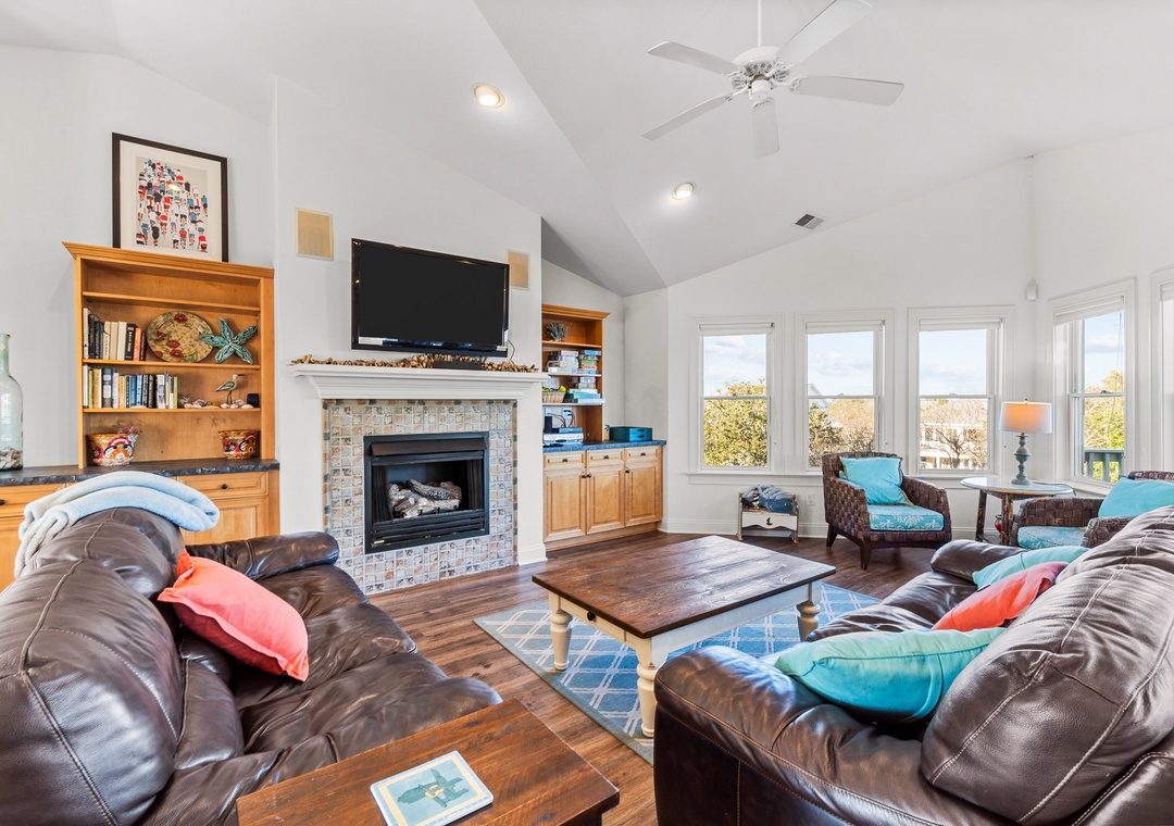 Soaring ceilings, abundant windows, and plush seating create a bright, welcoming great room ideal for gathering after a day outdoors. A gas fireplace (available in the cooler months) and large smart TV set the scene for cozy movie nights and family game time.