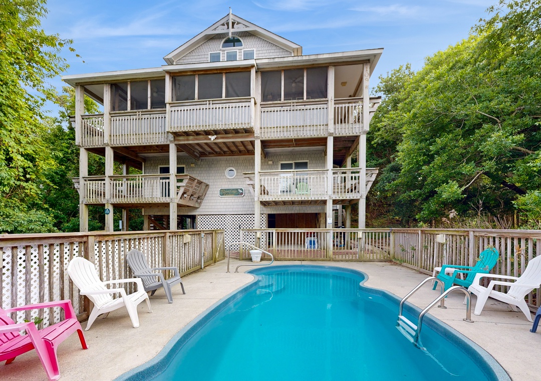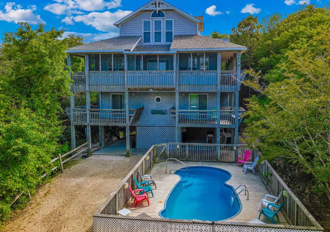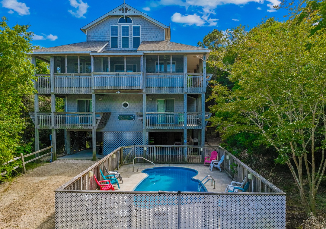 Private, whimsical, and surrounded by trees this lovely four-bedroom home provides the perfect getaway for those looking to escape the day-to-day of everyday life. The beach is a short seven-minute walk away. When you aren't enjoying dazzling views of the treetops and the ocean, dip into the private pool. Multiple balconies, a gas grill, a swing, and an outdoor shower round out the home's stellar outdoor amenities.
