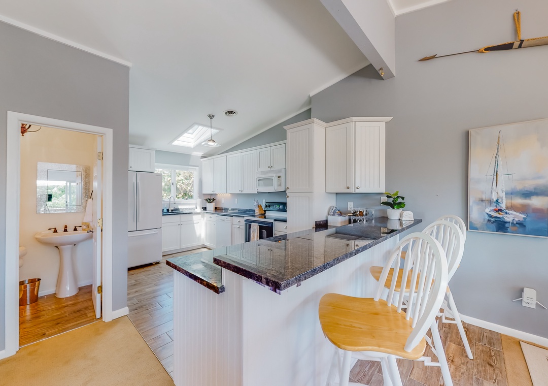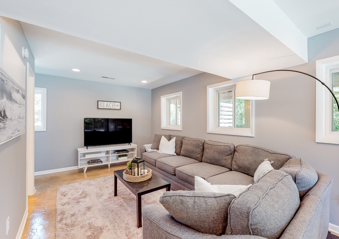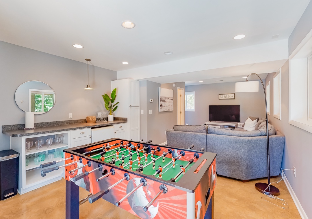 Inside, the fun will continue, as larger groups will love being able to spread out between three spacious floors. The upper level will be the hub for preparing homecooked meals, hosting game nights at the dining table, or watching favorite movies. Wake up in the morning with a barista-quality coffee using the Nespresso machine, and in the evenings step out to the deck to sip a favorite cocktail as the sun goes down. Looking for a bit more excitement? Well, the lower level has another living area with a smart TV and foosball table. A work desk and high-speed WiFi are ideal for remote work or online school.