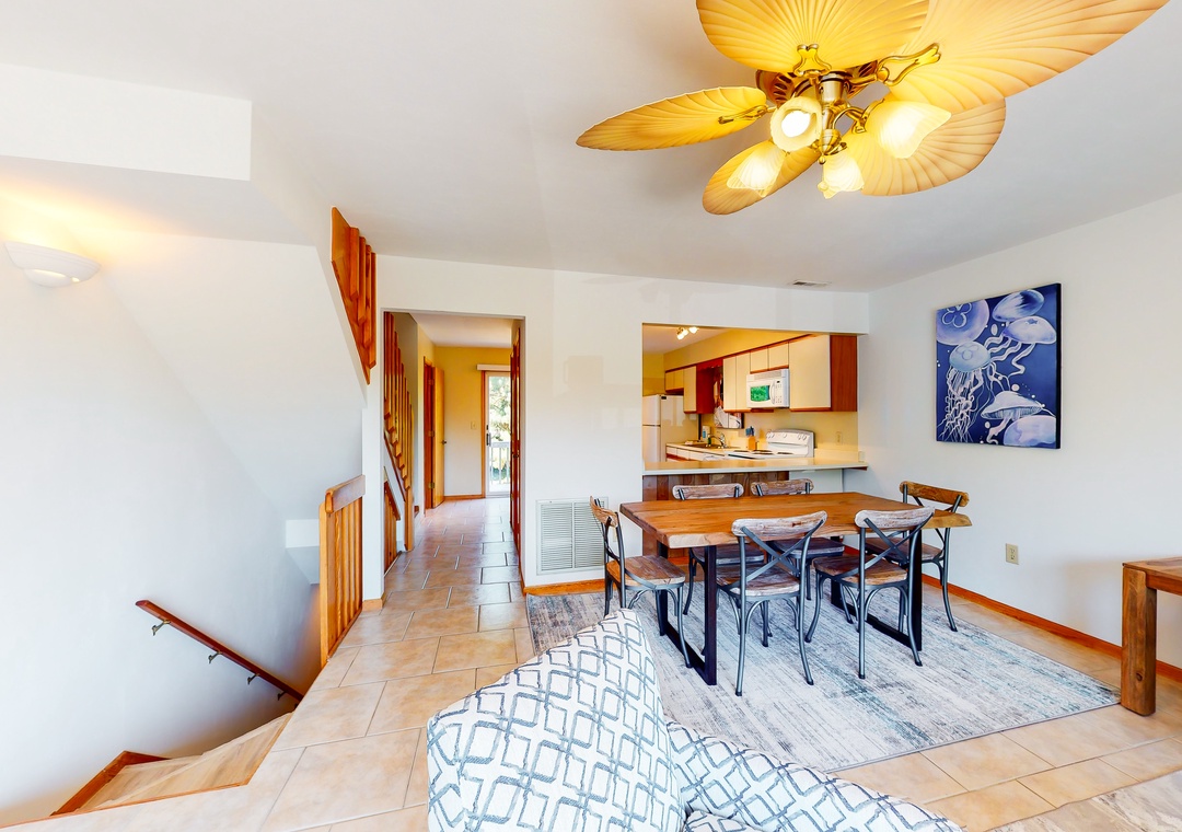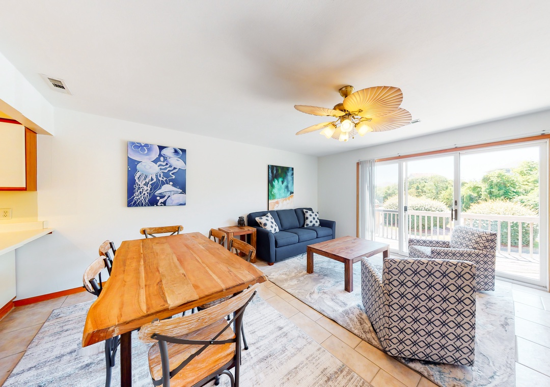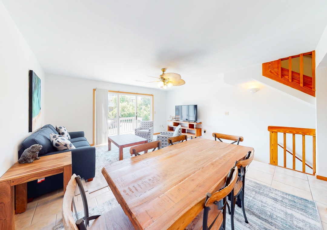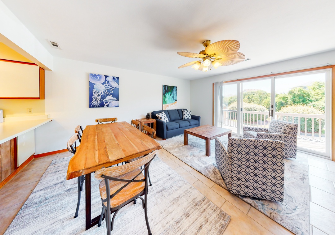 No matter how you choose to spend your days, you'll delight in coming back to a house that has been newly furnished from top to bottom. The living room is full of sunlight, with sliding glass doors that lead outside to a deck. There's also a well-appointed kitchen, a dining area for six, and a balcony adjoining the primary bedroom suite - the perfect place for coffee at sunrise. Central AC will keep you cool all summer, and a washer/dryer is on hand for your swimsuits and towels.