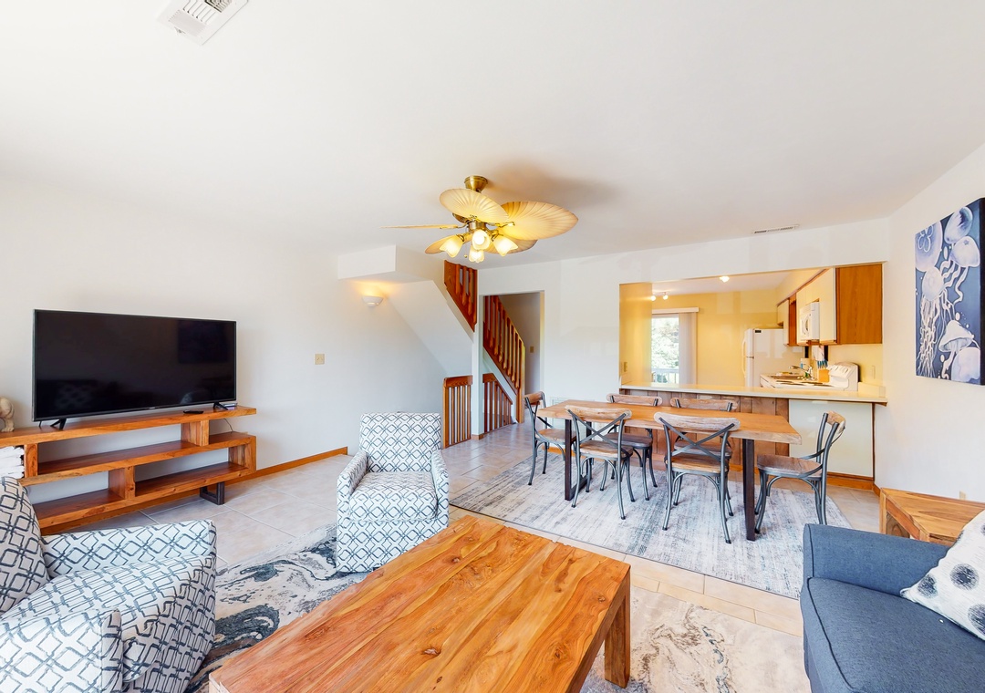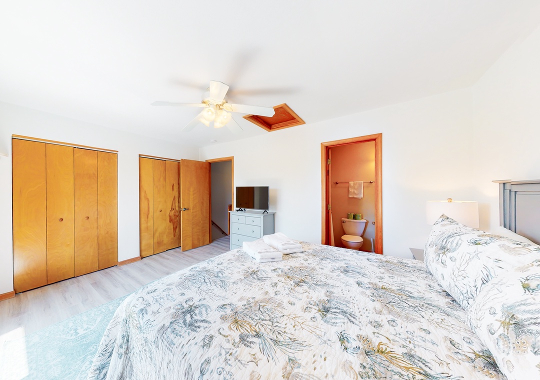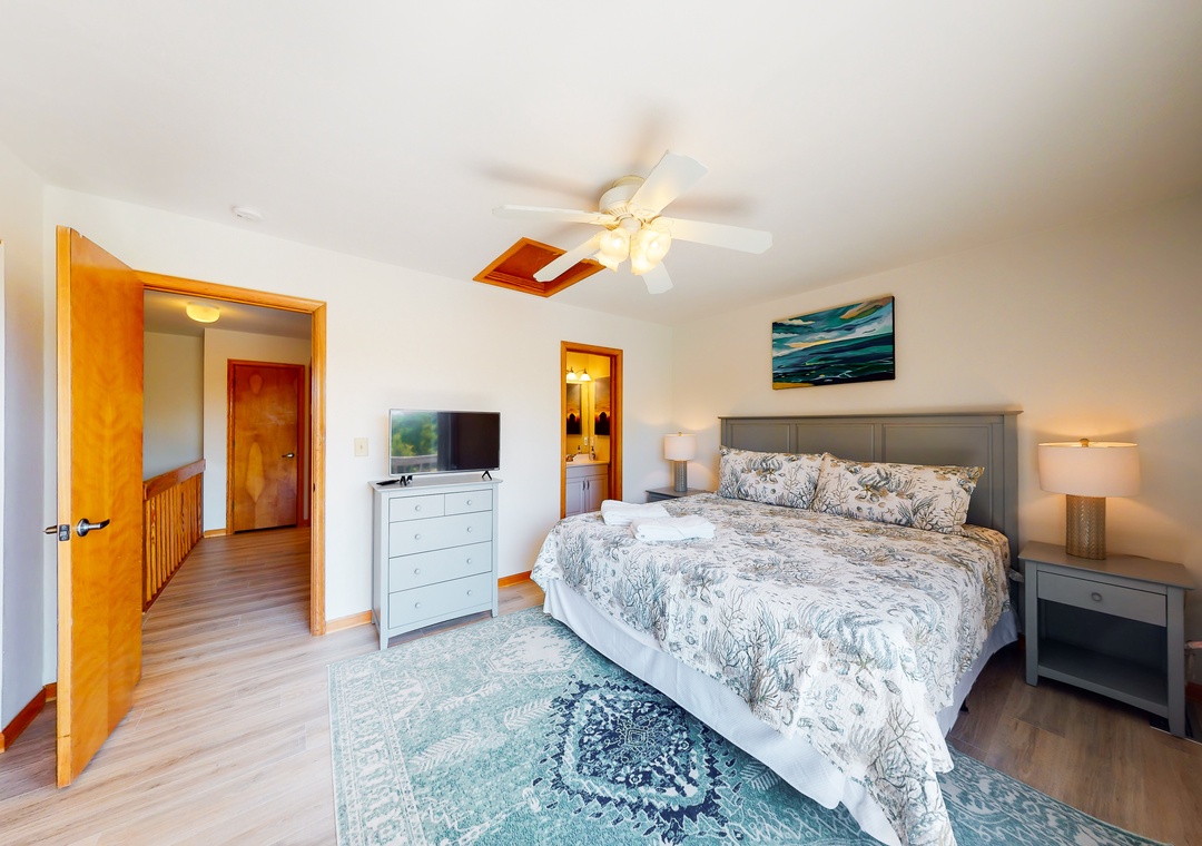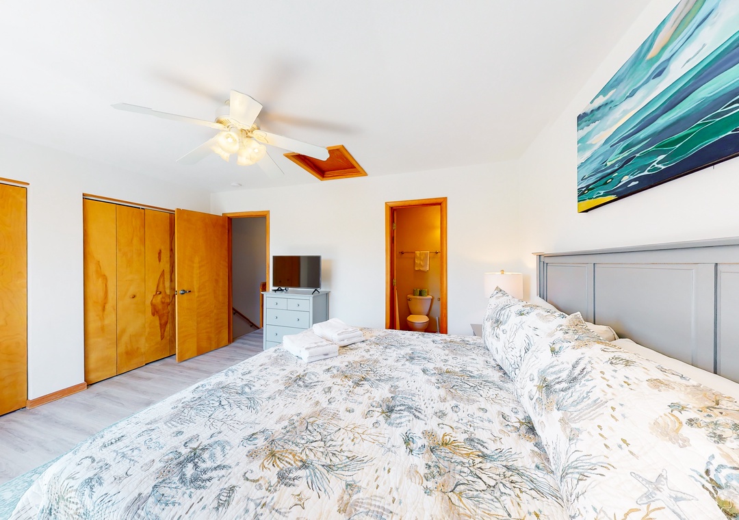 No matter how you choose to spend your days, you'll delight in coming back to a house that has been newly furnished from top to bottom. The living room is full of sunlight, with sliding glass doors that lead outside to a deck. There's also a well-appointed kitchen, a dining area for six, and a balcony adjoining the primary bedroom suite - the perfect place for coffee at sunrise. Central AC will keep you cool all summer, and a washer/dryer is on hand for your swimsuits and towels.