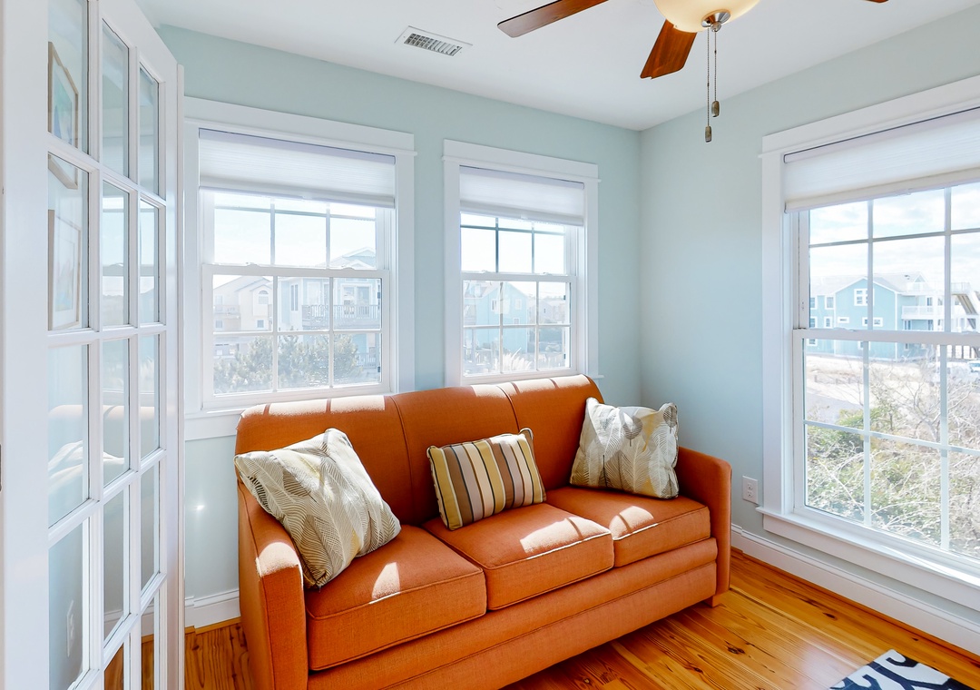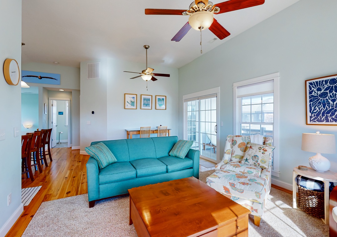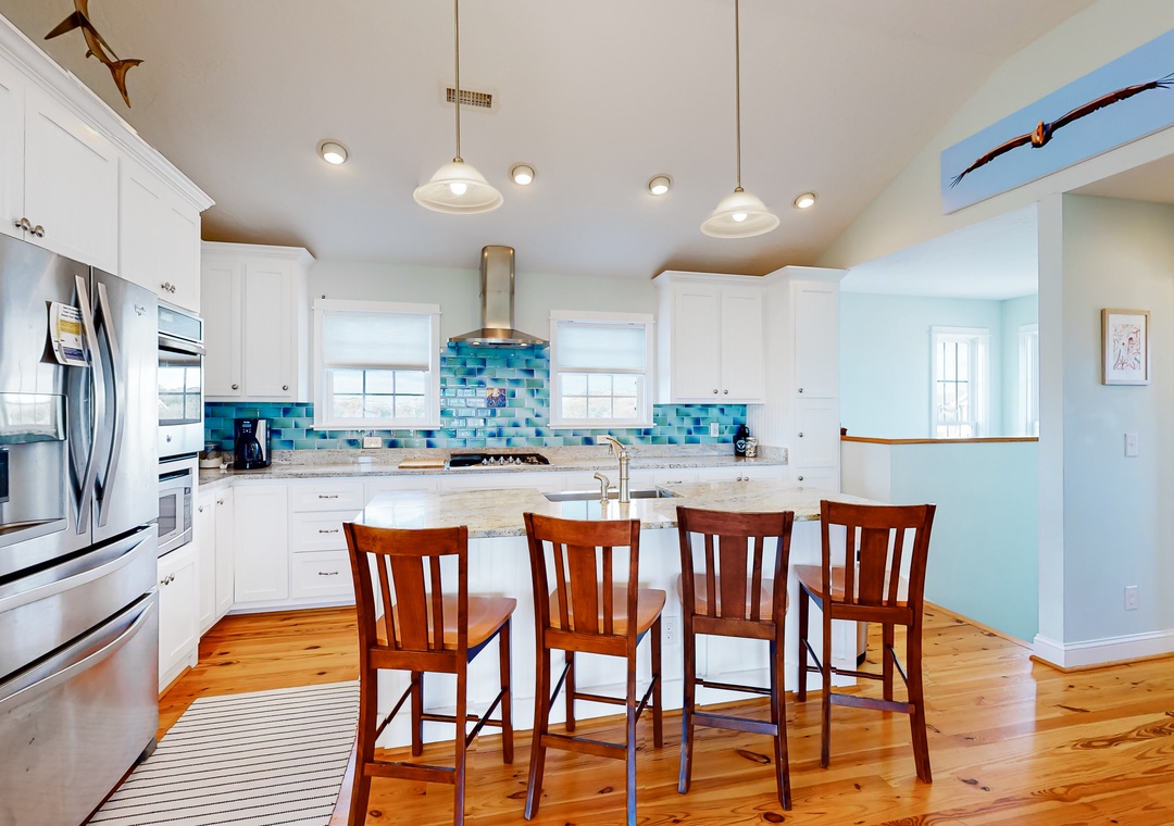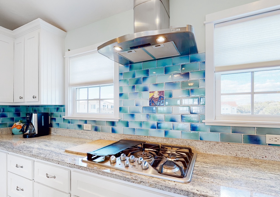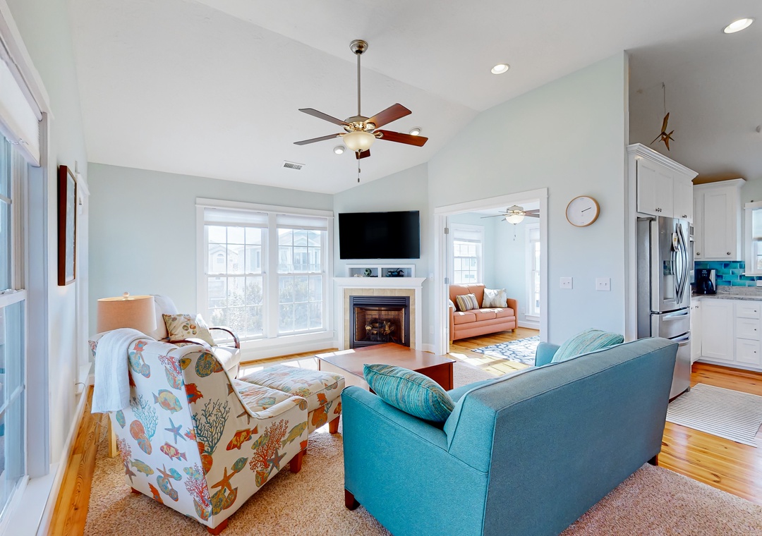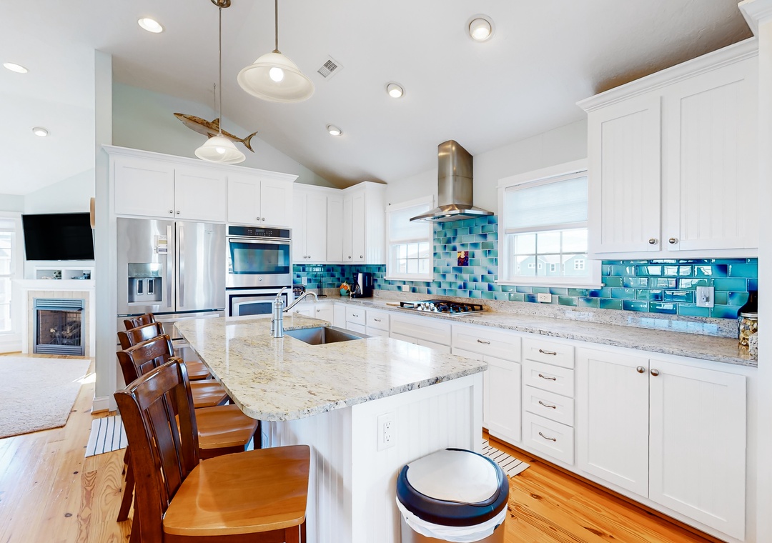 The beautiful kitchen, equipped with bright blue tiling, gleaming countertops, and stainless steel appliances, provides everything the chef of your group needs to whip up amazing meals and snacks. Heading into the colorful living room, sit down and relax with your family as you tune into a movie or play a board game together.