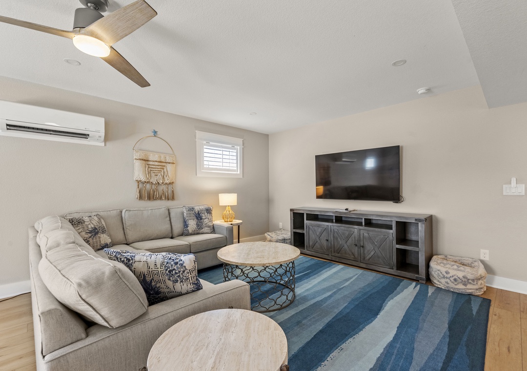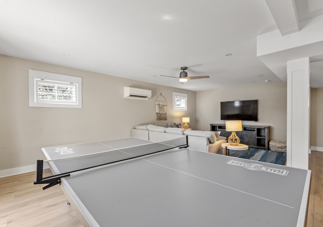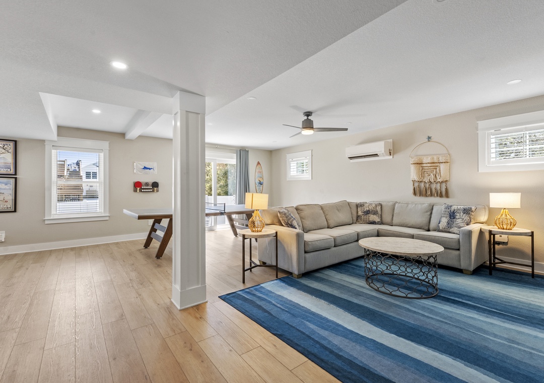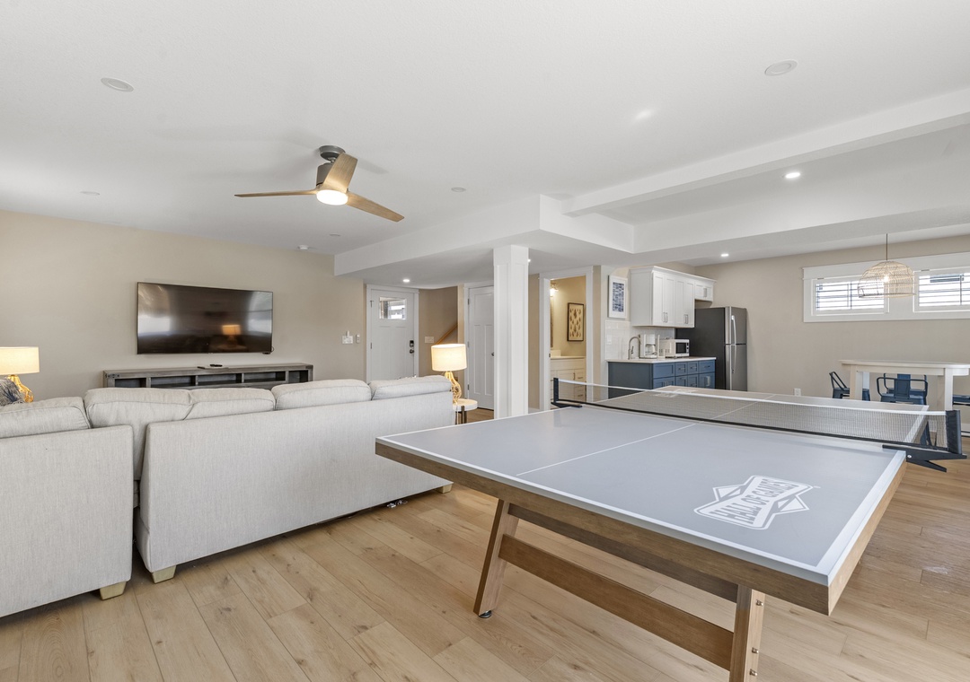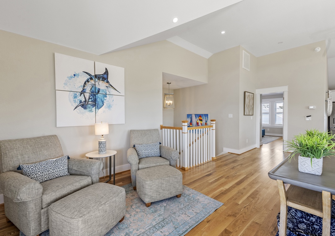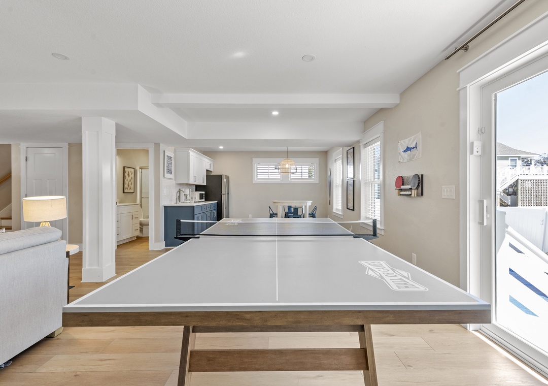 The first level of this spectacular home boasts a sunny rec room with direct access to the backyard. Gather here with your family and friends and create everlasting memories playing Ping-Pong or streaming entertaining movies and series on the smart TV in the lounge area. The well-appointed kitchenette has your back when snack time comes - find a full-size fridge to store all of your goodies, a microwave, and a coffee maker along with a convenient table. This level also features a full bathroom. The second floor features three out of four bedrooms, a laundry room with a washer/dryer, and a spacious deck with rocking chairs. All three OBX-themed bedrooms have smart TVs and en suite bathrooms.