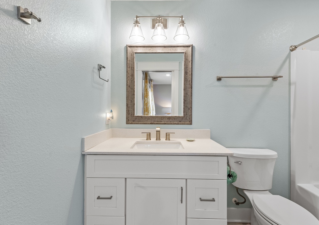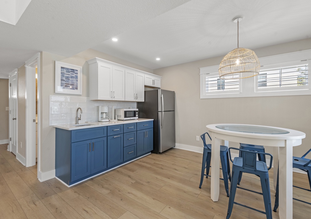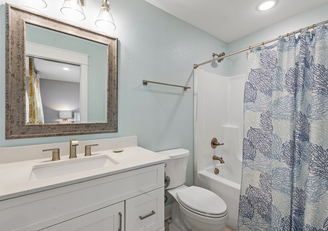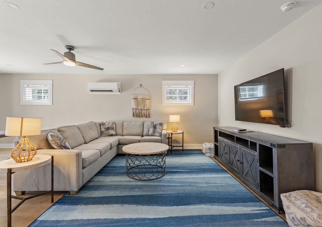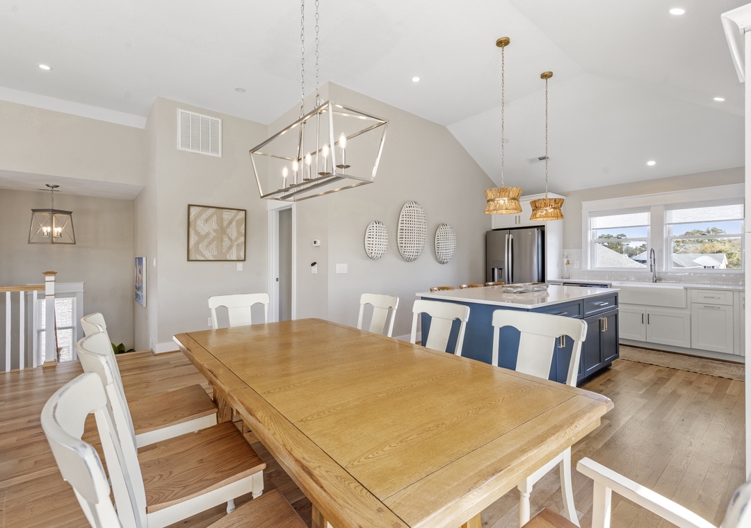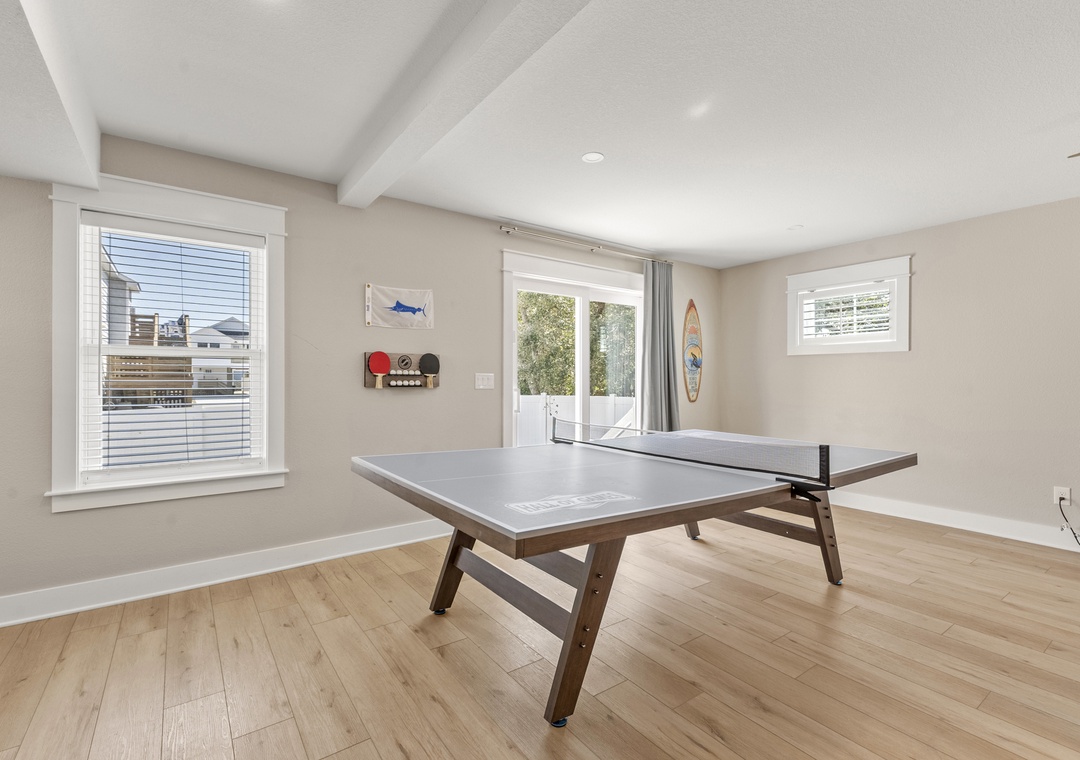 The first level of this spectacular home boasts a sunny rec room with direct access to the backyard. Gather here with your family and friends and create everlasting memories playing Ping-Pong or streaming entertaining movies and series on the smart TV in the lounge area. The well-appointed kitchenette has your back when snack time comes - find a full-size fridge to store all of your goodies, a microwave, and a coffee maker along with a convenient table. This level also features a full bathroom. The second floor features three out of four bedrooms, a laundry room with a washer/dryer, and a spacious deck with rocking chairs. All three OBX-themed bedrooms have smart TVs and en suite bathrooms.