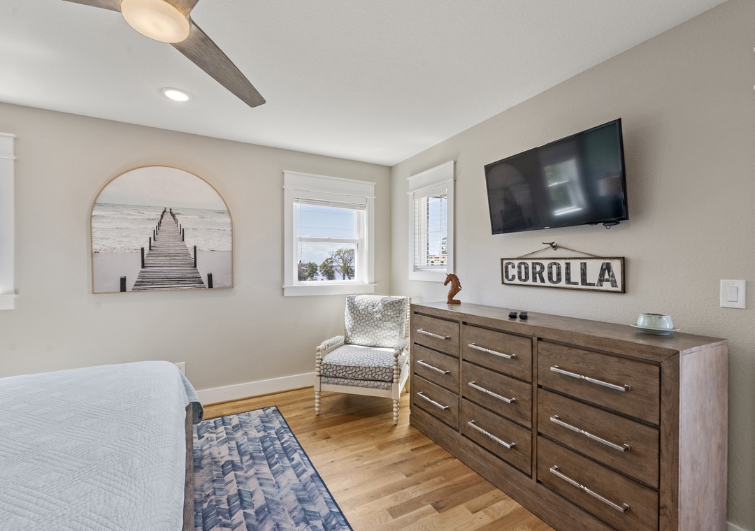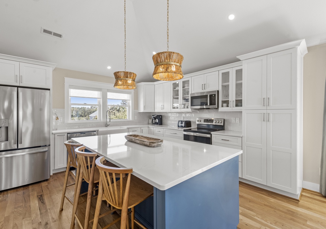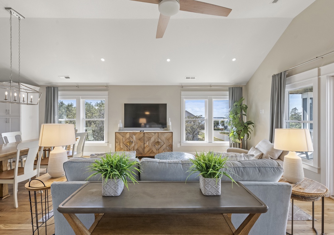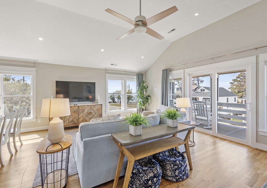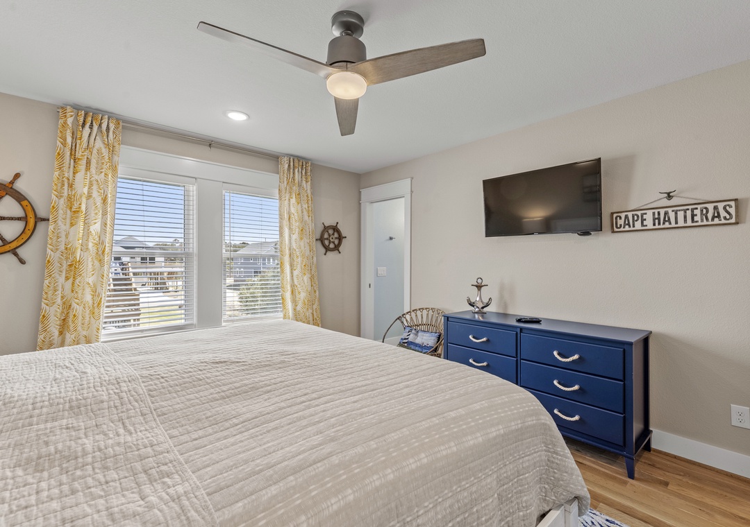 And last, but definitely not least, the third level is where you can find the main living space along with the primary suite! Unwind with your loved ones in the living room, furnished with inviting chairs and a sofa, a gorgeous coffee table, and a smart TV. Spend endless evenings streaming favorite movies or shows, playing board games, or simply relaxing. Sliding glass doors lead you to the deck with great views of Kitty Hawk Bay to the west. Prepare savory culinary masterpieces for everyone in the well-appointed kitchen, complete with shiny countertops and top-notch stainless steel appliances that will make cooking a breeze. The primary duck-themed suite also features a smart TV and an en suite bath.