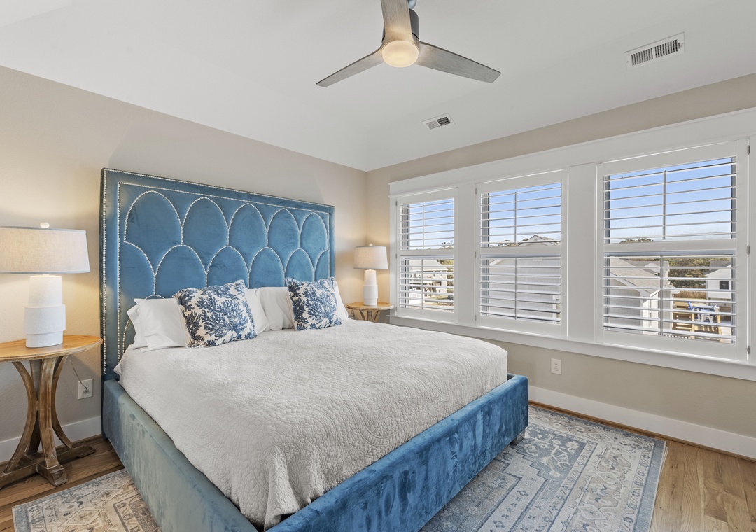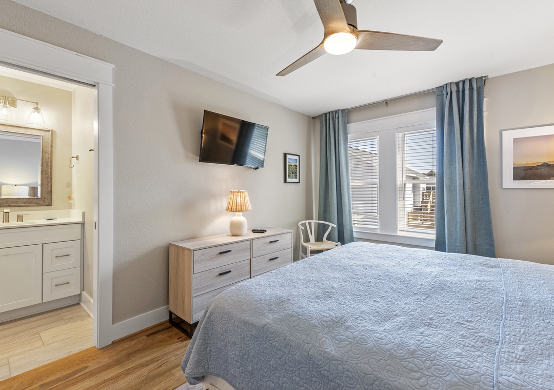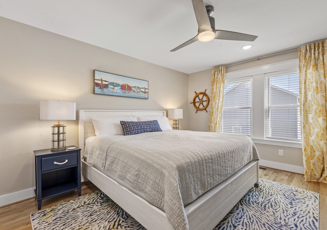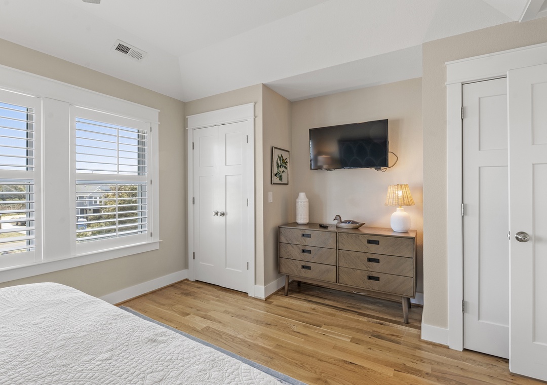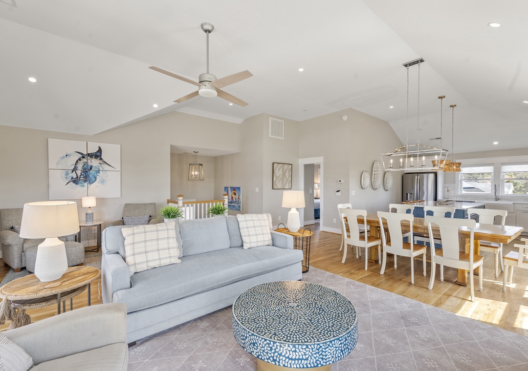 And last, but definitely not least, the third level is where you can find the main living space along with the primary suite! Unwind with your loved ones in the living room, furnished with inviting chairs and a sofa, a gorgeous coffee table, and a smart TV. Spend endless evenings streaming favorite movies or shows, playing board games, or simply relaxing. Sliding glass doors lead you to the deck with great views of Kitty Hawk Bay to the west. Prepare savory culinary masterpieces for everyone in the well-appointed kitchen, complete with shiny countertops and top-notch stainless steel appliances that will make cooking a breeze. The primary duck-themed suite also features a smart TV and an en suite bath.