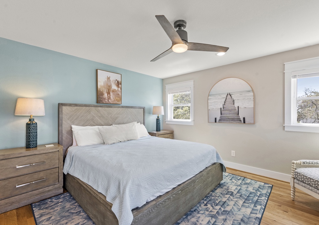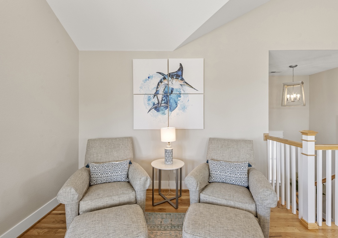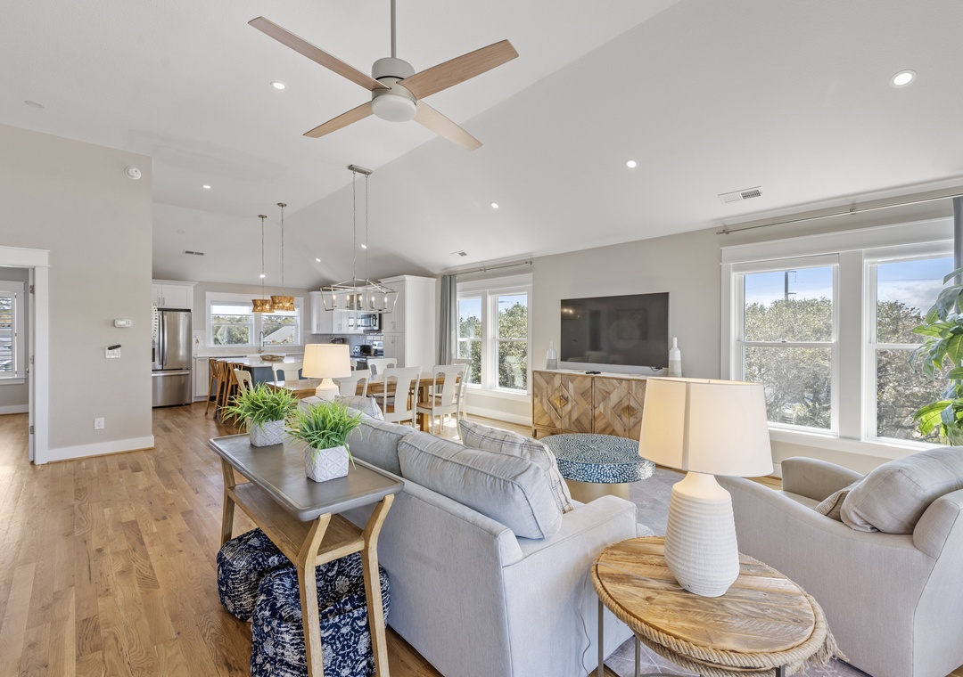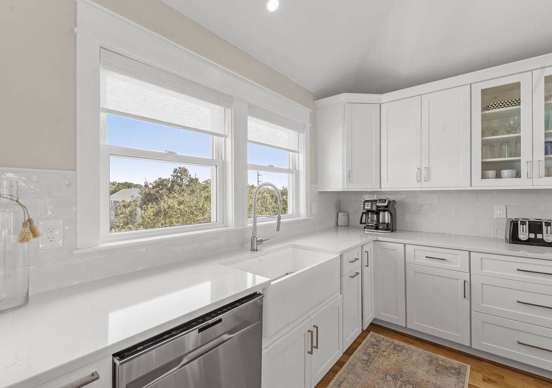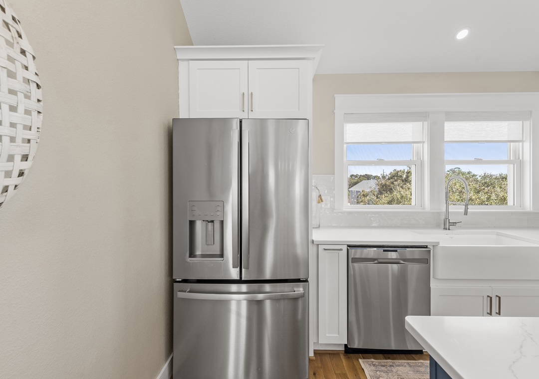 And last, but definitely not least, the third level is where you can find the main living space along with the primary suite! Unwind with your loved ones in the living room, furnished with inviting chairs and a sofa, a gorgeous coffee table, and a smart TV. Spend endless evenings streaming favorite movies or shows, playing board games, or simply relaxing. Sliding glass doors lead you to the deck with great views of Kitty Hawk Bay to the west. Prepare savory culinary masterpieces for everyone in the well-appointed kitchen, complete with shiny countertops and top-notch stainless steel appliances that will make cooking a breeze. The primary duck-themed suite also features a smart TV and an en suite bath.