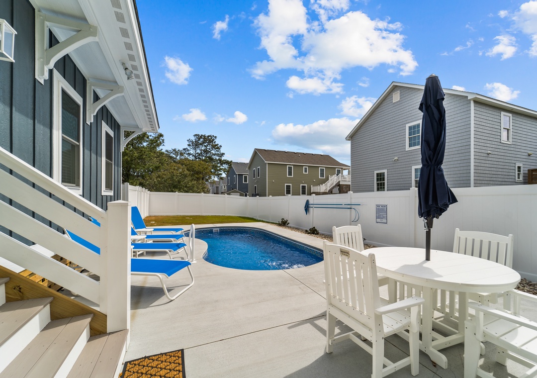 This classic North Carolina retreat offers an enclosed, grassy backyard with room for badminton or other lawn games, a sparkling outdoor pool, several poolside loungers where you can work on your tan, and an outdoor dining area to dine alfresco.