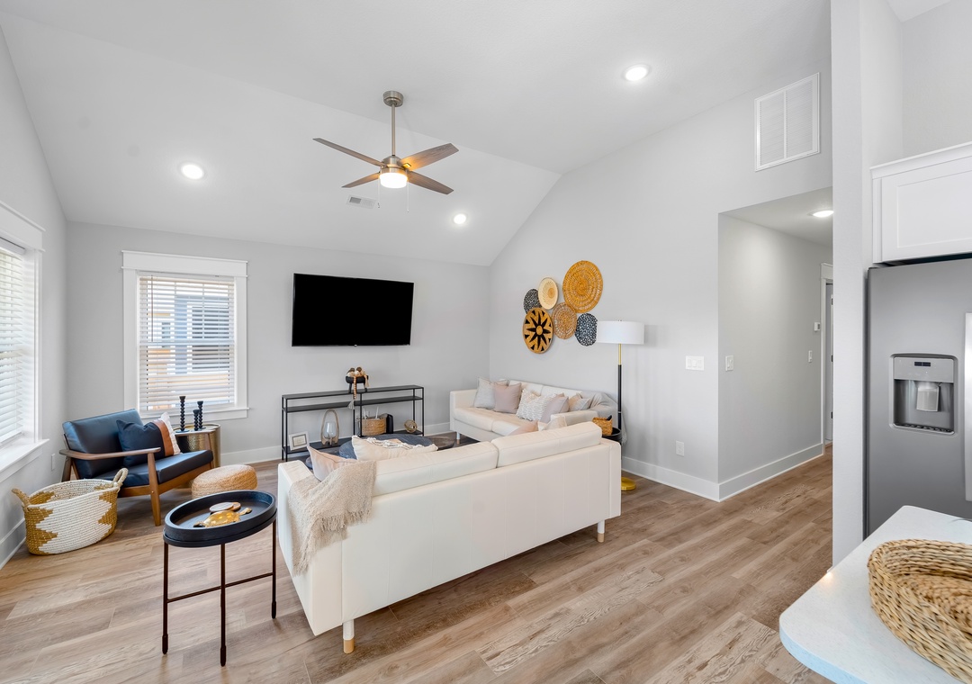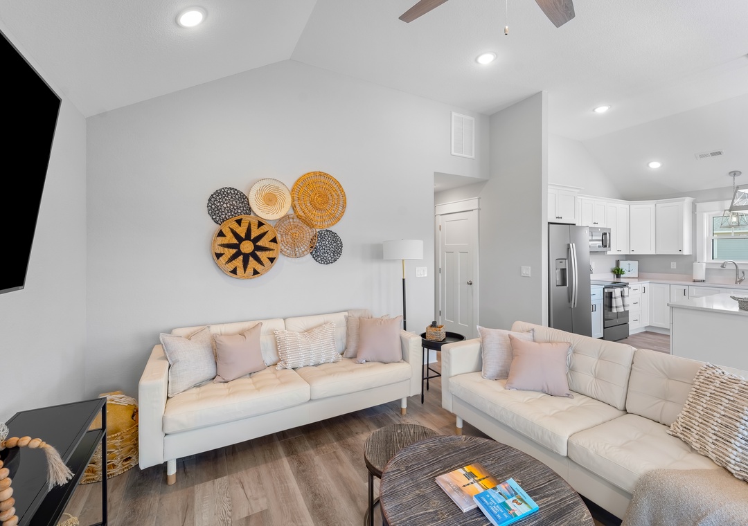 Inside, the living spaces are bright, new, and uncluttered, with central air conditioning and complimentary WiFi running throughout. Enjoy a modern kitchen with stainless steel appliances, a window-lined dining space, and a living room where you can gather for movies on cable and streaming services. Of the bedrooms, one is a spacious primary suite with vaulted ceilings and its own bathroom.