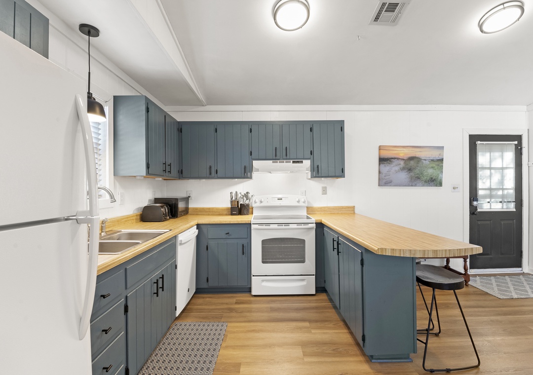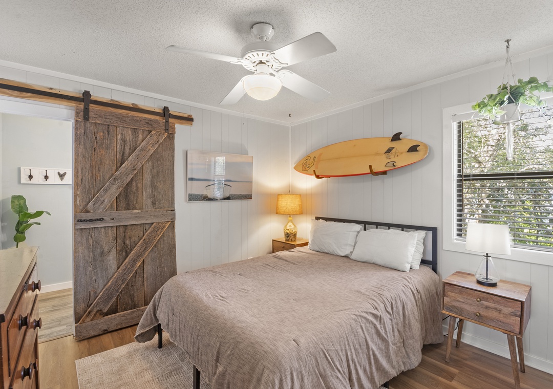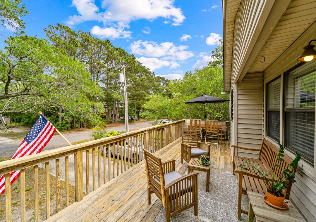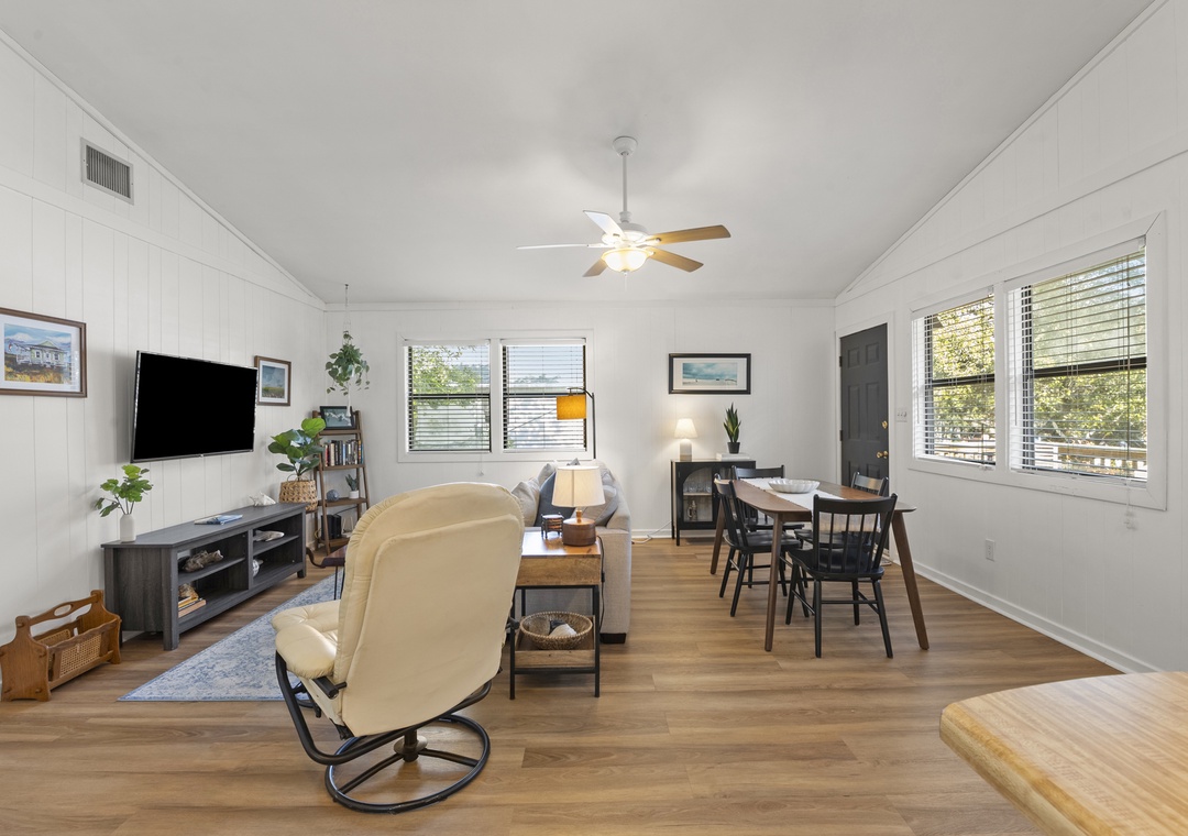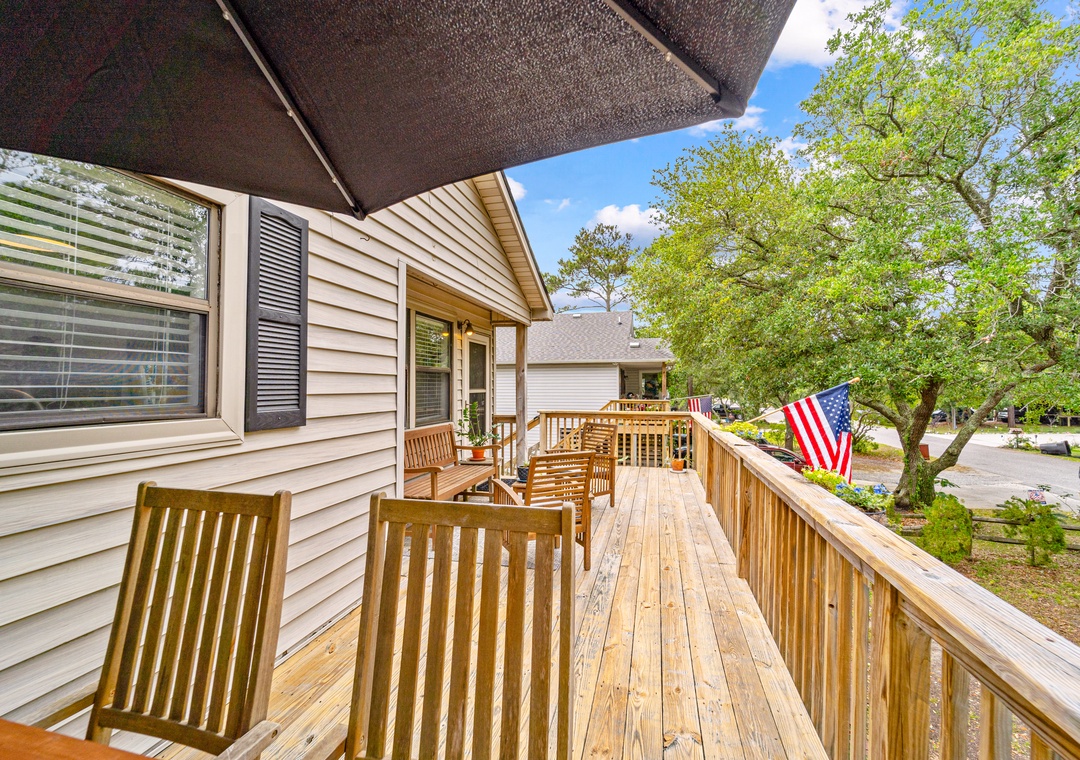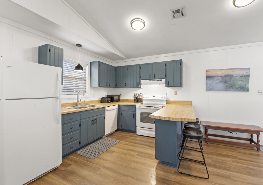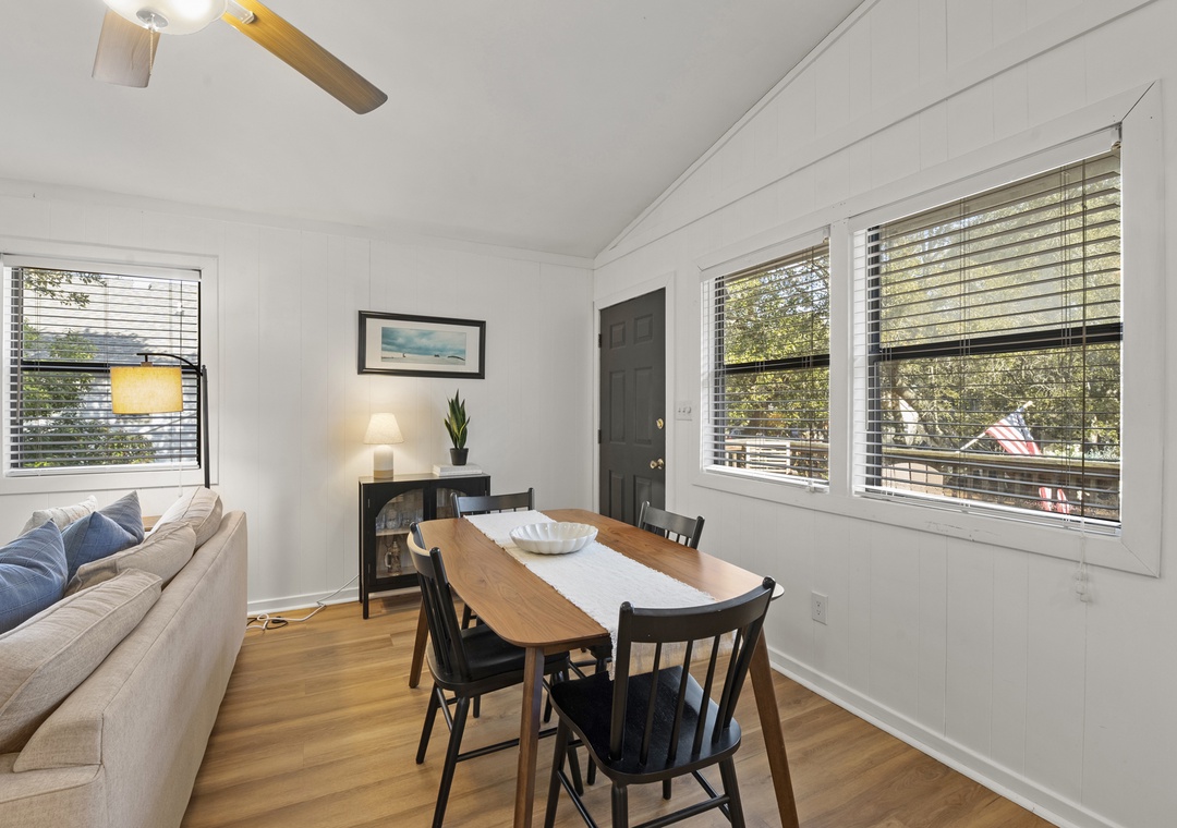 Upon entry, you'll find a bright interior and a cozy atmosphere throughout the well-appointed living area. Marvel at the contemporary decor, the beautiful wood flooring, and the blanket of natural light that radiates comfort from every corner. Prepare grand meals and beach picnic snacks in the kitchen, equipped with ample cupboard room, a breakfast bar, and a formal dining table. Get a comfortable night's rest in either of the bedrooms, boasting luxe linens and plush beds. Enjoy the oversized walk-in oversized shower after a long day of activities. Sip coffee or cocktails on the expansive deck and admire the view, or go down below for a game of Ping-Pong or relax in the hammock.