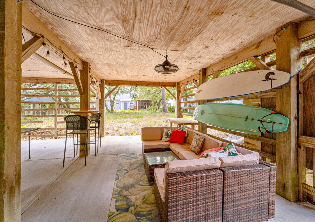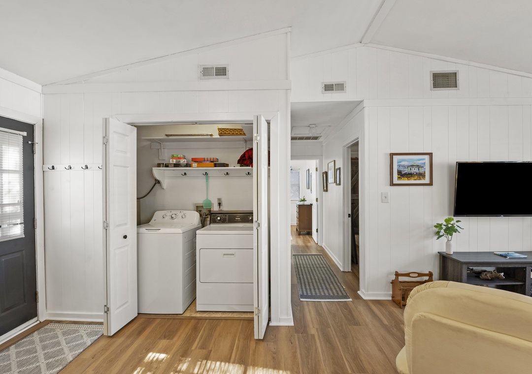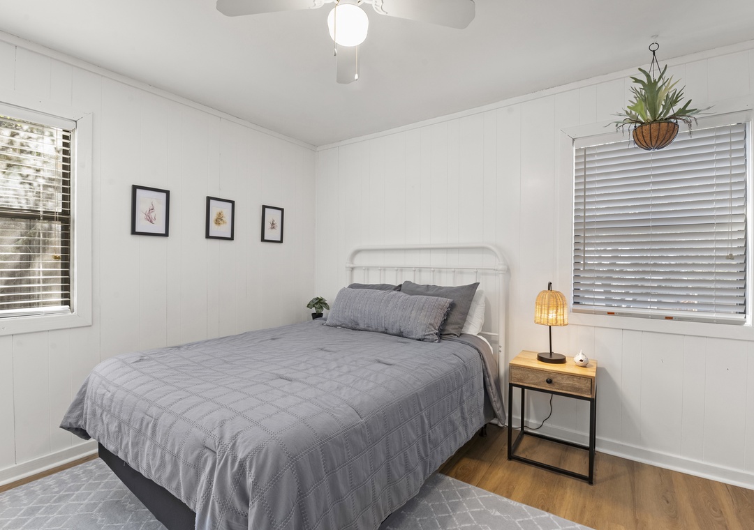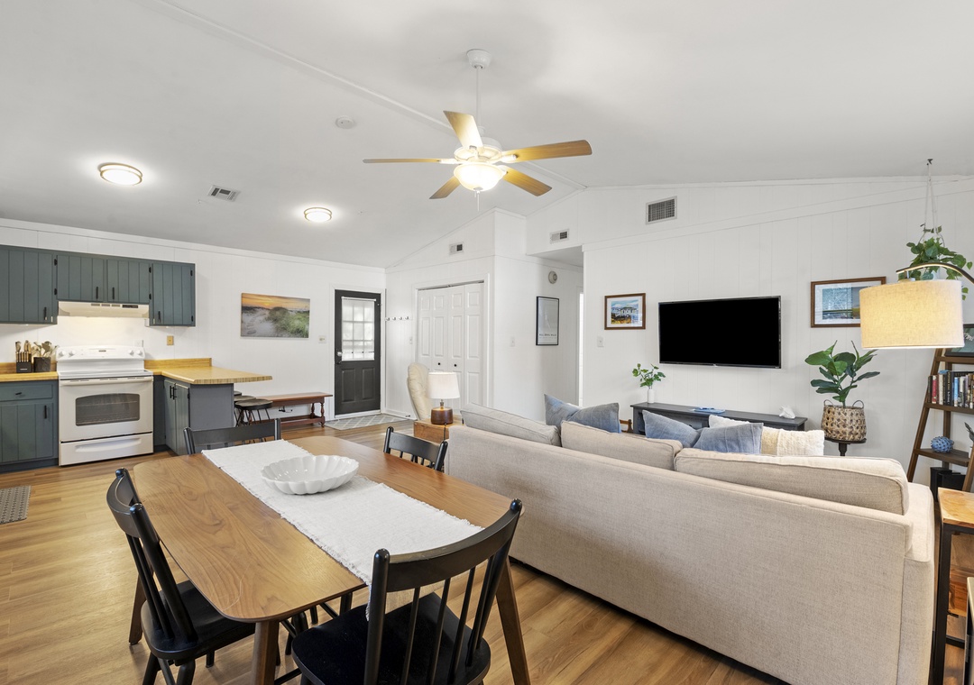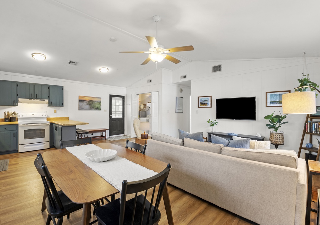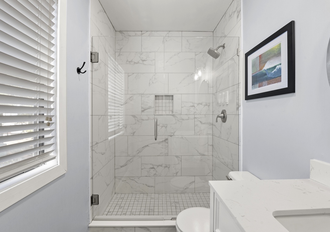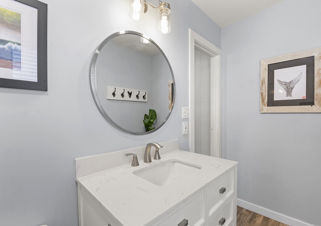Upon entry, you'll find a bright interior and a cozy atmosphere throughout the well-appointed living area. Marvel at the contemporary decor, the beautiful wood flooring, and the blanket of natural light that radiates comfort from every corner. Prepare grand meals and beach picnic snacks in the kitchen, equipped with ample cupboard room, a breakfast bar, and a formal dining table. Get a comfortable night's rest in either of the bedrooms, boasting luxe linens and plush beds. Enjoy the oversized walk-in oversized shower after a long day of activities. Sip coffee or cocktails on the expansive deck and admire the view, or go down below for a game of Ping-Pong or relax in the hammock.