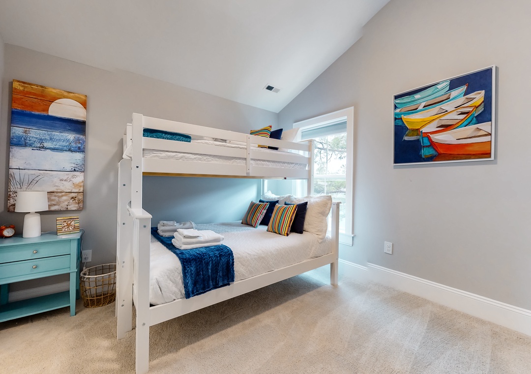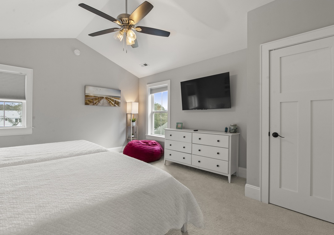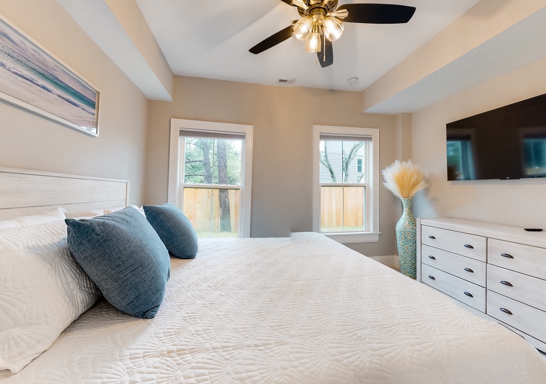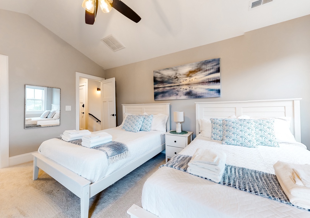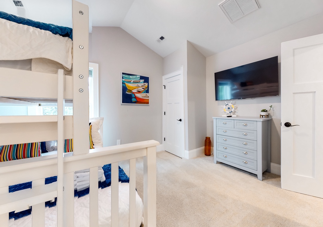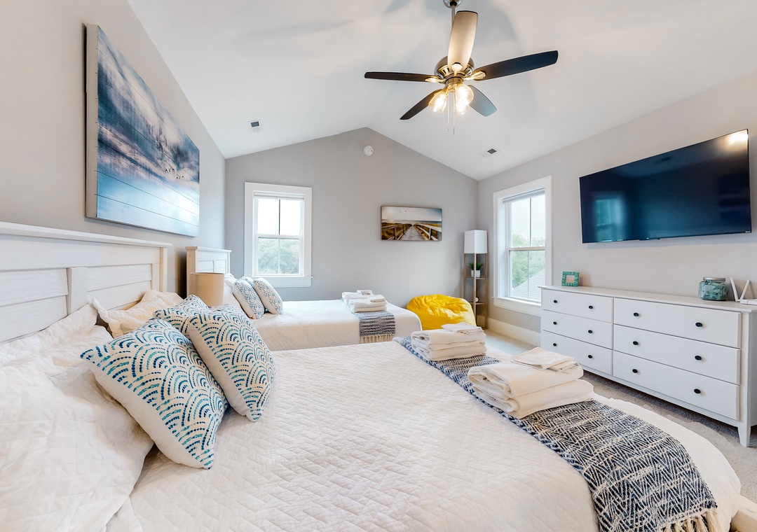 The upper level of the home features two bedrooms, equally bright and airy with their soft touches of nautical decor, private TVs, and plush linens.