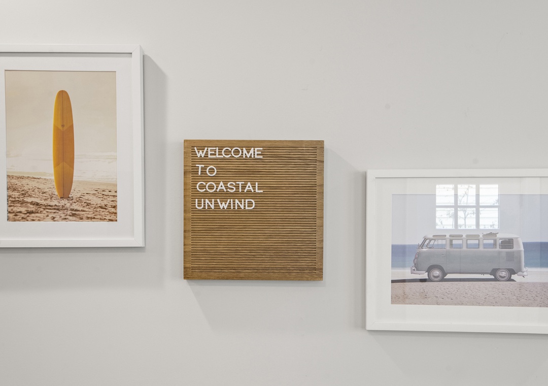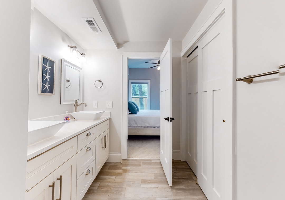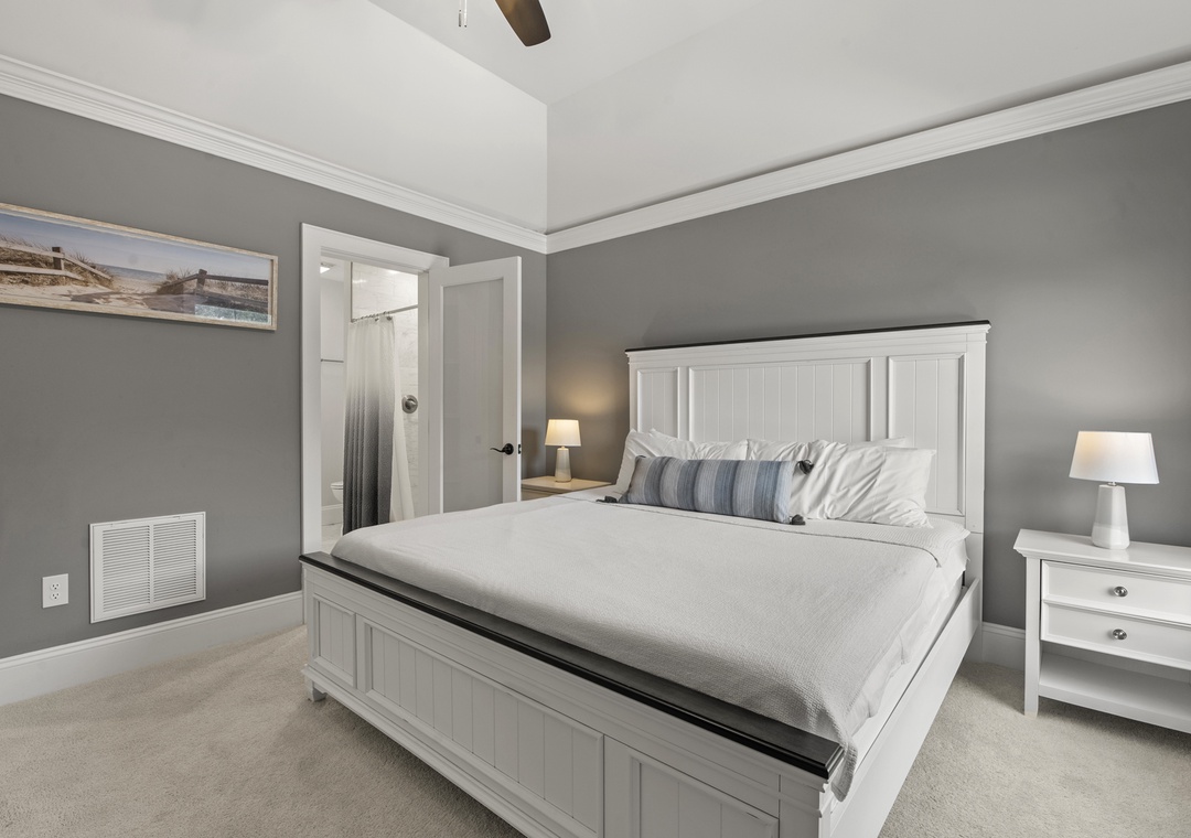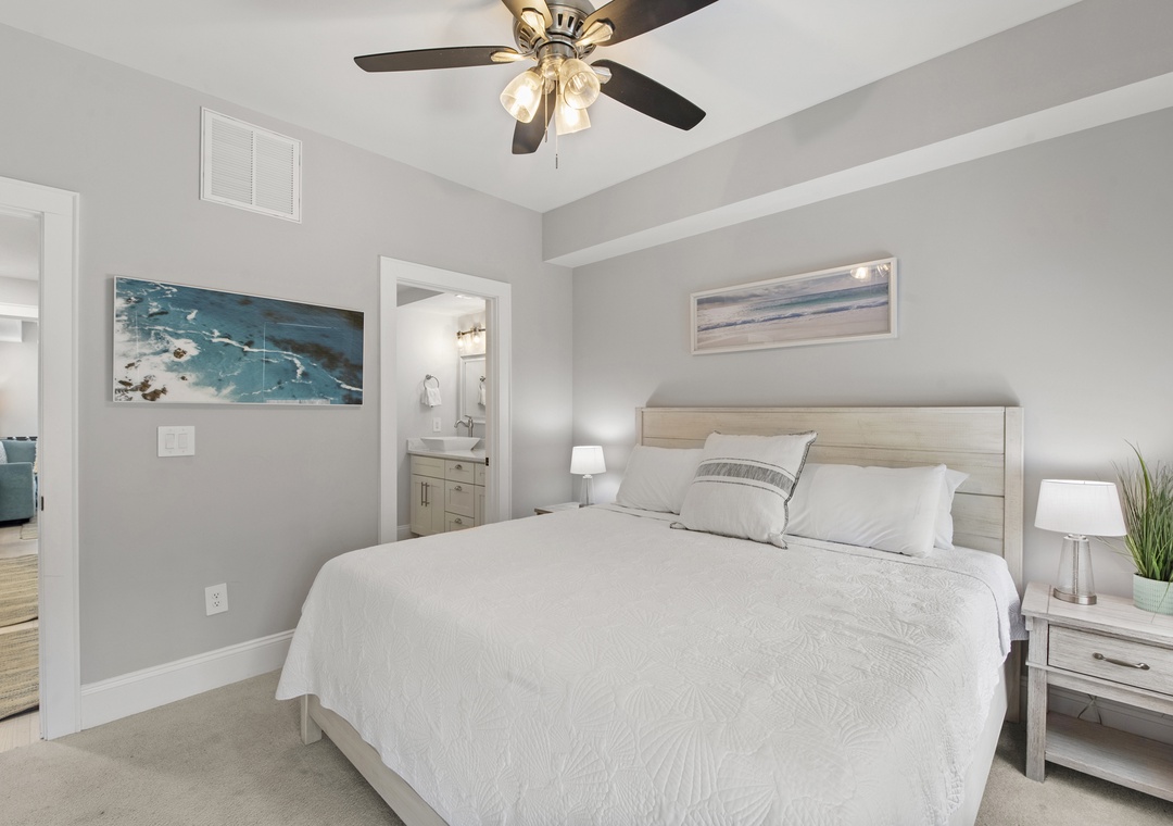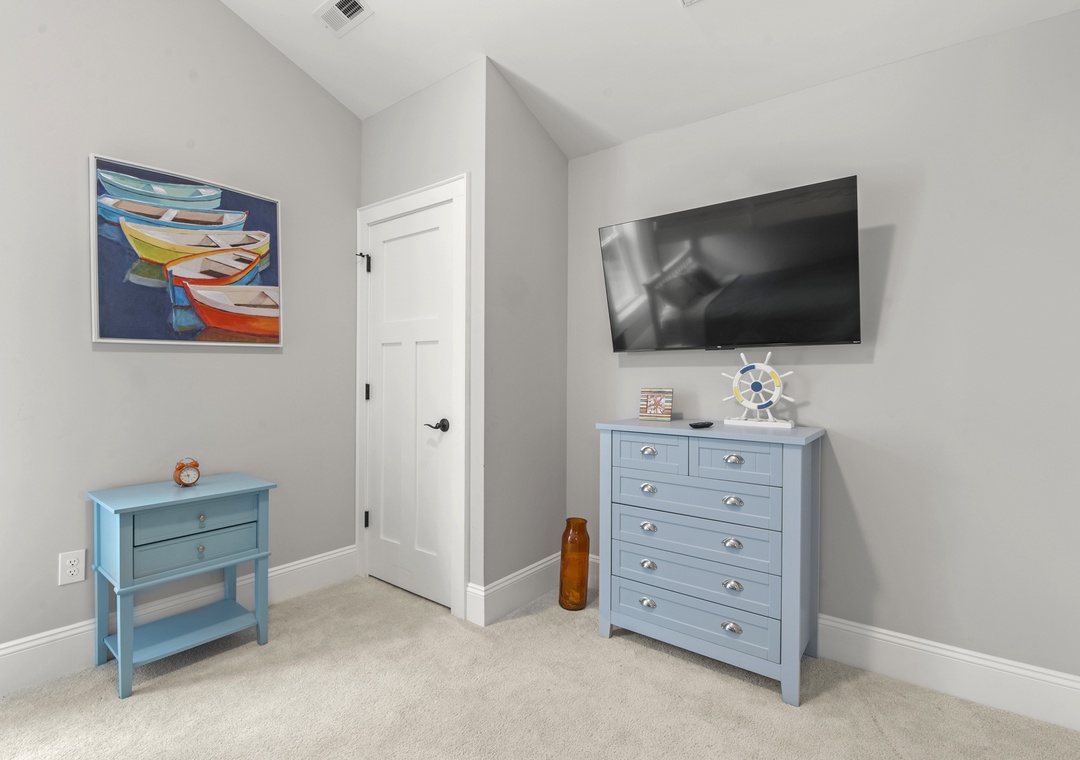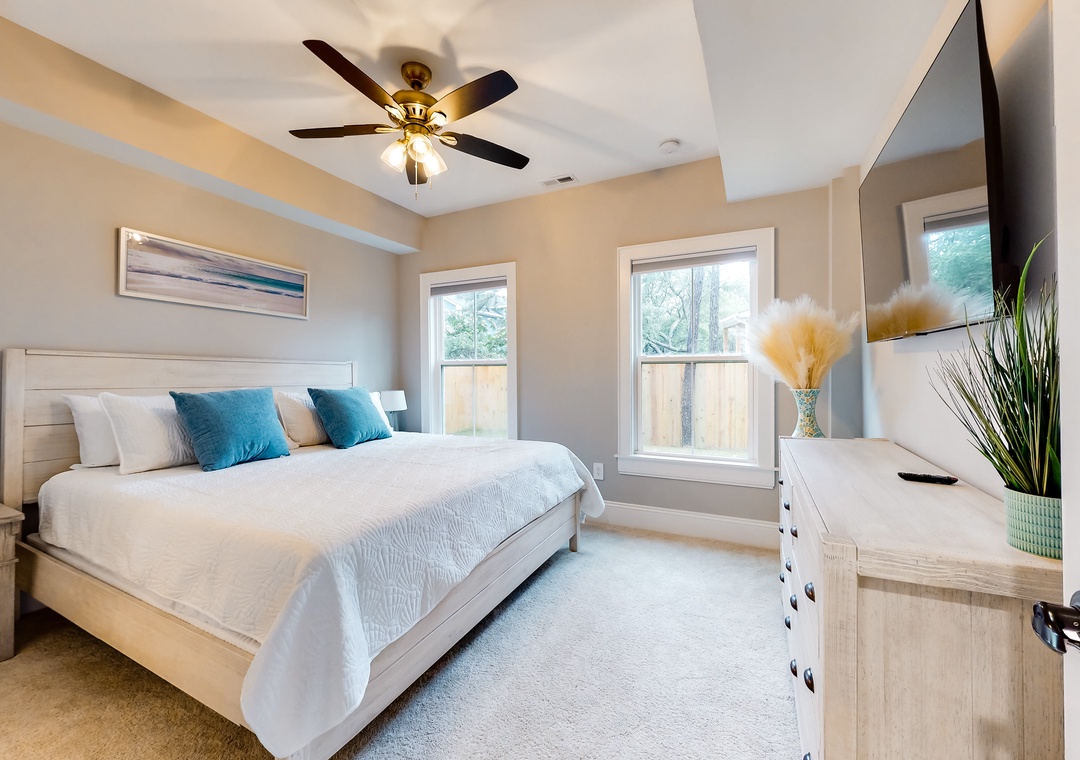 The upper level of the home features two bedrooms, equally bright and airy with their soft touches of nautical decor, private TVs, and plush linens.