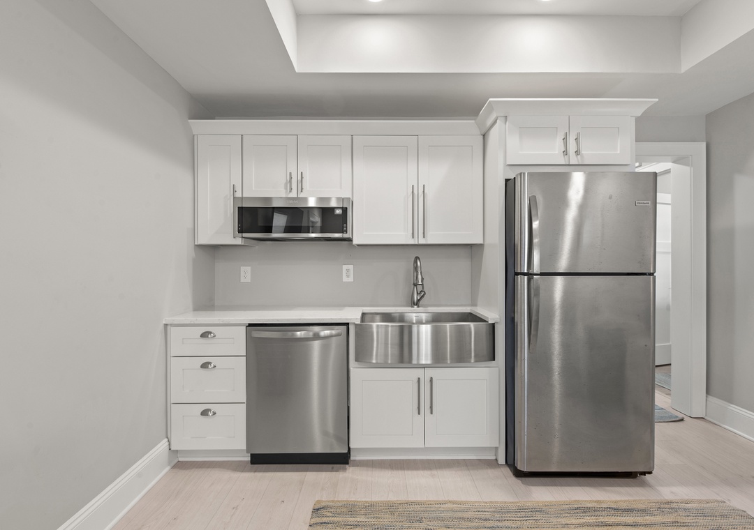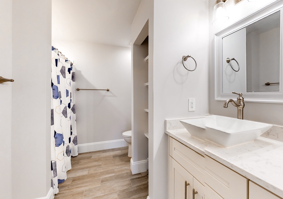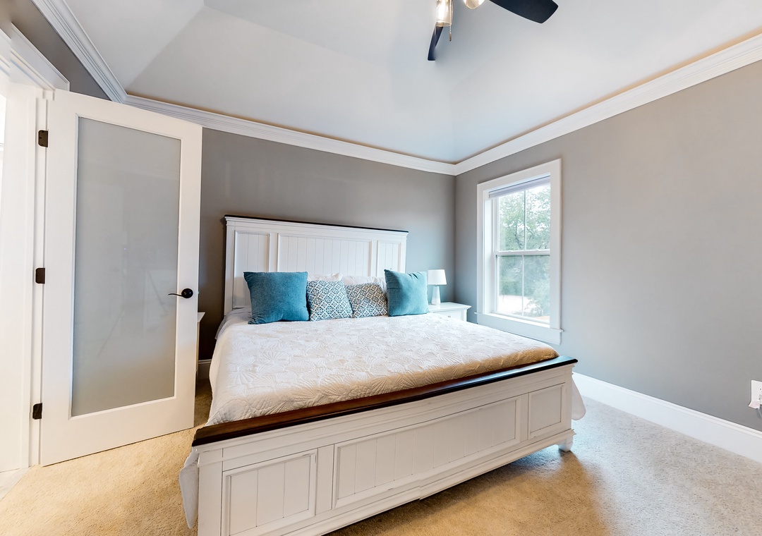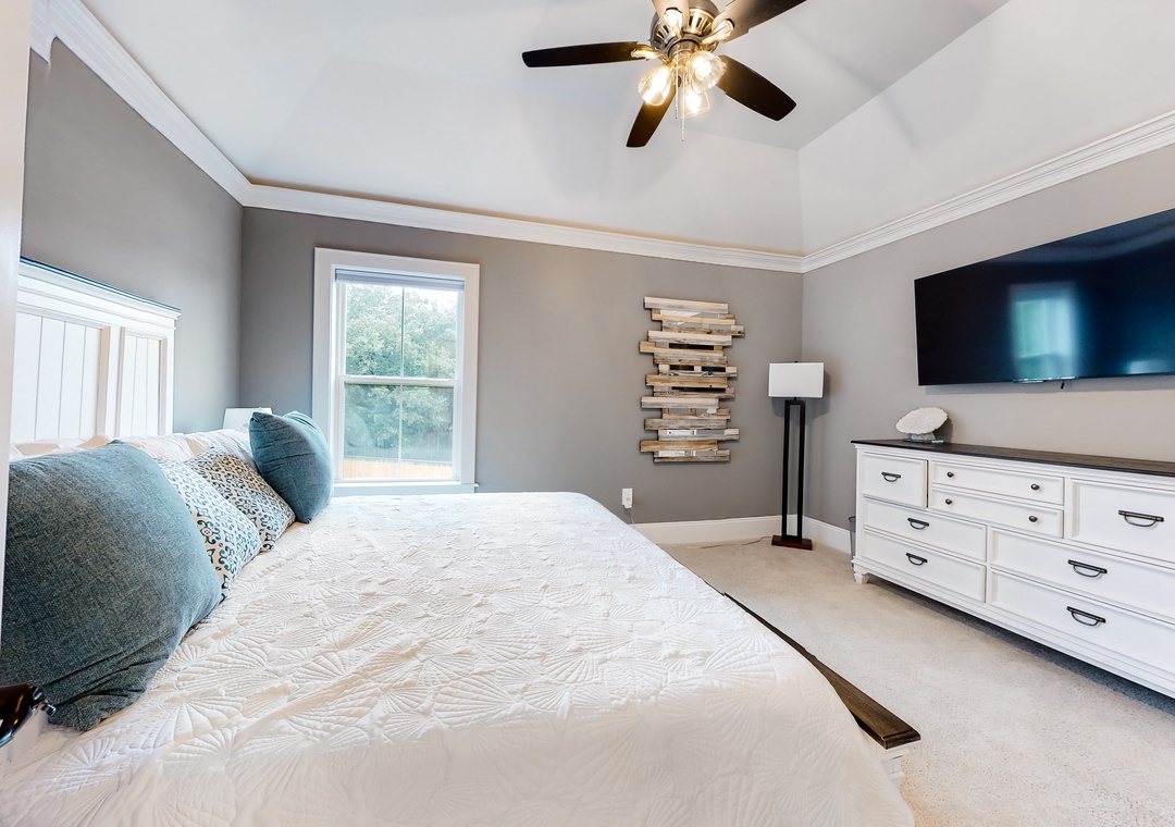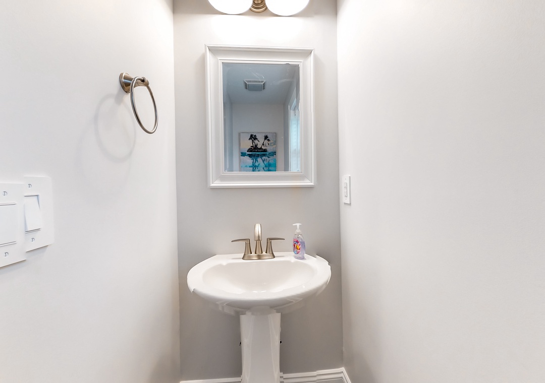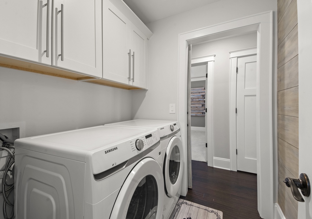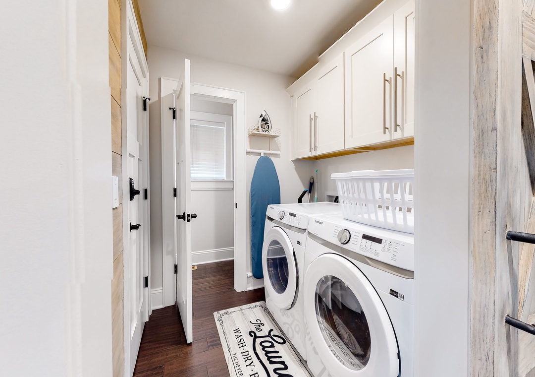 The main level of the home features a glimmering kitchen with stainless steel appliances, a center island, quartz countertops, and turquoise accents. When mealtime rolls around, gather around the cozy dining table for a family-style meal. After eating, kick your feet up and stream your favorite TV shows in the sunny living room, all while being warmed by the heat of the electric fireplace. Also on the main level of the home, you'll discover a separate laundry room and a primary en suite bedroom.