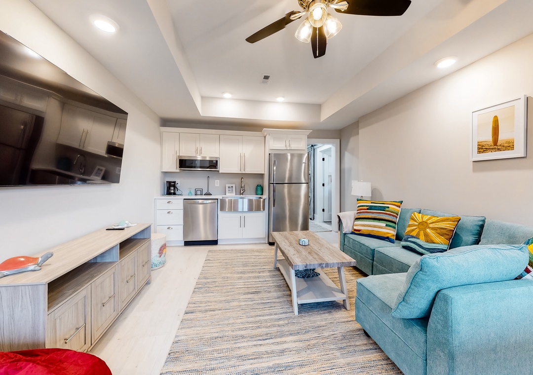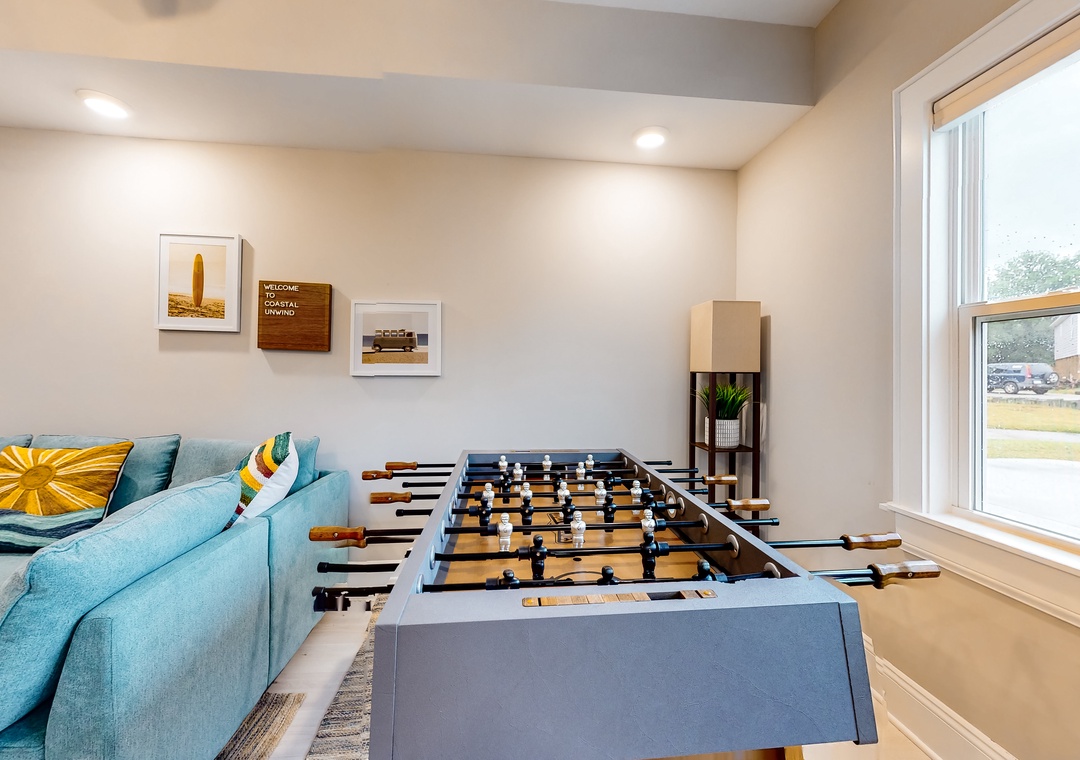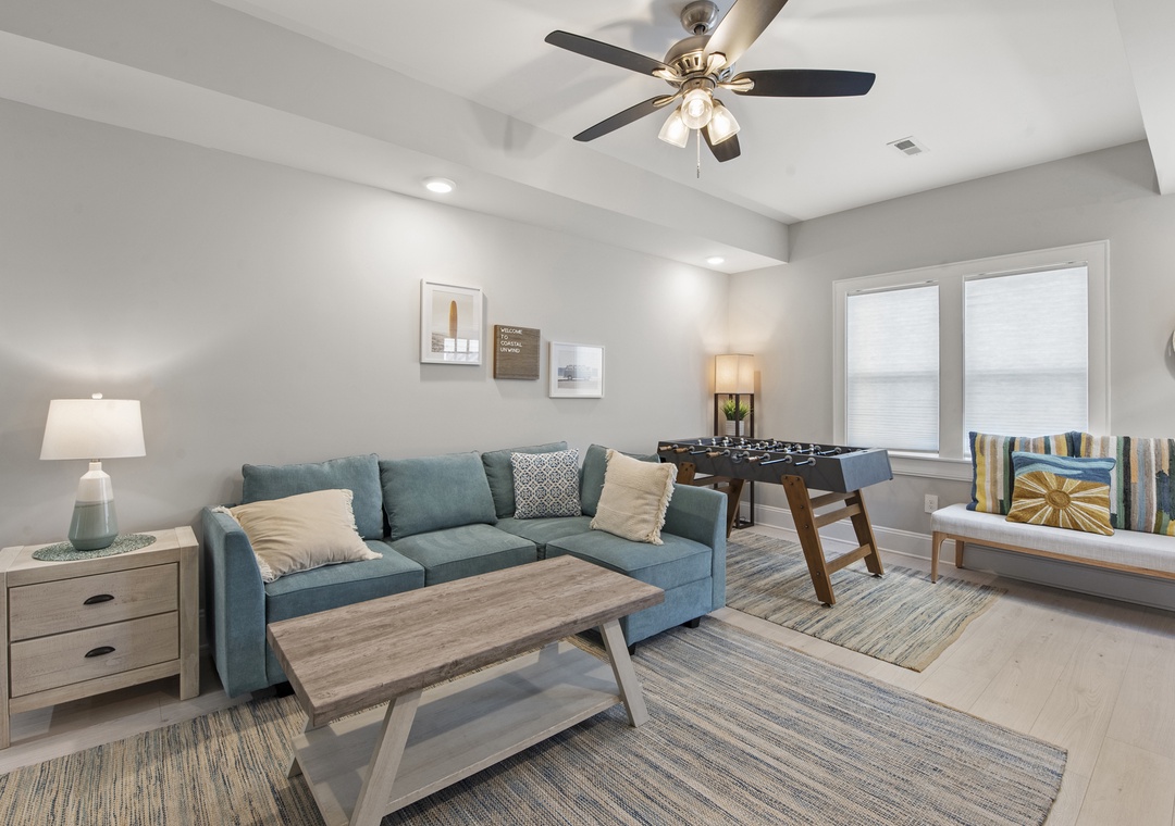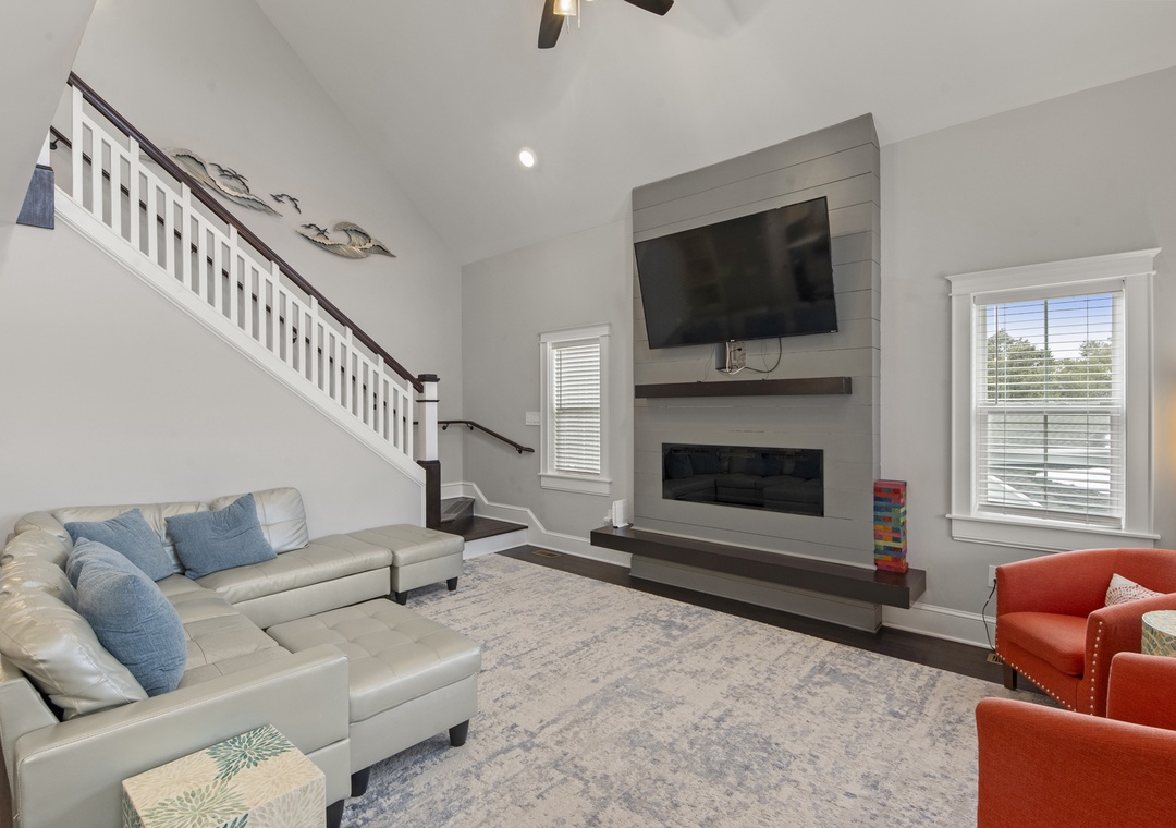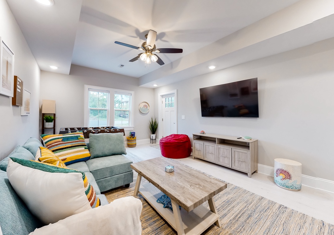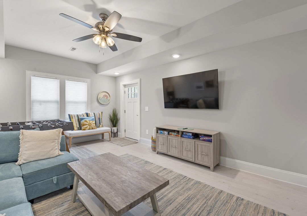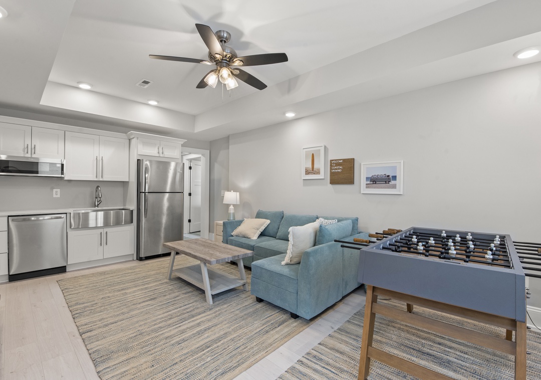 Downstairs, the kids are sure to love the home's foosball table, giant Jenga, and board games. The adults will appreciate the additional kitchenette - equipped with a full-sized fridge, microwave, dishwasher, and additional dishware. A second primary suite is available on this level. Central air-conditioning rounds out the home's interior perks.