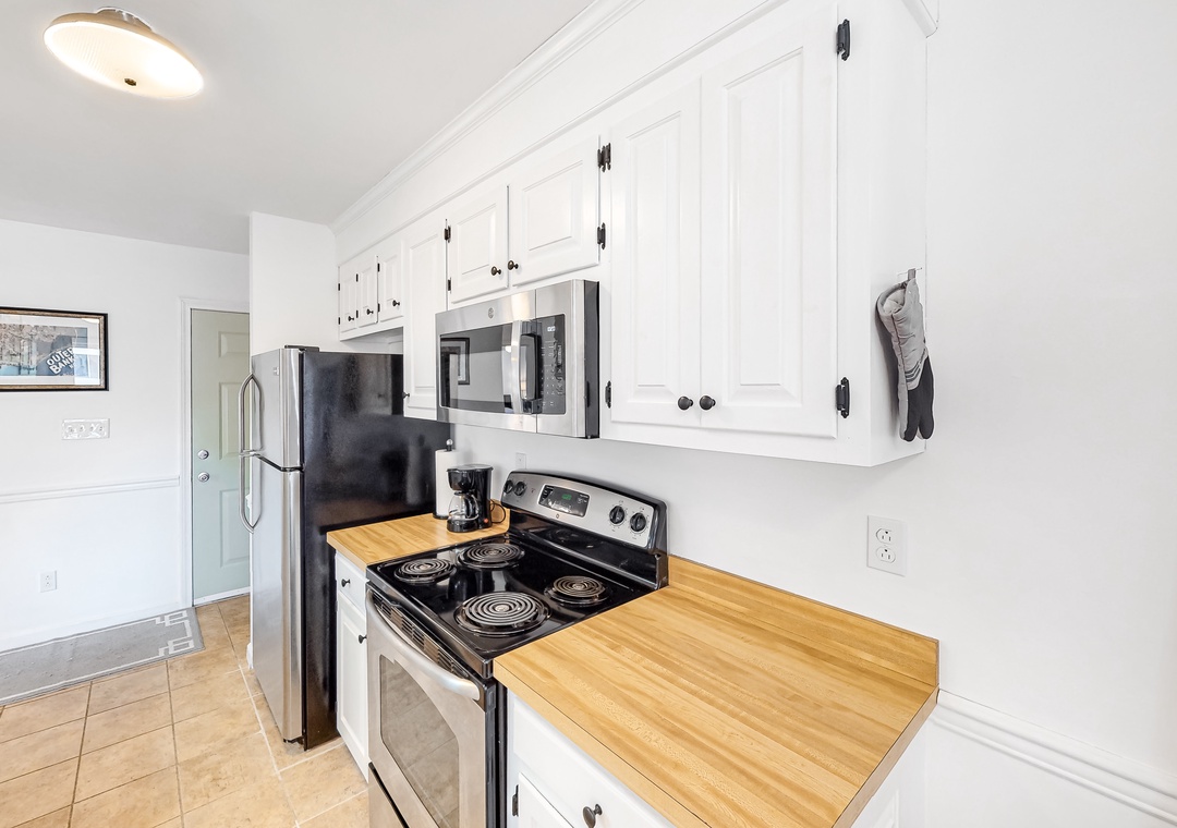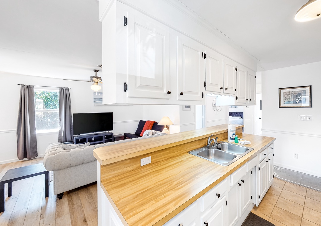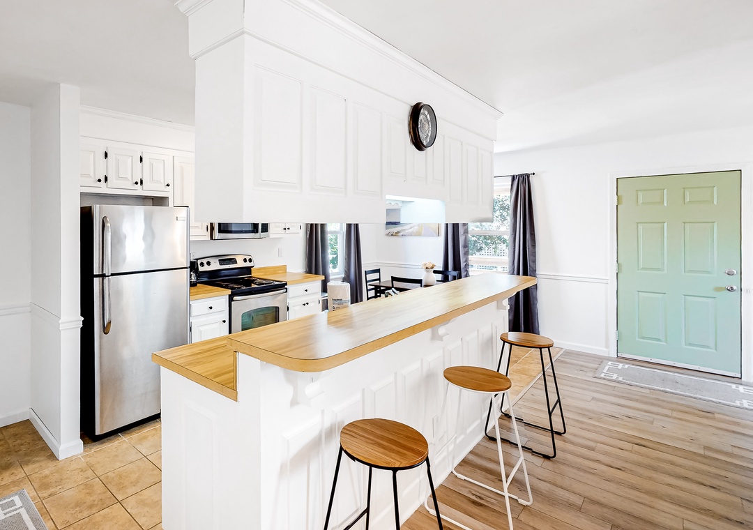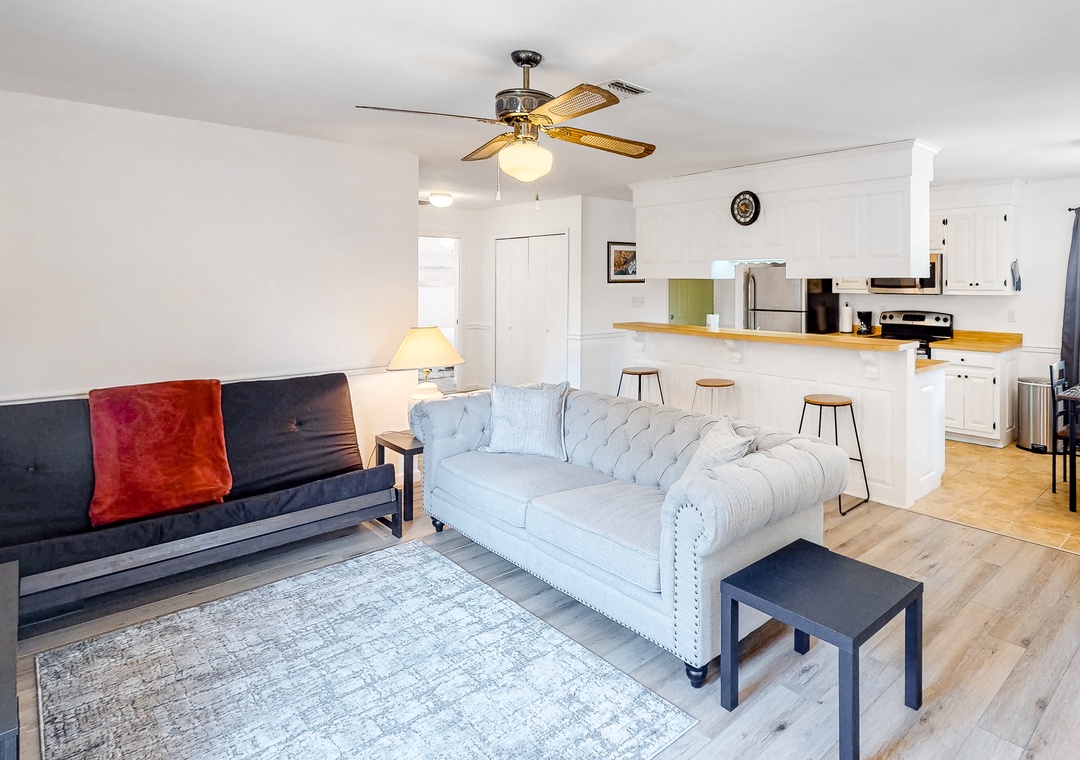 Inside, this light-filled retreat has a cozy living area with two sofas in front of a 55' LED Smart TV–you can stream your favorite shows and watch any sports game you want! The fully-equipped kitchen has stainless steel appliances, including a full-size fridge, stove, oven, and microwave. The breakfast bar seats up to three with high stools and is a great addition to the four-person dining table.