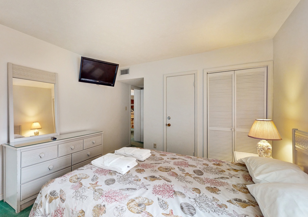 The master bedroom features a queen-size bed, a separate full bathroom, and a patio entrance, while the spacious second bedroom offers two twin beds and a second full bathroom off the hall. The comfortable living room includes a queen-size pullout bed for additional sleeping space. Enjoy entertainment with flat-screen TVs.