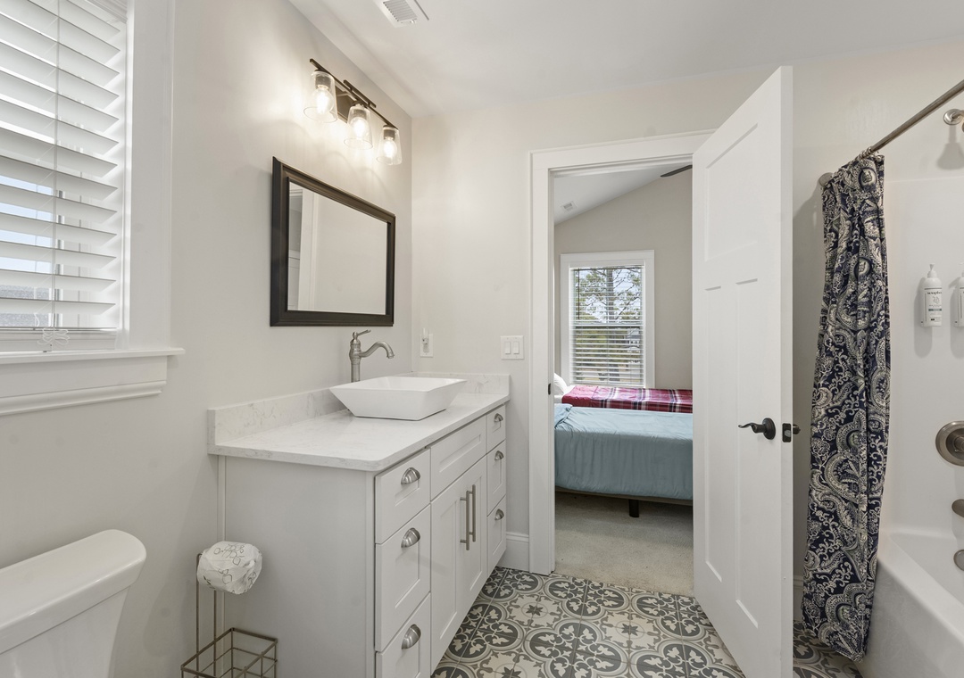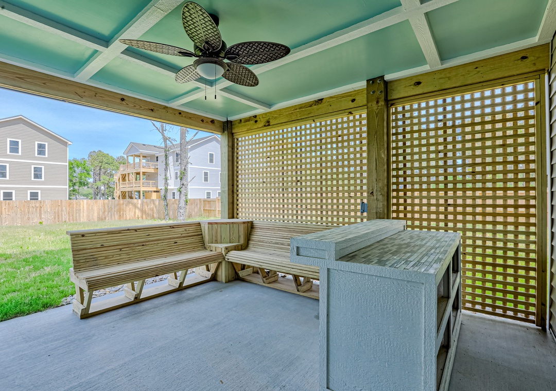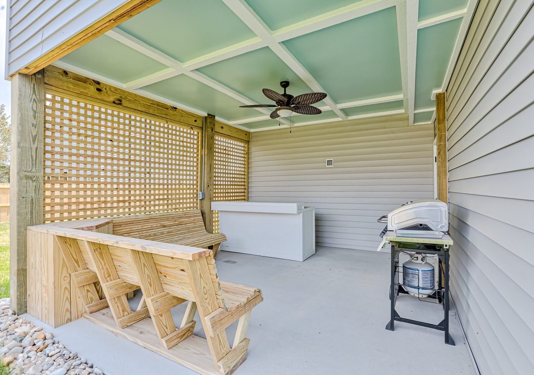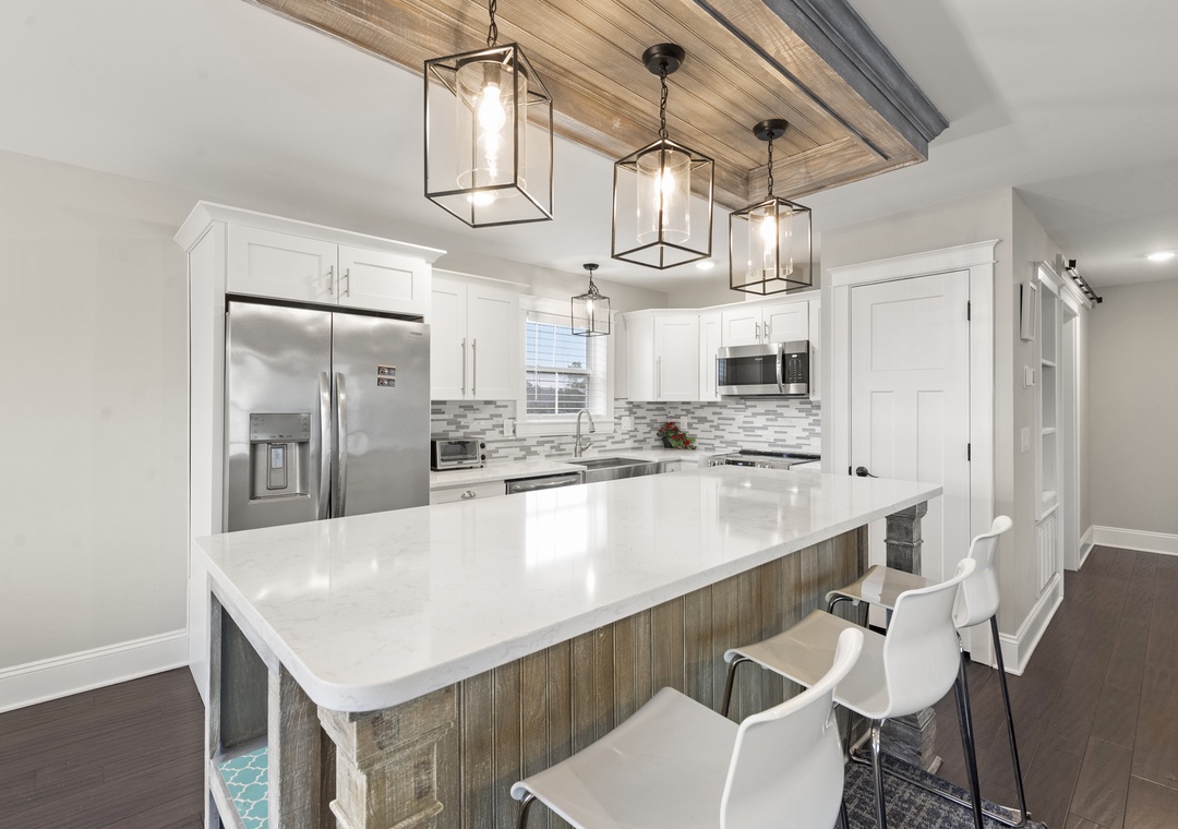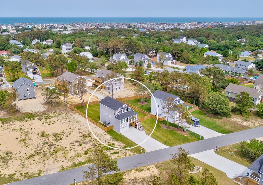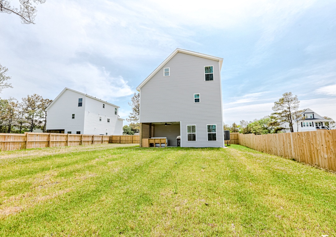 Located close to beaches, nature preserves, and historic sites, this two-story, newly-built vacation rental is a peaceful, full-featured choice for your next getaway to the Outer Banks. Outer Banks Kayak Adventures and Run Hill State Natural Area are both just a half mile away. Climb the steps, cross the front porch, and pass through the door into a bright, open living space with a vaulted ceiling, comfortable furnishings, and a large TV for streaming your favorite channels. Nearby, visiting chefs will find everything they need in the well-equipped, full kitchen complete with stainless steel appliances and an island with counter seating, while more formal meals can be enjoyed at the dining table. Head downstairs and out to the shaded patio where you'll find a bar, comfortable bench seating, a gas grill, and access out to the large, fenced yard where the kids can run and play! You'll love soaking in the private hot tub after a long day of adventure.