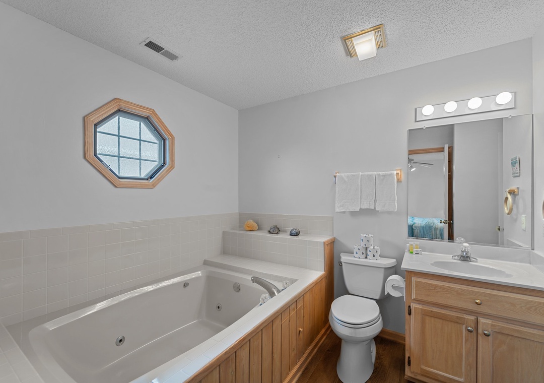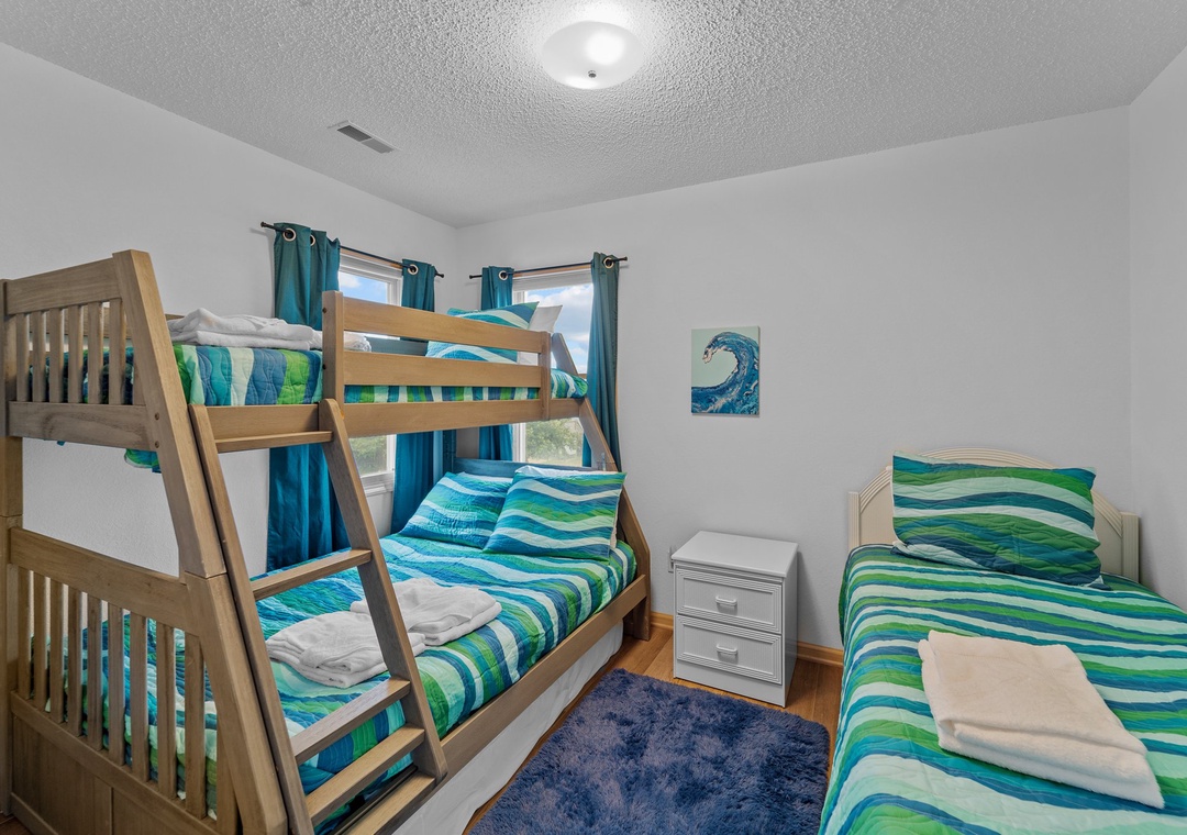 Inside, the house boasts a spacious and open layout, ideal for families. The loft area serves as a great hangout spot for kids and teens, offering a separate space for entertainment. With a well-equipped kitchen, comfortable bedrooms including a king bed, queen bed, double bed, twin bed, and bunk bed, as well as a sofa bed, this home accommodates families of all sizes. Amenities such as a jetted tub, central AC, washer/dryer, and internet ensure a comfortable stay for guests.