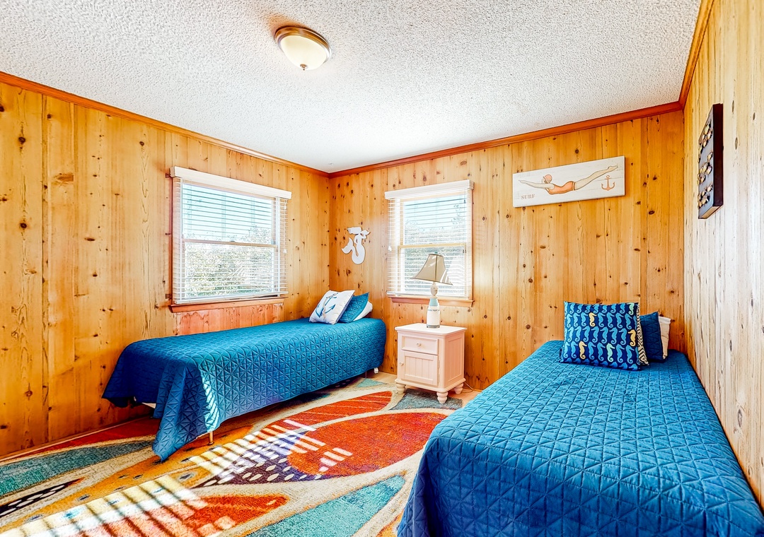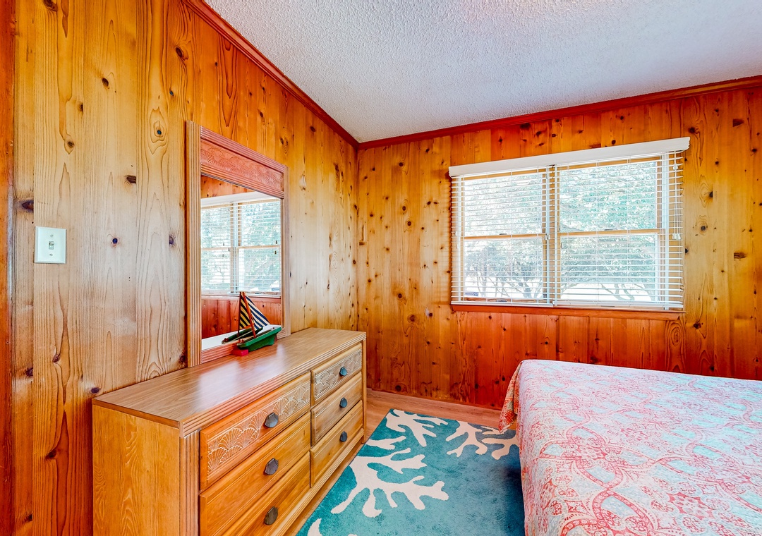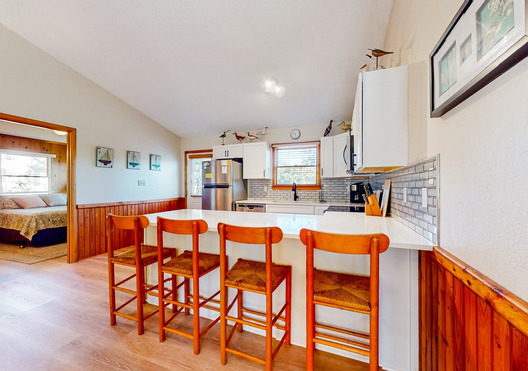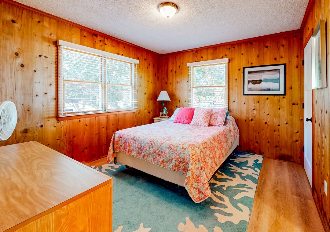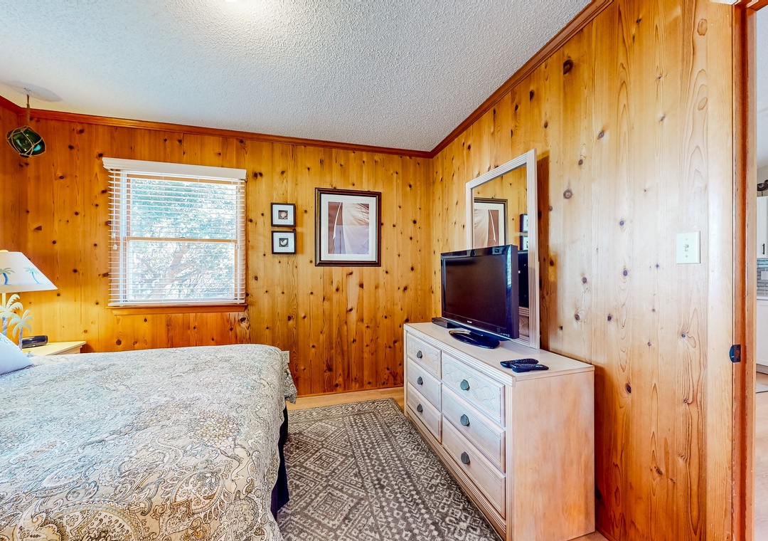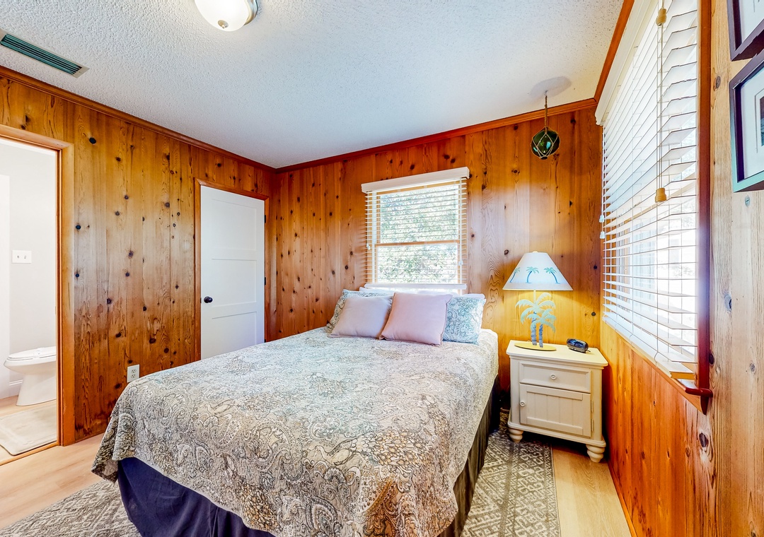 Wood-lined and sizable, the four bedrooms come adorned with soft linens, central air, and tasteful pieces of artwork. Rounding out the interior amenities, appreciate having access to a private washer/dryer and internet.