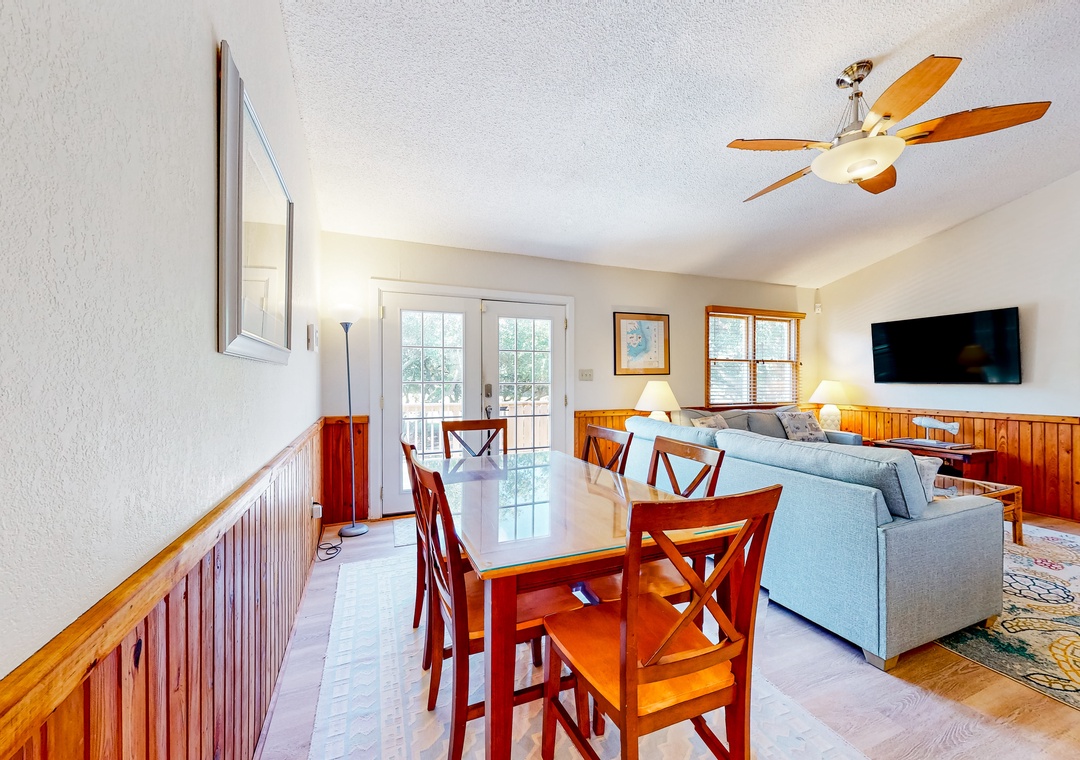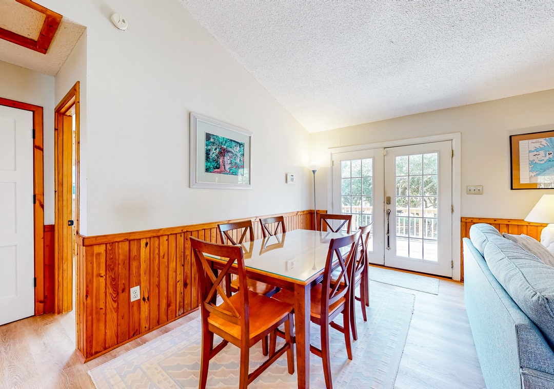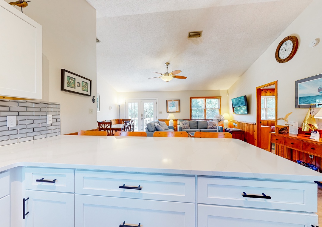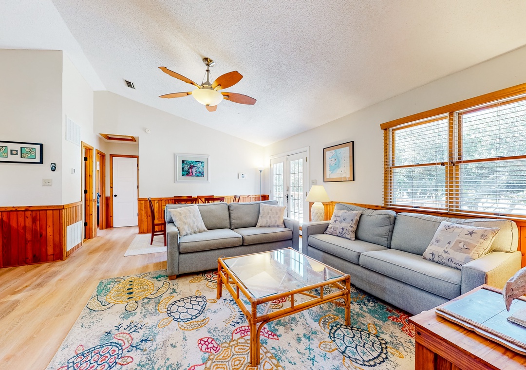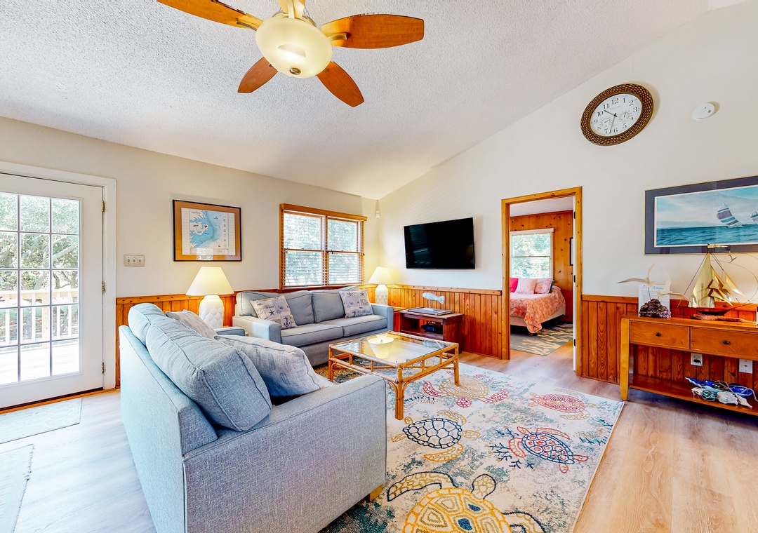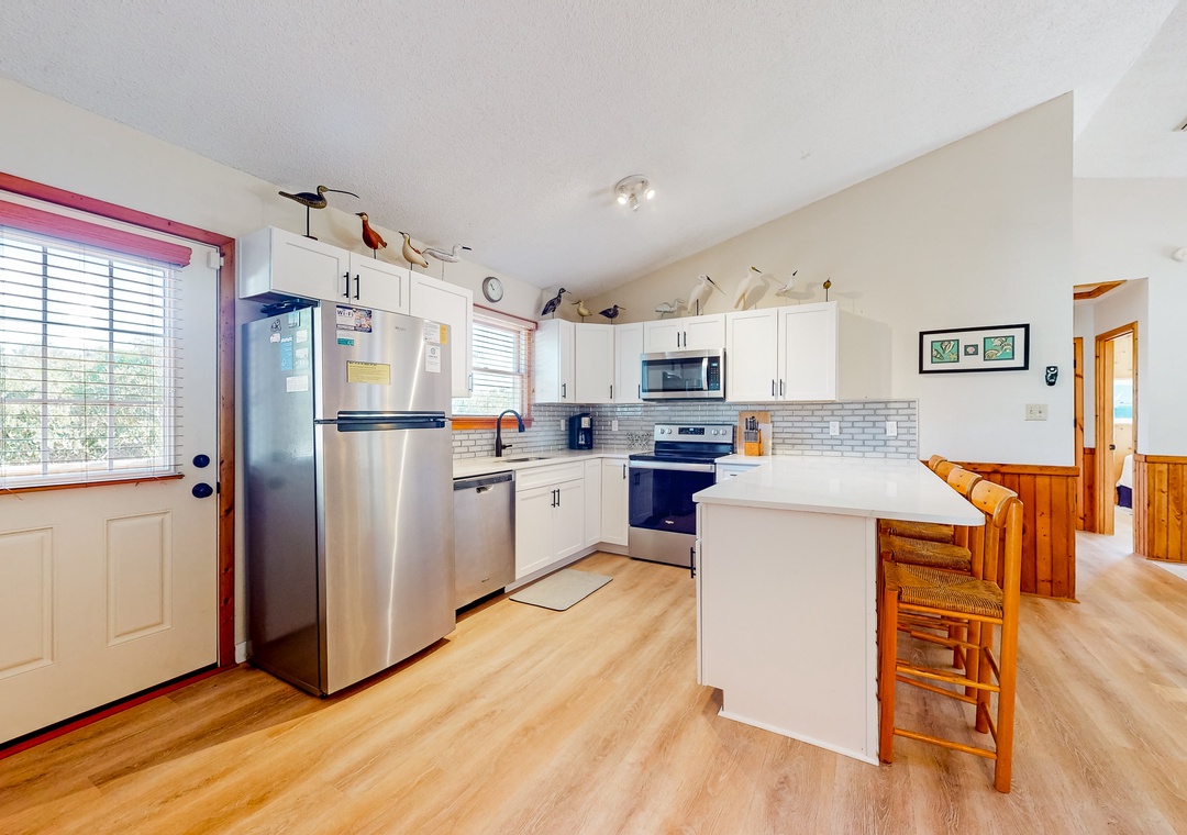 Indulge in a sun-soaked coastal retreat when you book a stay at this Kitty Hawk home! Spacious and decorated in a nautical theme, the interior of Blue Heron Perch boasts an open-concept layout and modern amenities. All of your culinary ventures can be practiced with ease amidst the full kitchen's stainless steel appliances and gleaming countertops. Relaxing nights in can be achieved in front of the living room's large Smart TV.