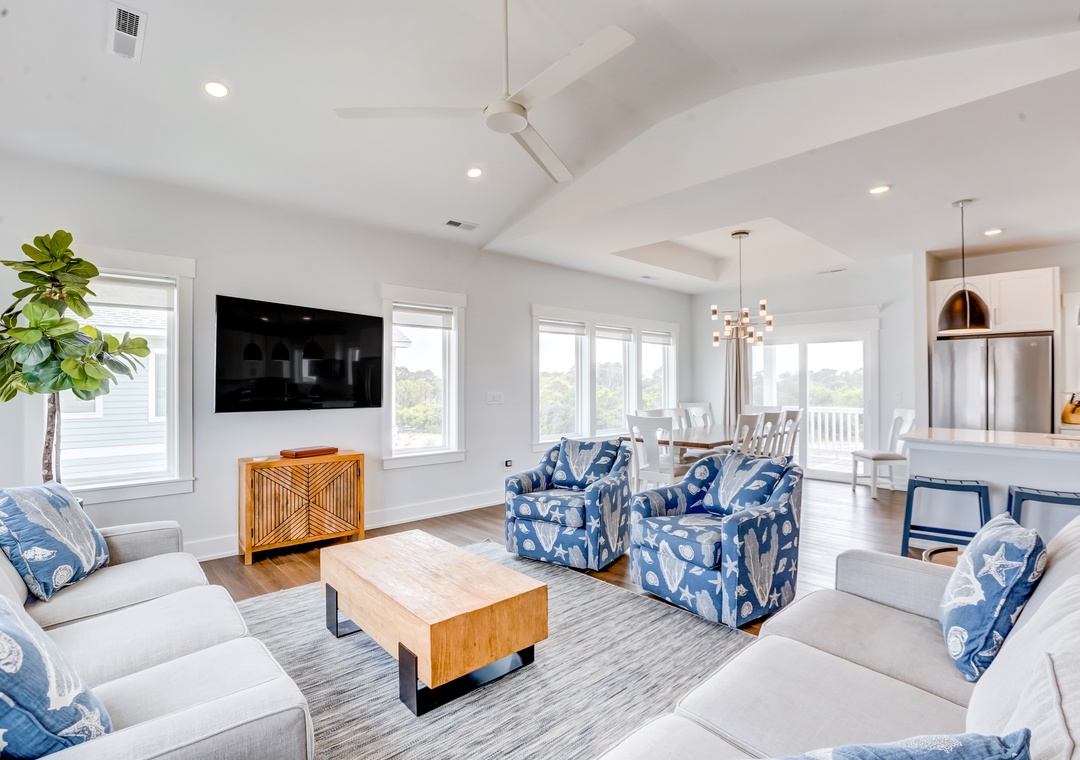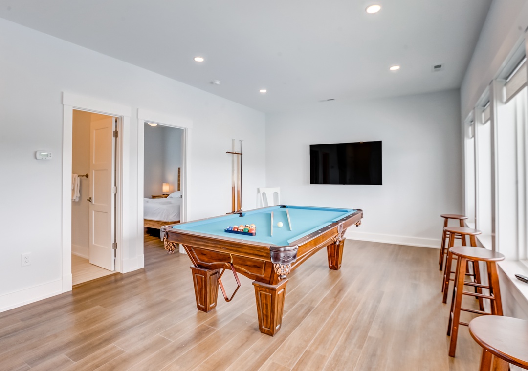 This home exudes strong feelings of comfort and warmth. Step inside and enjoy the sunshine-soaked living area where plush seating awaits. Adjacent to the living area is the kitchen. Modern, clean, and bright, it beckons to harbor great conversation and shared moments of love over delicious homemade meals. Stainless steel appliances, a dishwasher, and little bursts of color make the kitchen what it is. Off the main room head out onto the balcony to soak in the sun and relish a morning cup of coffee. A large walk-in shower and double sinks lead to effortless mornings and evenings in the en suite bathroom. Balcony access is also available throughout the home, and from most of the six bedrooms, allowing all the guests to enjoy the North Carolina sunshine. Find yourself playing a game of pool and catching up on your favorite TV show in the additional hangout space this home boasts.