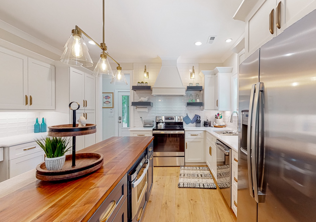 Inside the beautifully appointed interior of the home, you'll find nautical-themed mementos, comfortable furnishings, and an open-concept layout. Sit back and warm up in front of the heat of the electric fireplace, and stream your favorite shows and movies on the large TV. The adjacent kitchen is a culinary gem with its ample meal prep space, stainless steel appliances, and expansive center island.