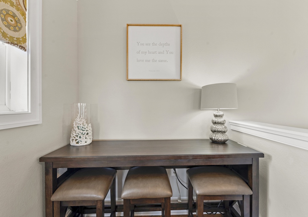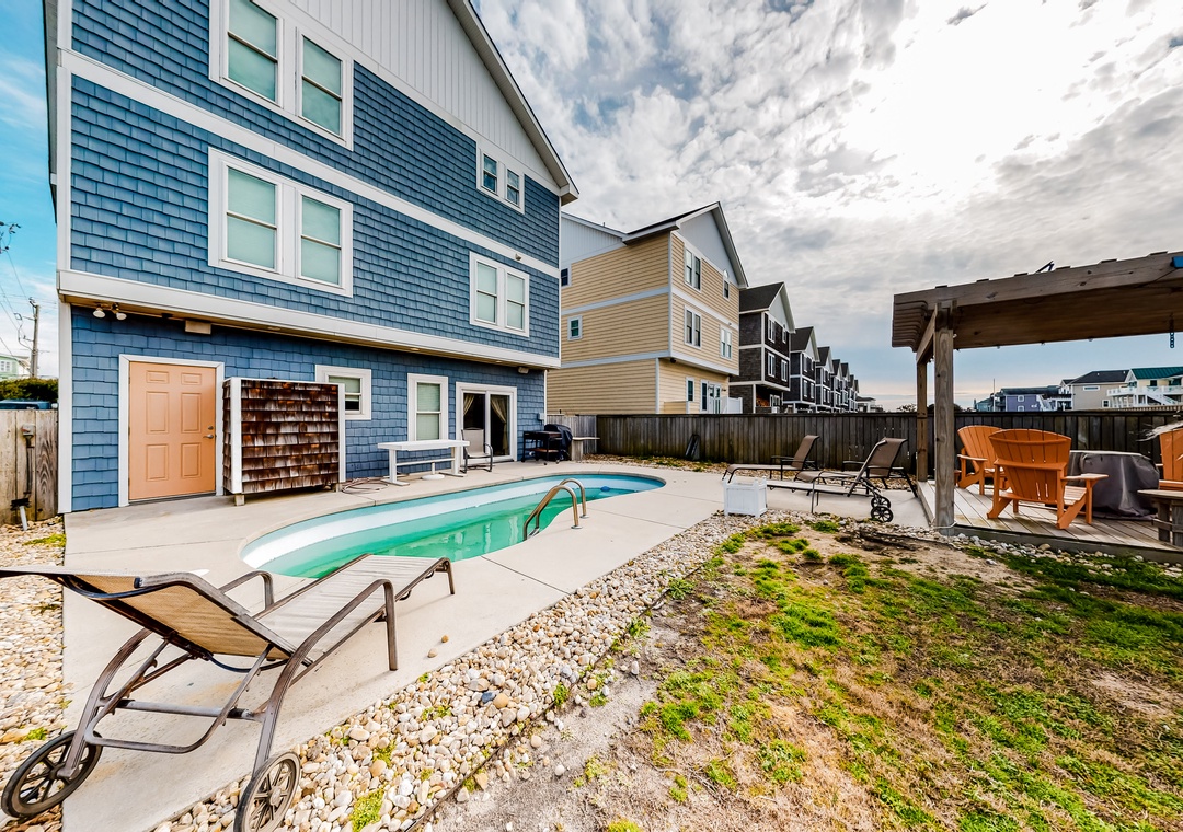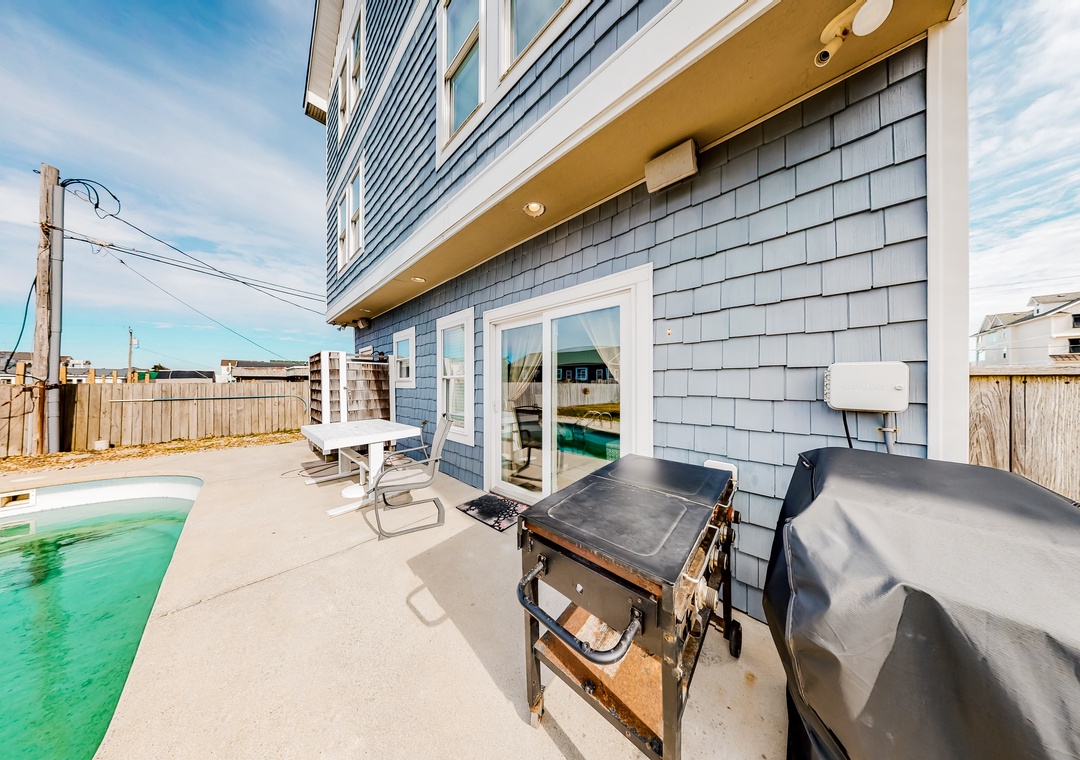 The inviting family room features a set of comfortable sofas in front of a smart TV and direct access to the enclosed backyard, which is all about fun and entertainment. The in-ground outdoor pool will be the star of the home, especially during hot summer days. Spend your days swimming or grilling delicious steaks, patties, or veggies on the gas grill. An outdoor dining area with a beautiful pergola allows you all to enjoy memorable meals alfresco while the beach loungers are ideal for sunbathing.