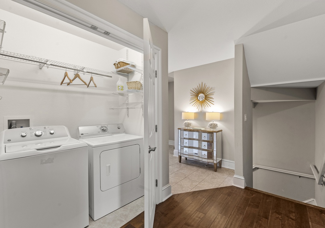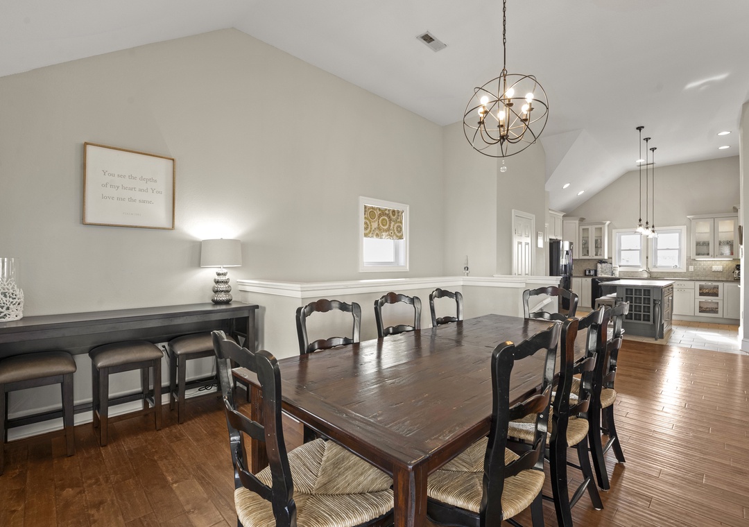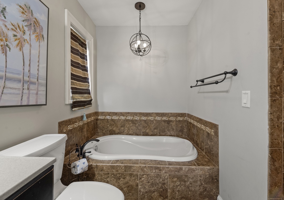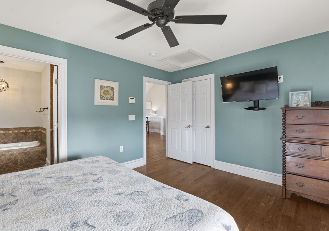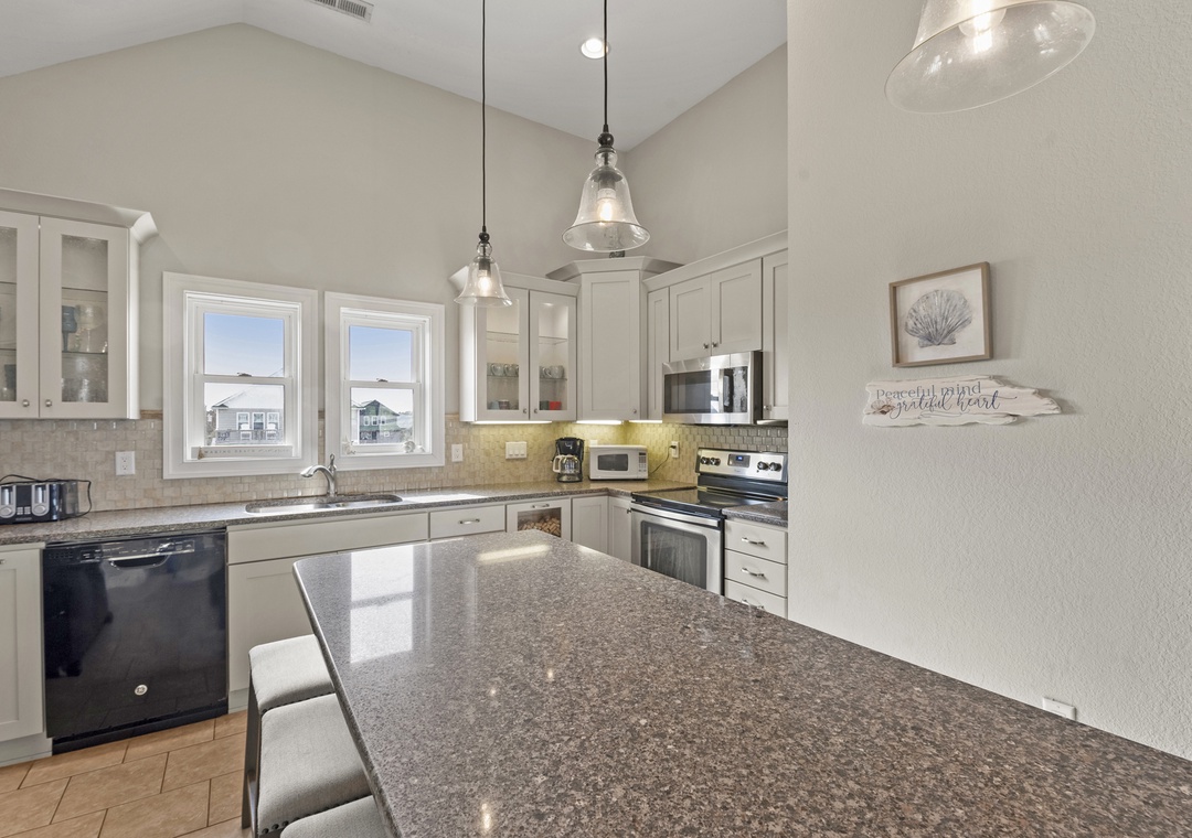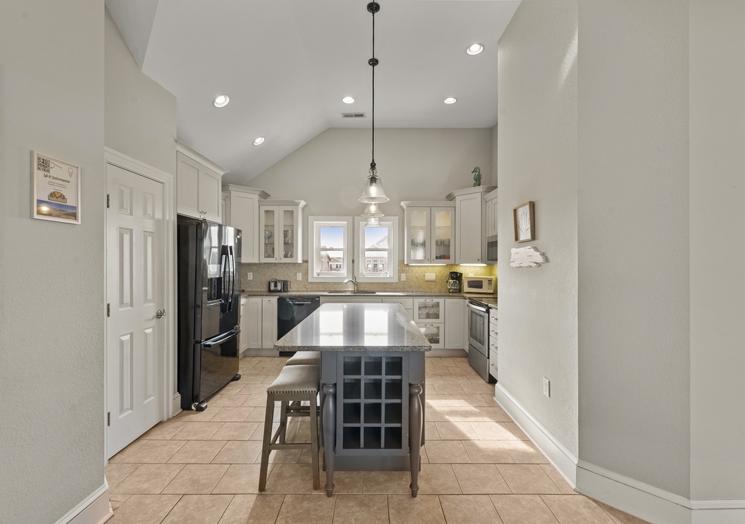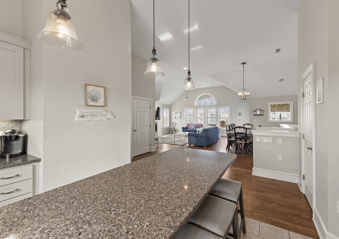 And last, but definitely not least, the third and upper level hosts the main living space of the home, along with the main bedroom, and a full bathroom. The living area has vaulted ceilings and plenty of windows to enjoy all the natural light coming in. Choose any of the comfortable sofas and snuggle up to watch your favorite show on the smart TV. Off the living room is a private balcony with a bistro table for two and extra seating. The open kitchen is appointed with all major appliances plus a dishwasher for easy cleanup, a Keurig coffee maker, and a four-person island to keep the chef company. The gorgeous dining table has enough space to seat eight people comfortably. The bedroom has a smart TV and an en suite bathroom with a separate soaking tub and a separate, large shower.