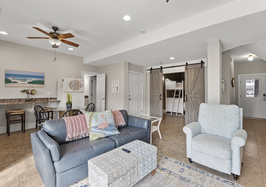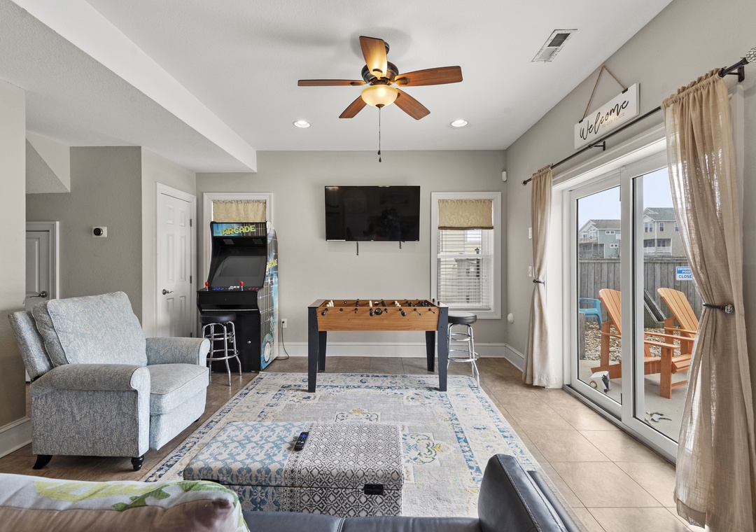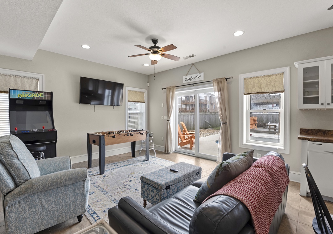 Inside the basement, discover a well-appointed kitchenette with a full-size fridge to store your goodies, a microwave, and a dishwasher. Two bedrooms share a full bathroom; both bedrooms have smart TVs with cable for added entertainment. There is also a family room with a foosball table and arcade system! And a SmartTV for watching the big game or connecting your gaming system, which is perfect for the kids.