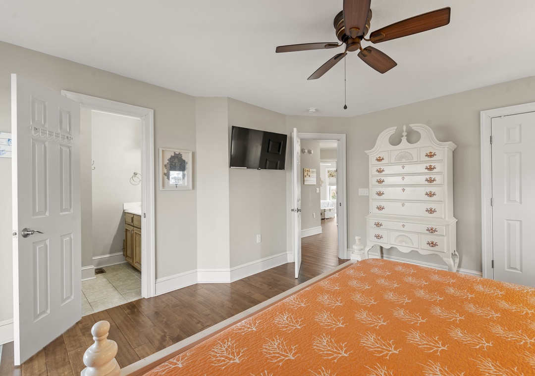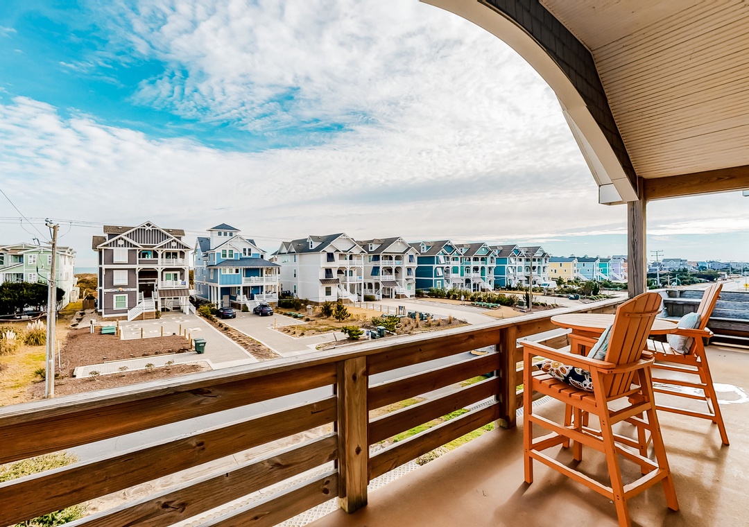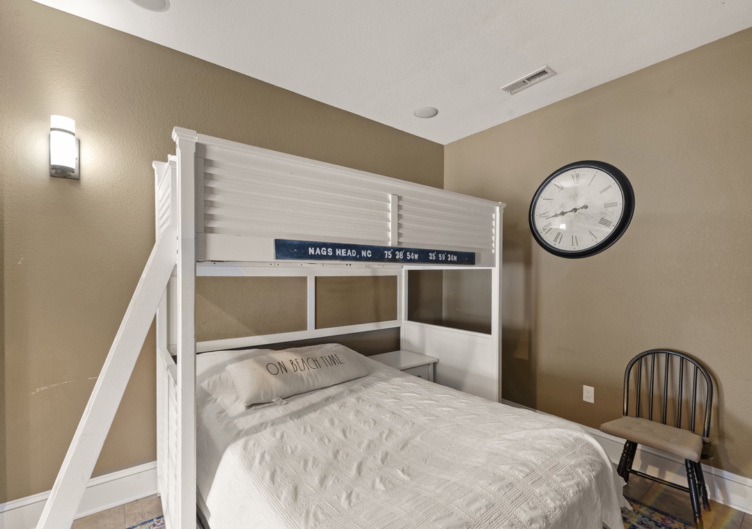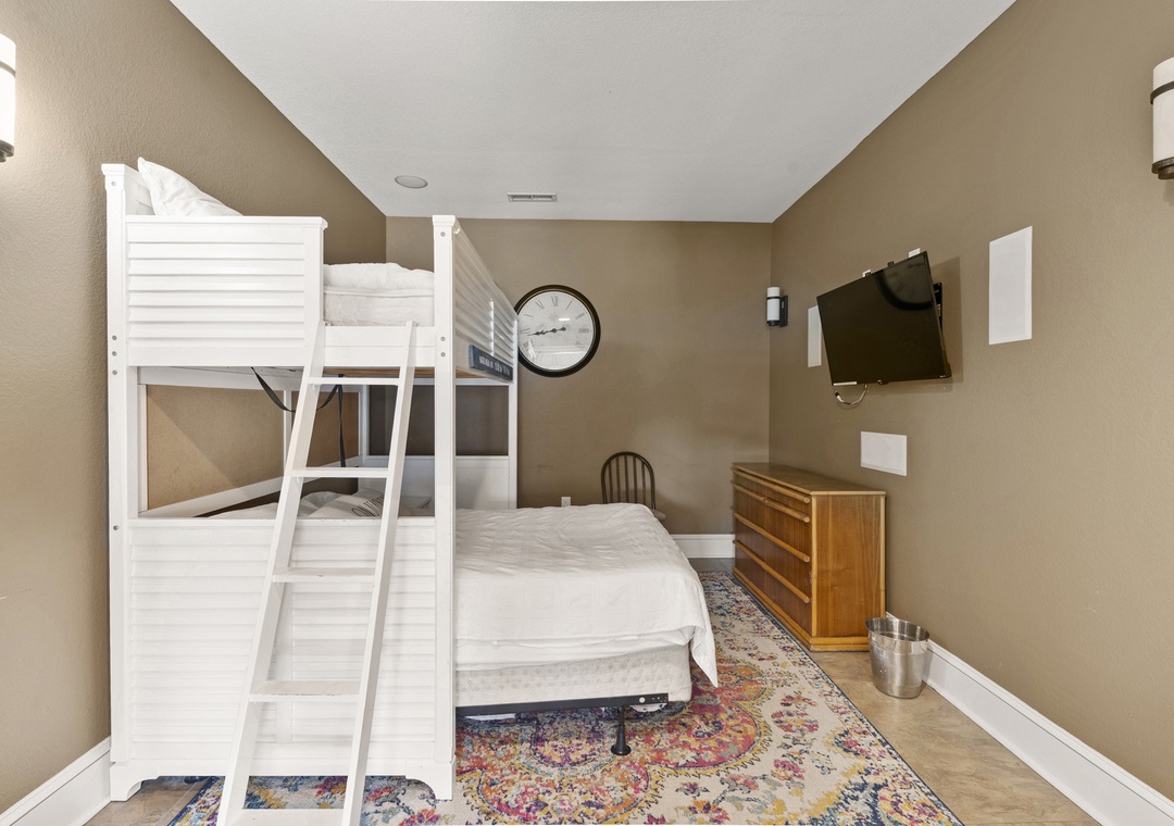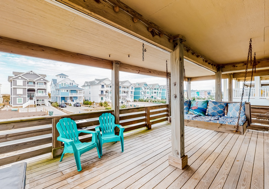 The middle level of the home hosts three bedrooms, each one with an en suite full bathroom and a smart TV with cable. This floor also grants guests access to a covered deck with plenty of seating, including a porch swing and incredible views of the neighboring homes.